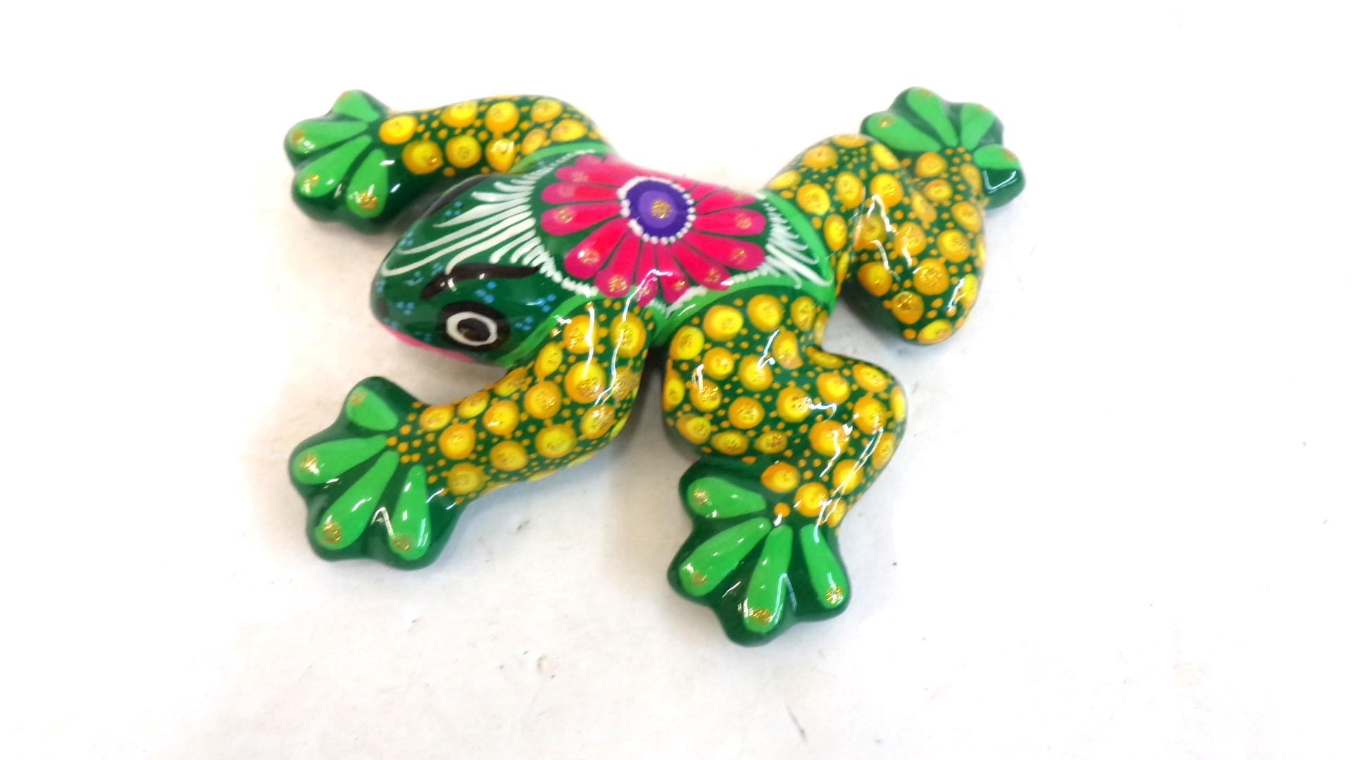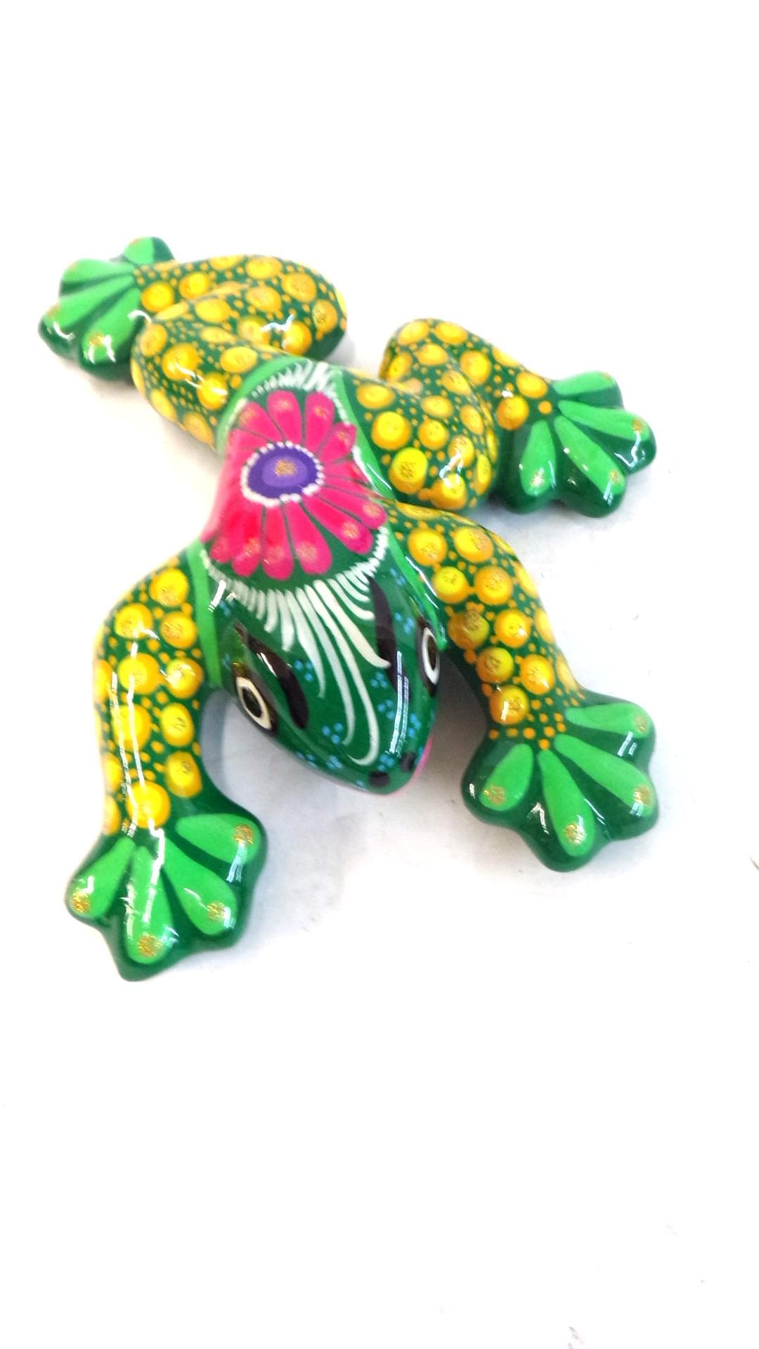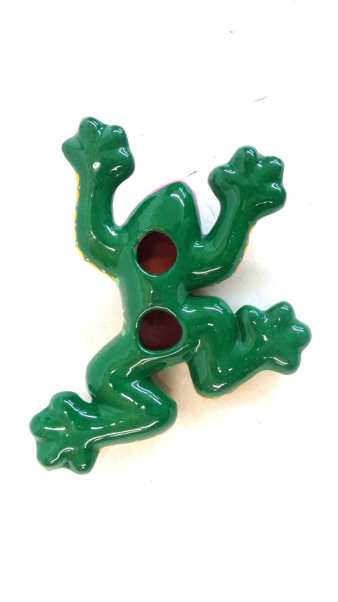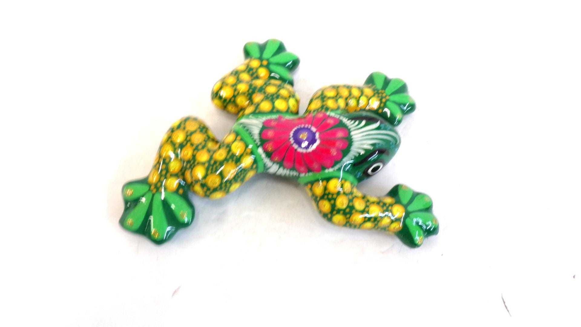 Delightful Hand Painted 6" Frog, Handmade by a Mexico Artisan Family, Easy to Hang if Desired. Free Shipping You will be getting the frog that is actually shown in the pictures above. This item measures roughly 6" by 4 1/2" irregular. This would also make a great gift for a friend or a loved one. So, why ever just gift something ordinary? We will soon have many other and very unique hand painted wall art items to choose from. Shop where so many home and business decorators' shop, right here in our shop. Favorite us now and then keep on checking back with us to see all the new items that we'll be adding. I am not the world's greatest photographer so I may not have the best pictures out there, but my prices certainly are the greatest so WHY EVER PAY MORE?