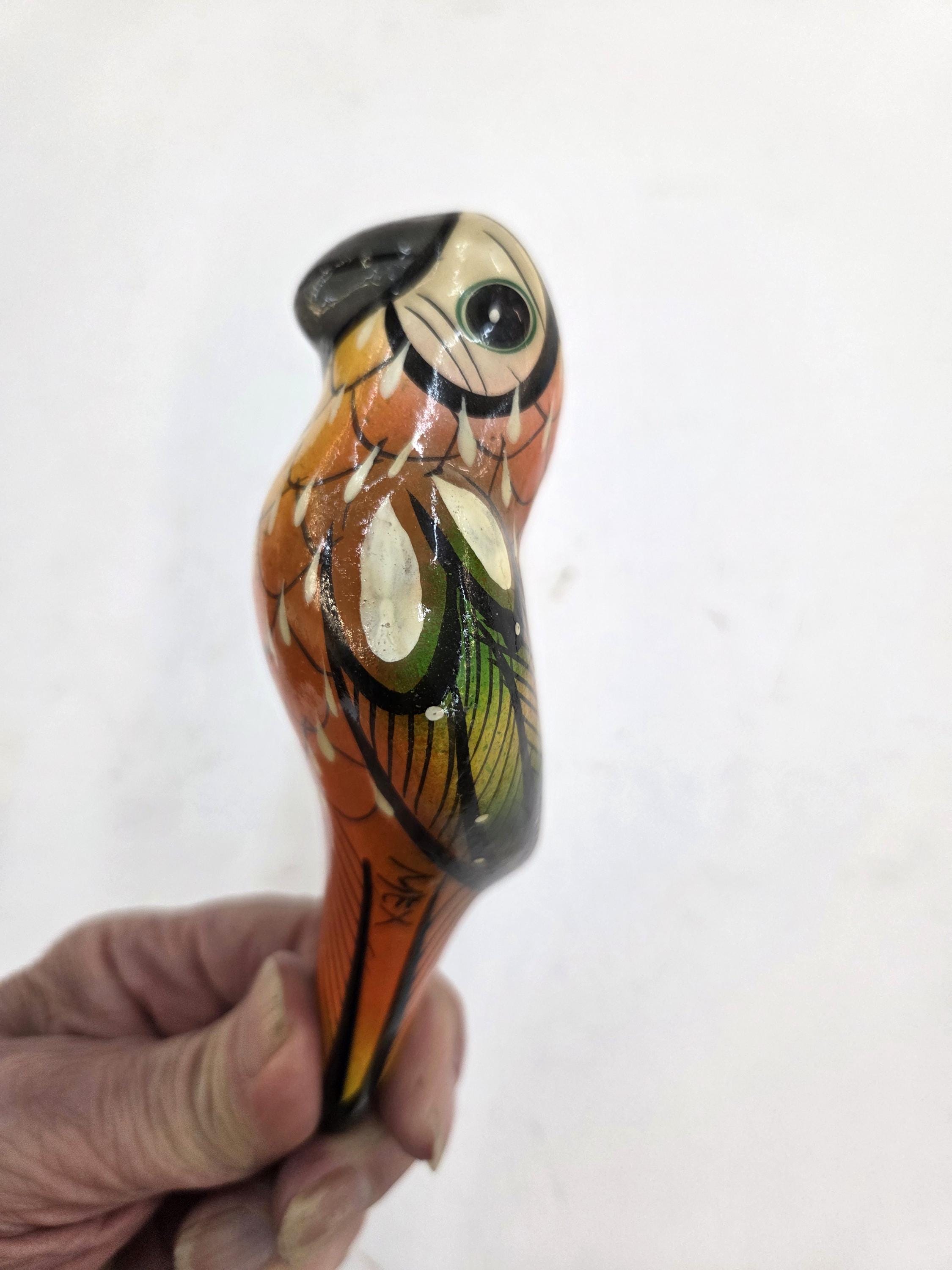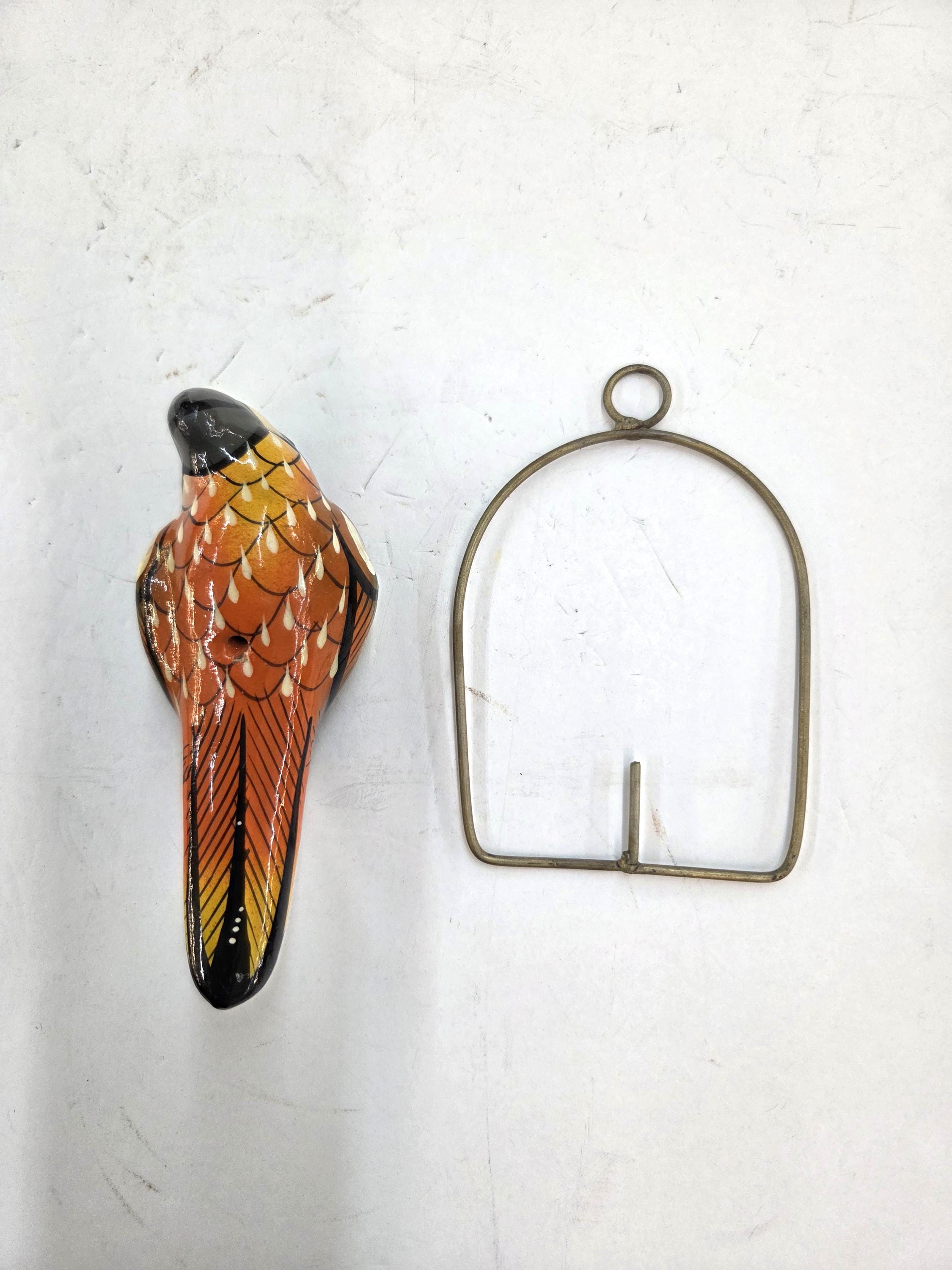 Beautiful 4 3/4" Tall Hanging Parrot on Metal Perch. And, they don't hardly eat anything at all. Handmade, Hand-Painted, Ceramic Pottery Bird Made by Mexico Artisan. You will be getting the parrot as actually shown in our pictures rather than something just kinda like it. Each parrot is handmade by Mexico Artisans and hand-painted, rather than machine made, so sometimes there can be minor flaws, but the overall look is always very beautiful and impressive. This parrot is roughly 5 3/4" tall by 2 1/4" wide irregular, not including the metal perch. We normally have some more parrots of different colors and sizes in our Etsy shop. This would also make a lovely present for a friend or a loved one. I am not the world's greatest photographer so I may not have the best pictures out there, but my prices certainly are the greatest so WHY PAY MORE?