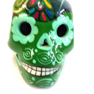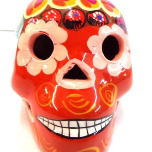 Very Unique and Beautiful Day of the Dead 6.5" Sugar Skull Handcrafted and Hand Painted by Mexico Artisans. Why Pay More? And isn't it better to actually know what you are buying for your money too. Here, you would be buying the actual item that is shown in the pictures above. A customer favorite here in our Yuma store. Shop where so many home decorators' shop, right here in our store! This item is roughly 6 1/2" long" by 5" tall irregular. And he's got lotsa friends that may be in our Etsy shop when and if still available. Each of these are items are handmade by artisans so there can at times be minor imperfections, but the overall look is always quite beautiful. This item would also make a great & unusual gift for a friend or a loved one too so why ever gift something just ordinary?