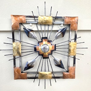Half Moon with Coyote, Kokopelli, & Saguaro Cactus Pop Outs Multicolored 11" Tall Handmade Artisan Metal Wall Art. Free Shipping. Easy to hang with eyelet on the back for screw or nail. In our Yuma store these item sells quite fast. This artisan metal wall art would look so great on the wall in your patio, garden, yard, office, or business. We have lots of wall art items in our Etsy shop. This item measures roughly 11" tall by 10" wide irregular. Handmade items may at times have minor flaws, but the overall look is always quite beautiful. Shop where so many home decorators' shop for unique items. This beautiful item would also make a wonderful and unusual gift for a friend or a loved one. You will actually be getting the item that is shown in the pictures rather than something kinda similar as you often see elsewhere. This would also make a great gift for a friend or a loved one. So, why ever just gift something ordinary? FAVORITE US now and then keep on checking back with us to see all the new items that we'll be adding. I am not the world's greatest photographer so I may not have the best pictures out there, but my prices certainly are the greatest so WHY EVER PAY MORE?