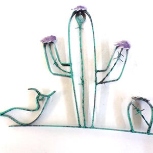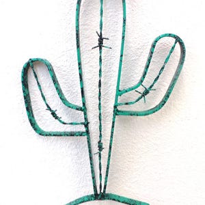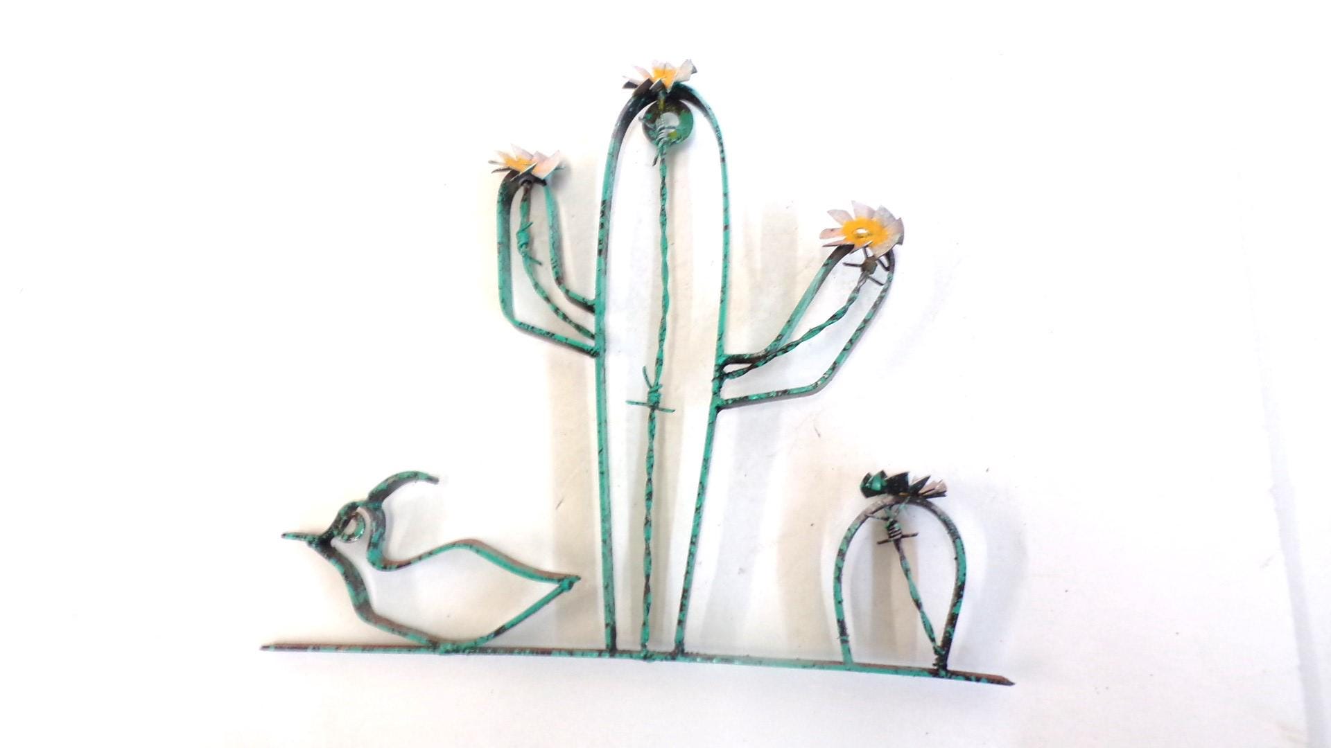 Handmade 11" Hand Painted Barbed Wire Saguaro Cactus with Quail & 3 Flowers Metal Wall Art, Handcrafted by Mexico Artisan Friends. Free Shipping! Easy to hang with a screw or nail. In our Yuma store these item sells quite fast. This artisan metal wall art would look so great on the wall in your patio, garden, yard, office, or restaurant, bar, or business. A real conversation piece. We have lots of wall art items in our Etsy shop. This item measures roughly 11" tall by 12" wide very irregular. Handmade hand painted items may sometimes have minor flaws, but the overall look is always quite beautiful. Shop where so many home decorators' shop for unique items. You will actually be getting the item that is shown in the pictures rather than something kinda similar as you often see elsewhere. This would also make a great gift for a friend or a loved one. So, why ever just gift something ordinary? FAVORITE US now and then keep on checking back with us to see all the new items that we'll be adding. I am not the world's greatest photographer so I may not have the best pictures out there, but my prices certainly are the greatest so WHY EVER PAY MORE?