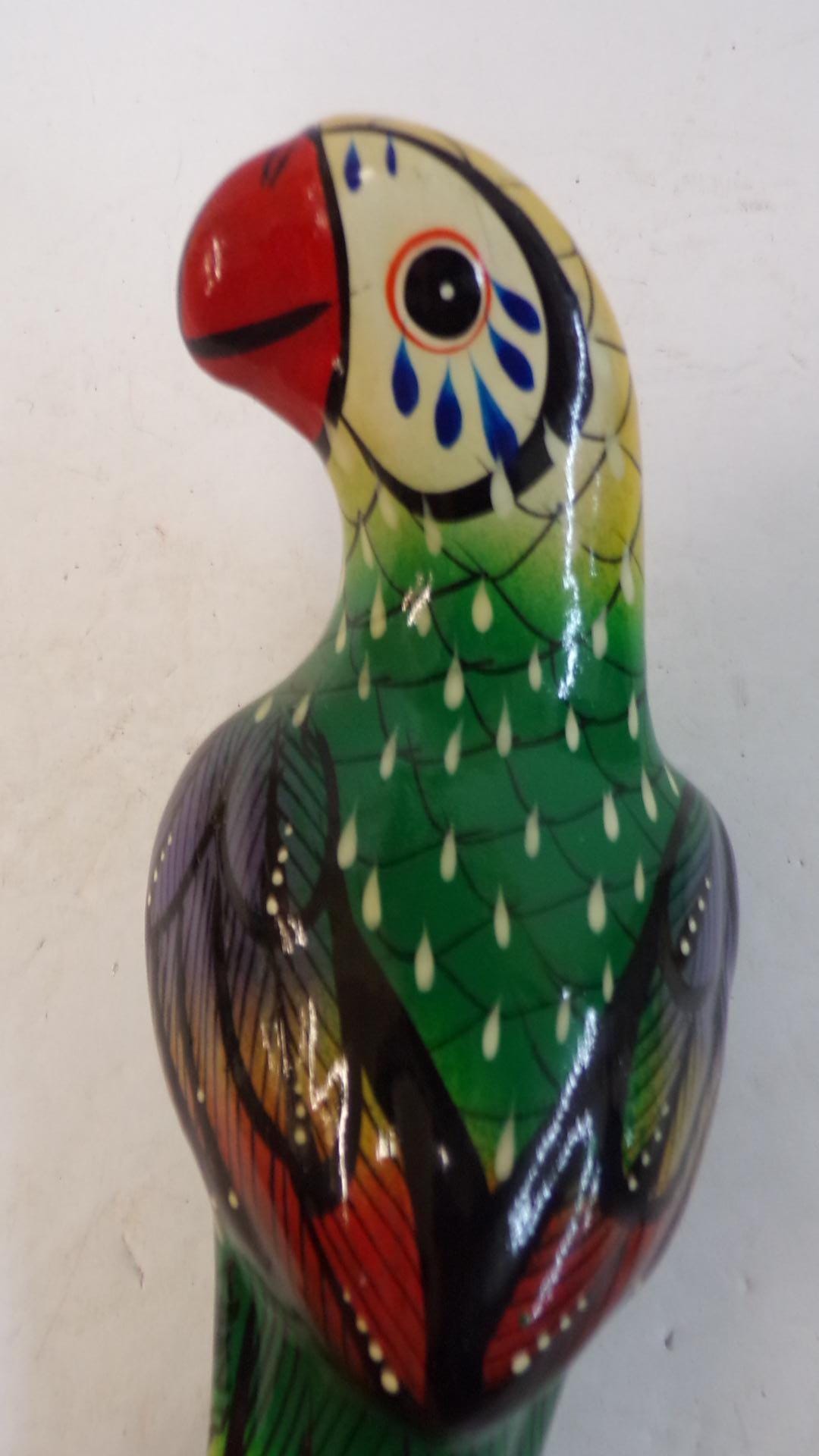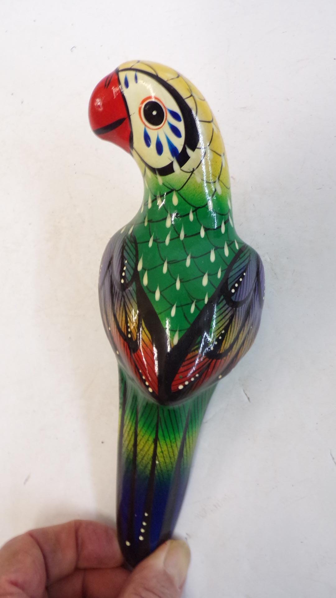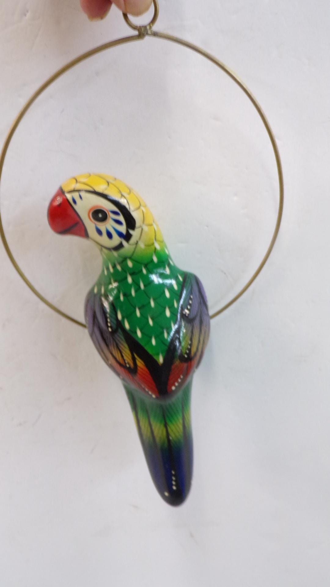 THIS ITEM. Beautiful Hanging Parrot on a Metal Perch. Handmade, Hand-Painted, Ceramic Pottery Parrots Made by a Mexico Artisans. You will be getting the parrot as actually shown in our pictures rather than something just kinda like them. Each parrot is handmade by Mexico Artisans and hand-painted, rather than machine made, so sometimes there can be minor flaws, but the overall look is always very beautiful and impressive. This parrot is roughly 8.5" tall by about 3 1/2" wide irregular, not including the metal perch. We normally have some more parrots in different colors and sizes in our Etsy shop to choose from. This would also make a lovely present for a friend or a loved one. So, why ever gift something just ordinary? Shop where so many home decorators do, right here. I am not the world's greatest photographer so I may not have the best pictures out there, but my prices certainly are the greatest so WHY PAY MORE?