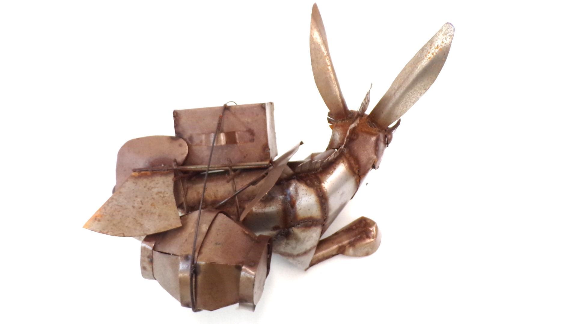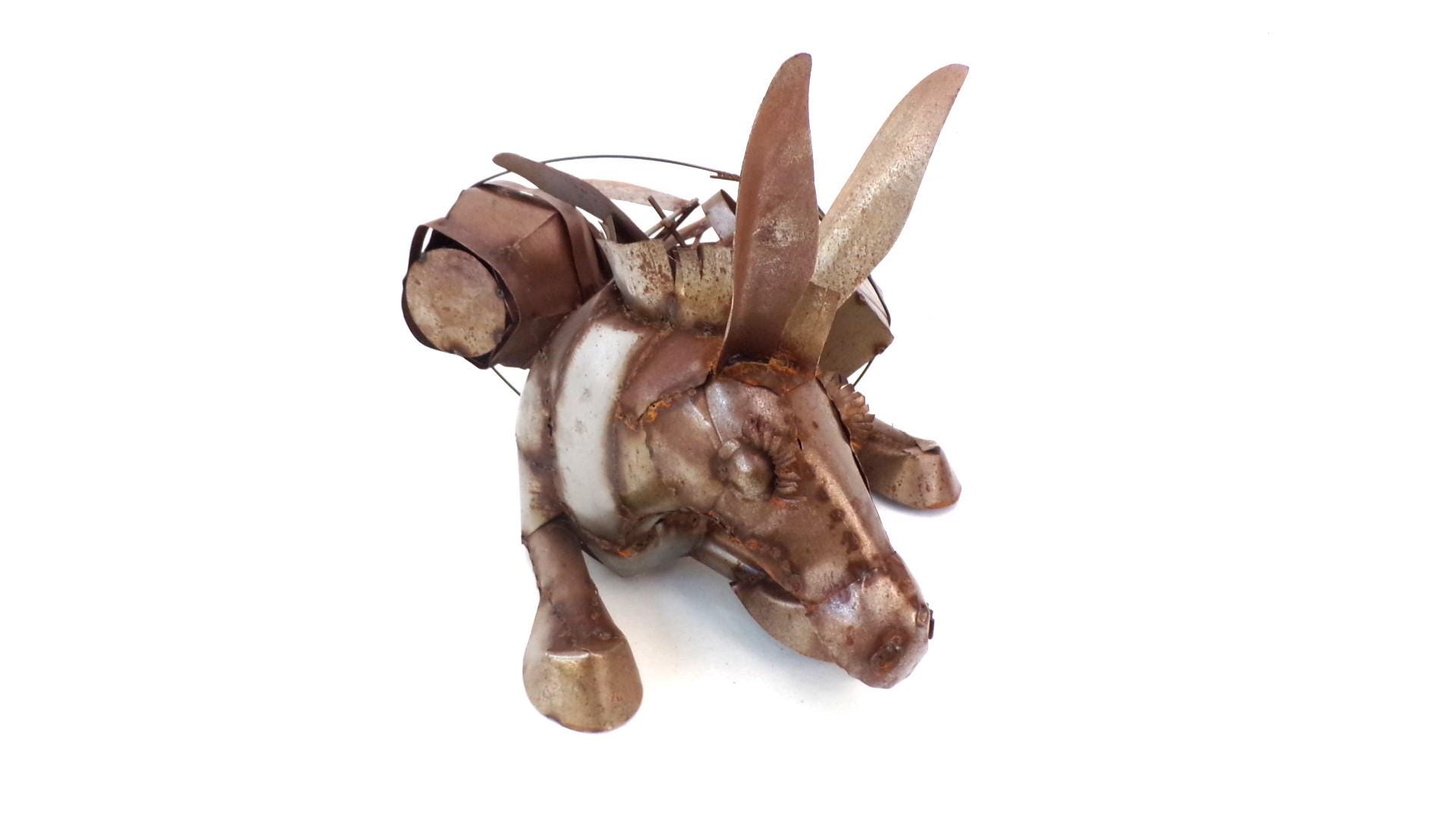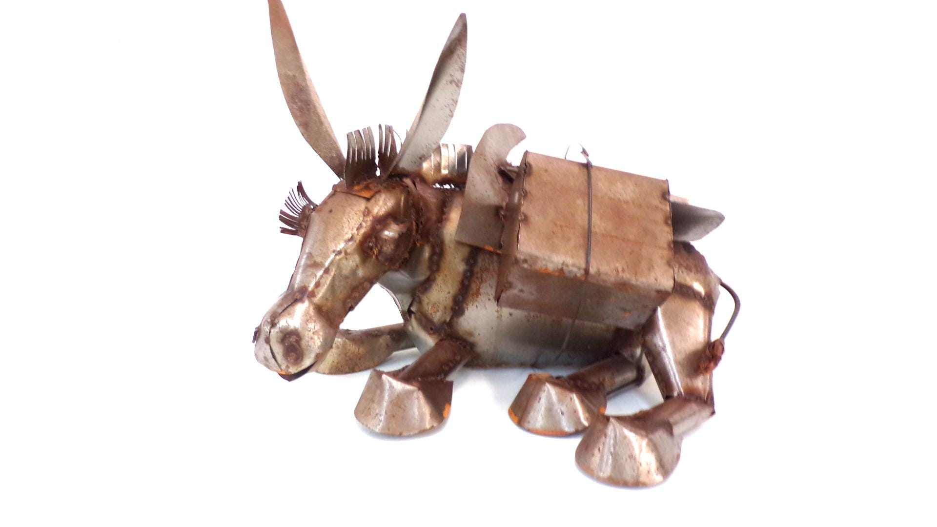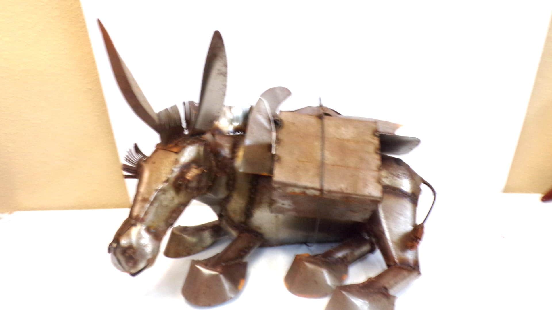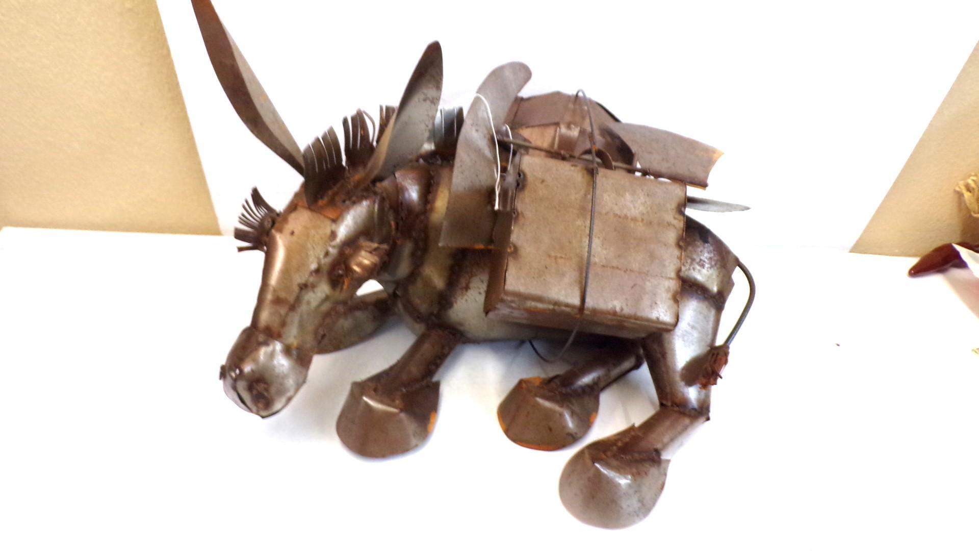 Handmade Rustic Large 19.5" Wide Burro Donkey Scrap Metal Slightly Rusted Yard Art Decor by Mexico Metal Artisan Friend. One of a kind. There may be a rustic miner if still available in our shop too. Won't last long between our online sales and our Yuma store customers. Free Shipping. Quite a conversation piece and kids luv' him. A customer favorite here in our Yuma store. This would look so great in your bar area or patio. This item is roughly 15" tall by 19 1/2" wide irregular. You will be getting the item actually shown in the pictures. Each of these are items are handmade by artisans so there can at times be minor imperfections, but the overall look is quite beautiful. This item would make a great & unusual gift for a friend or a loved one too. Why just gift something ordinary? I am not the world's greatest photographer so I may not have the best pictures out there, but my prices certainly are the greatest so WHY EVER PAY MORE?