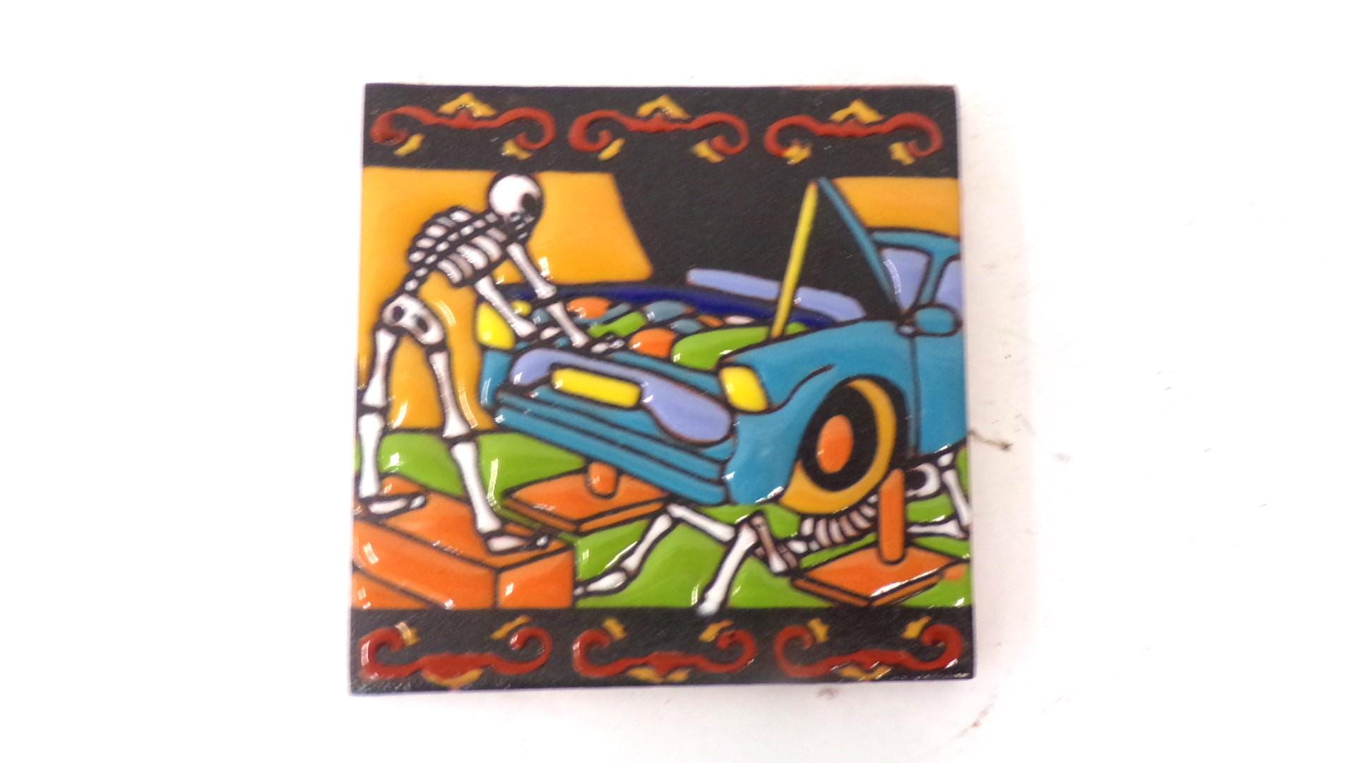 Handmade Hand Painted 2 Car Mechanics Blue Car Talavera 4.25" Artisan Raised Relief Mexican Colorful Counter Décor. These are what they call high relief tiles meaning that they have a raised texture design that you can feel projecting above the standard flat background. These aren't the cheap flat smaller tiles that you may see elsewhere. They measure ROUGHLY 4 1/4" by 4 1/4" by 5/16" but can vary just a dink as all of them are handmade rather than being mass produced in a factory. They would make a great gift for a friend or a loved one. So, why gift something just ordinary? There can be minor imperfections because they are actually handmade but the overall look is always quite beautiful. If you should need more tiles than I show in stock currently just message me through Etsy and I may have more in my store stock. These tiles would be excellent to use as a kitchen/bathroom backsplash or anything else that you might dream of. Home decorators, tile contractors, crafters, bars, & restaurants have found many different ways to use these tiles for eye catching presentations or decorations. Crafter's often use them to make awesome jewelry or fancy boxes. Personally we also use them as drink coasters all over the house and office. We have different styles of Talavera kitchenware & Many Other Beautiful Talavera items in our shop to pick from, and we are always striving to give you the Very Best Pricing on all of our products as possible. Favorite us now and then keep on checking back with us to see all the new items that we'll be adding. I am not the world's greatest photographer so I may not have the best pictures out there but my prices certainly are the greatest. FREE SHIPPING!! If you really need to touch bases with me than I suggest emailing or texting me as I am often out of the range of phone towers when I'm in Mexico so expect that it might be a couple of days before you hear back from me. WHY PAY MORE?