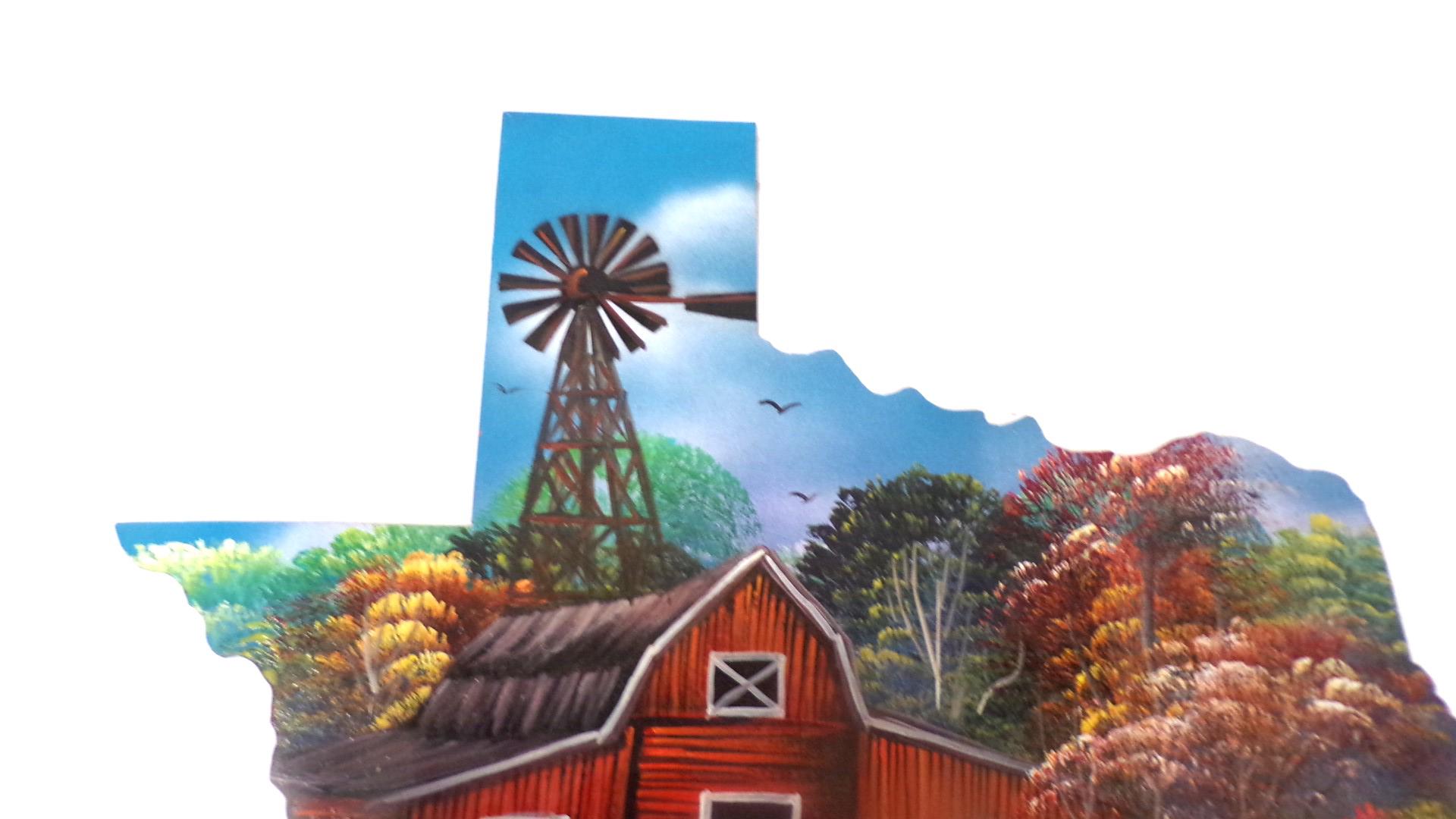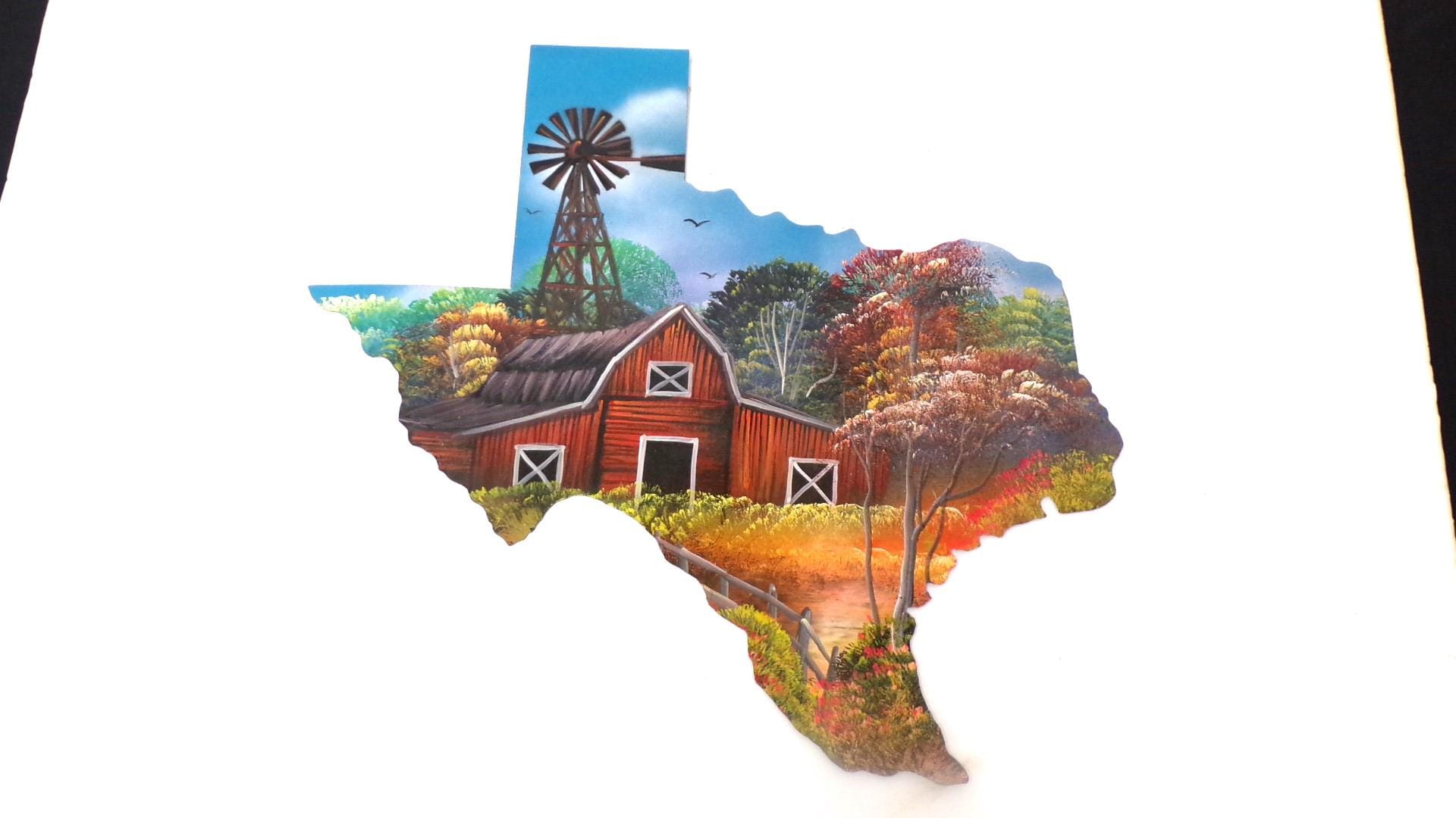 Laser Texas State Cut Out Hand Painted Original Metal Art as Pictured with Barn, Windmill, Trees, Fence, & Birds. FREE SHIPPING! Painted by a good artist friend in Mexico. Rough irregular size 15" tall by 16 1/2" wide. You will be getting the one-sided painted metal art that is actually shown in the pictures above. Handmade hand painted items may sometimes have minor flaws, but the overall look is always quite beautiful. This would make a great gift for a friend or a loved one. So, why ever just gift something ordinary? Shop where so many home and business decorators come to find unique often one-of-a-kind items. We will soon have many different types and styles of painted saws and other beautiful hand painted art items to choose from. Favorite us now and then keep on checking back with us to see all the new items that we'll be adding. I am not the world's greatest photographer so I may not have the best pictures out there, but my prices certainly are the greatest so WHY EVER PAY MORE?