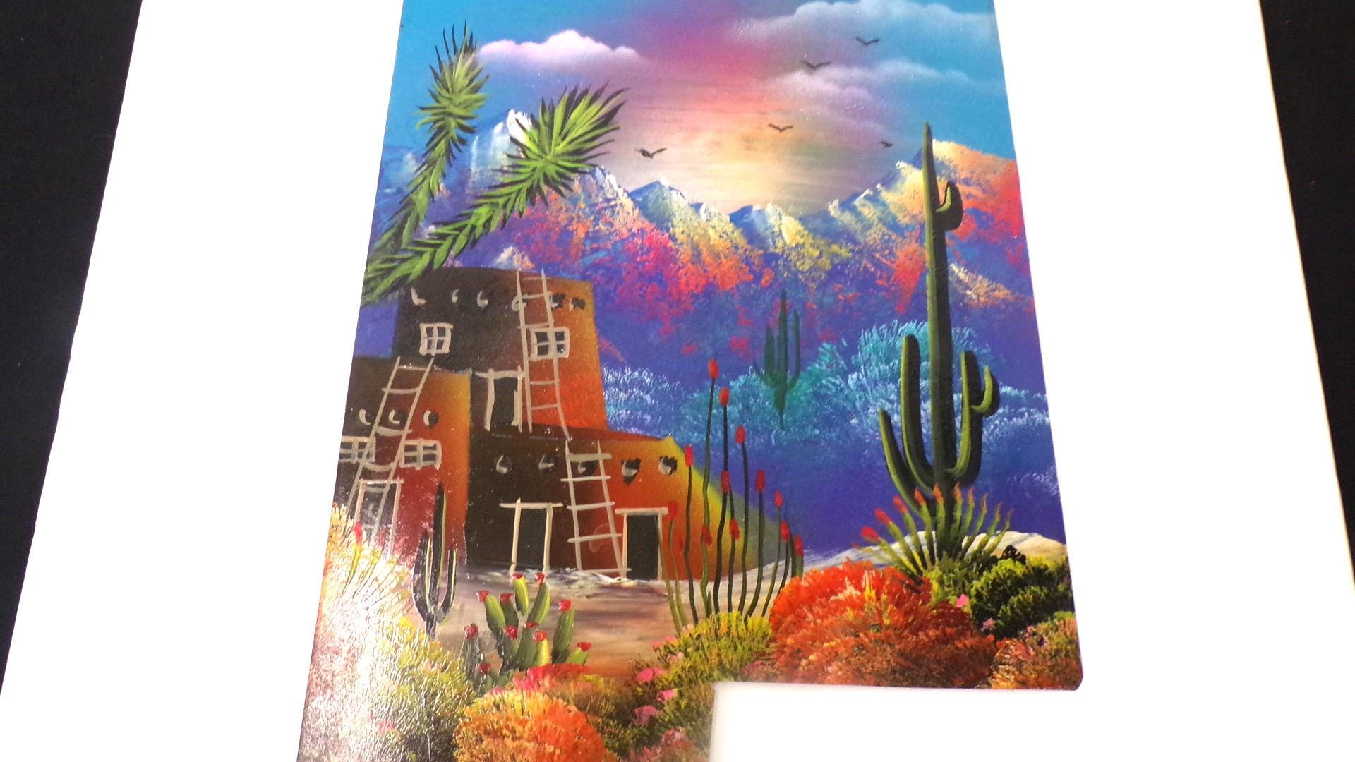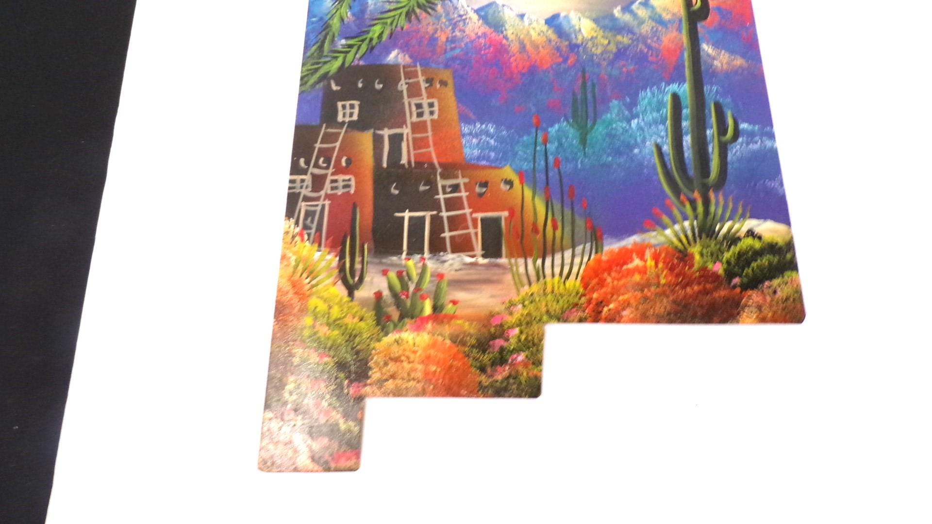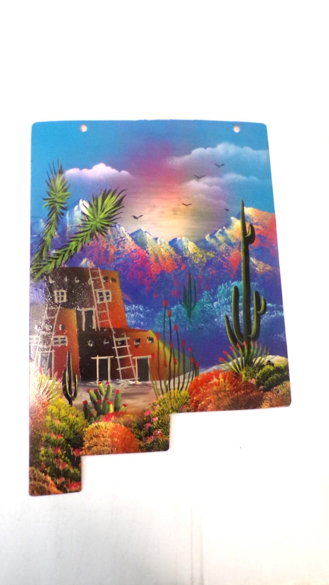 Laser New Mexico State Cut Out Hand Painted Original 16" Metal Art as Pictured with Pueblo, Mountains, Saguaro, Ocotillo, & Birds. You will be getting the one-sided painted metal art that is actually shown in the pictures above. Roughly 16" tall by 11" wide irregular. Handmade hand painted items may sometimes have minor flaws, but the overall look is always quite beautiful. This would make a great gift for a friend or a loved one. So, why ever just gift something ordinary? Shop where so many home and business decorators come to find unique often one-of-a-kind items. We will soon have many different types and styles of painted saws and other beautiful hand painted art items to choose from. Favorite us now and then keep on checking back with us to see all the new items that we'll be adding. I am not the world's greatest photographer so I may not have the best pictures out there, but my prices certainly are the greatest so WHY EVER PAY MORE?
