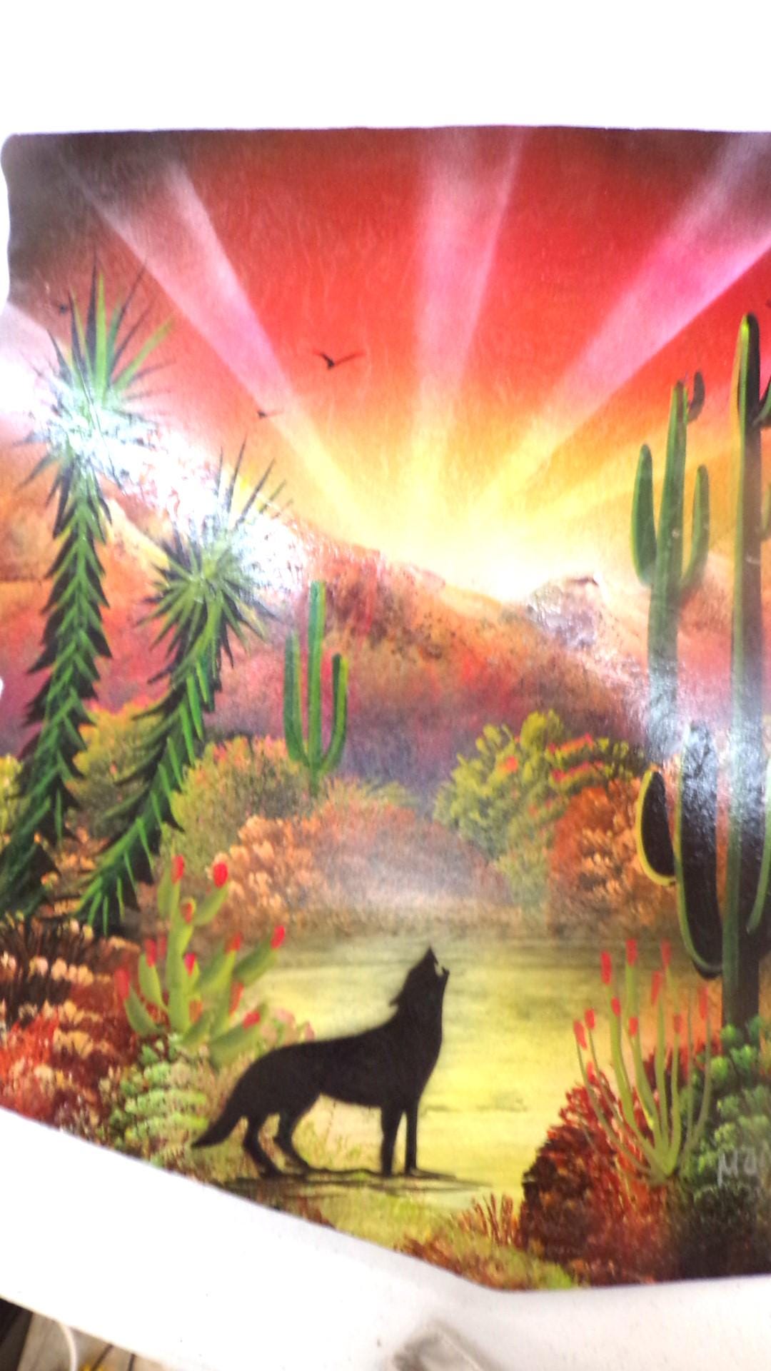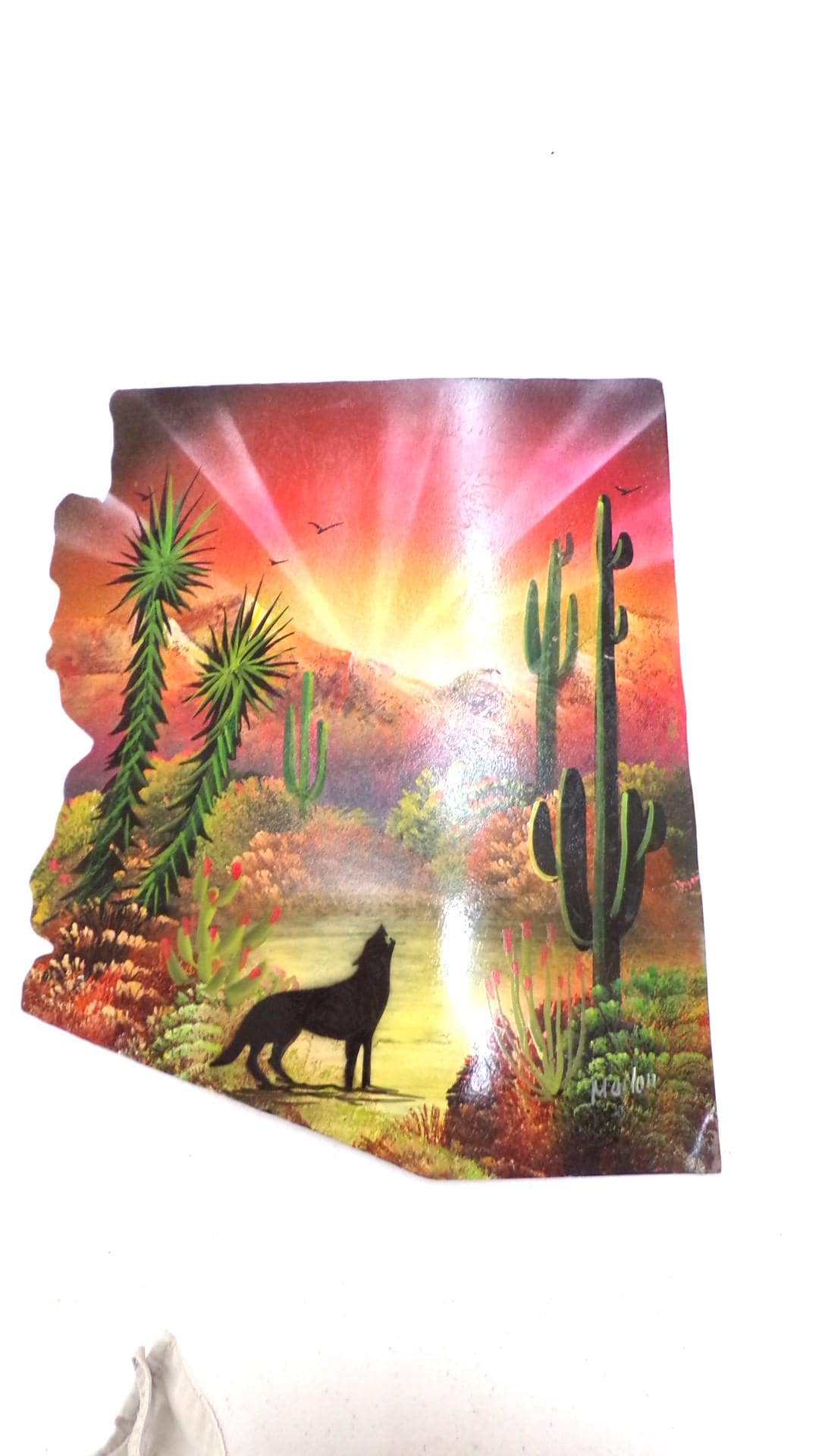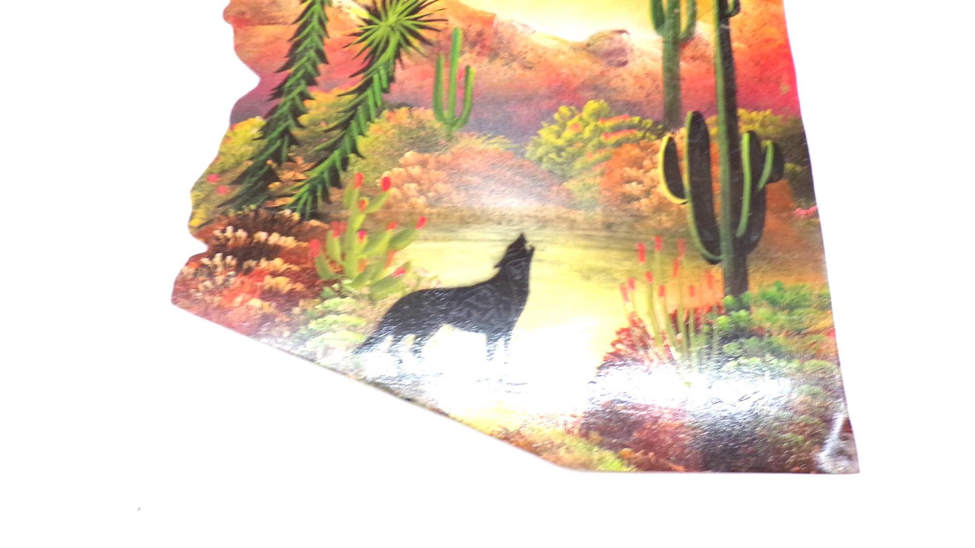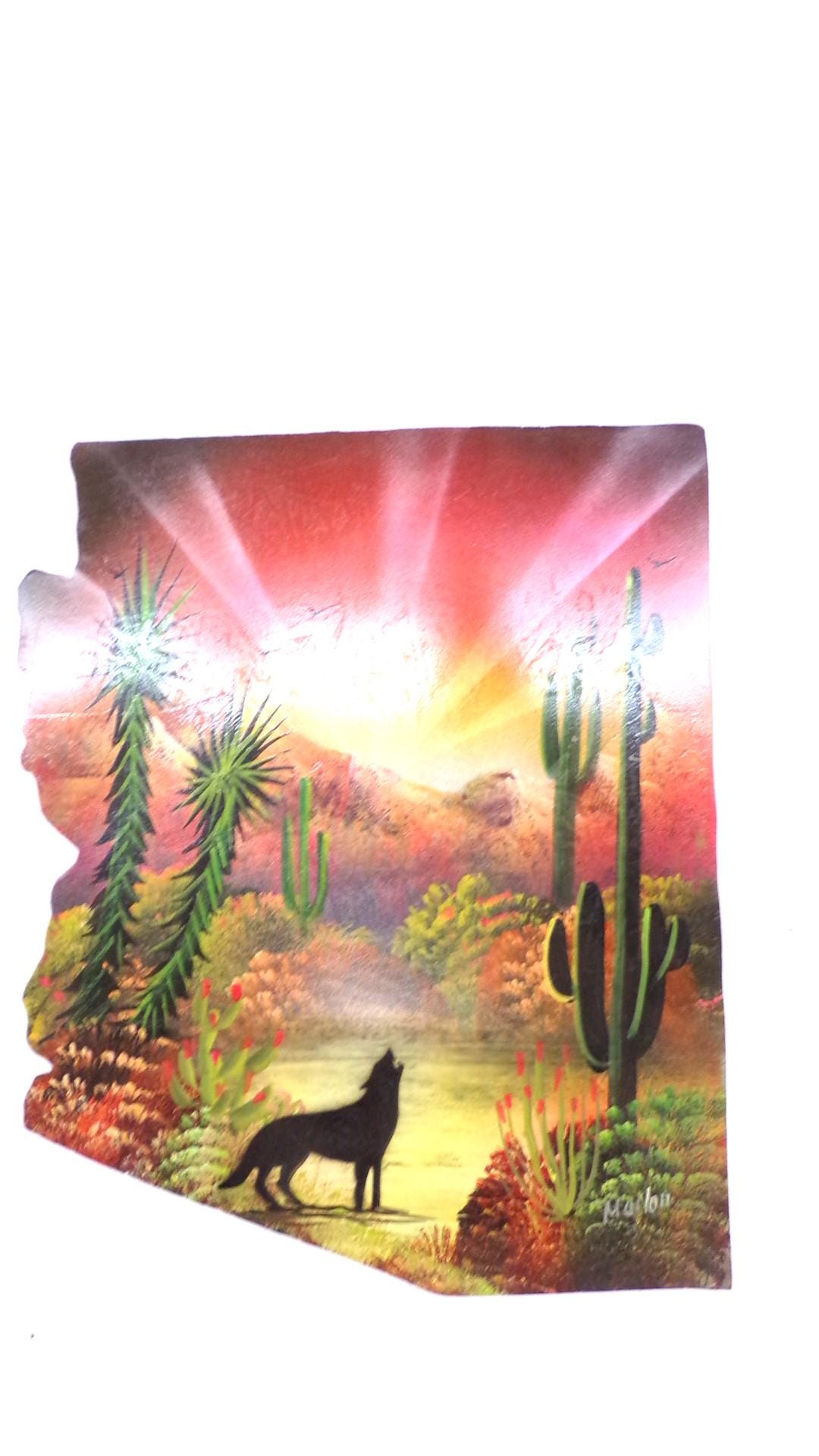Laser Arizona State Cut Out Hand Painted Original 15" Metal Art as Pictured with Coyote, Mountains, Saguaro, Ocotillo, & Birds. You will be getting the one-sided painted metal art that is actually shown in the pictures above. Roughly 15" tall by 12" wide irregular. Handmade hand painted items may sometimes have minor flaws, but the overall look is always quite beautiful. This would make a great gift for a friend or a loved one. So, why ever just gift something ordinary? Shop where so many home and business decorators come to find unique often one-of-a-kind items. We will soon have many different types and styles of painted saws and other beautiful hand painted art items to choose from. Favorite us now and then keep on checking back with us to see all the new items that we'll be adding. I am not the world's greatest photographer so I may not have the best pictures out there, but my prices certainly are the greatest so WHY EVER PAY MORE?