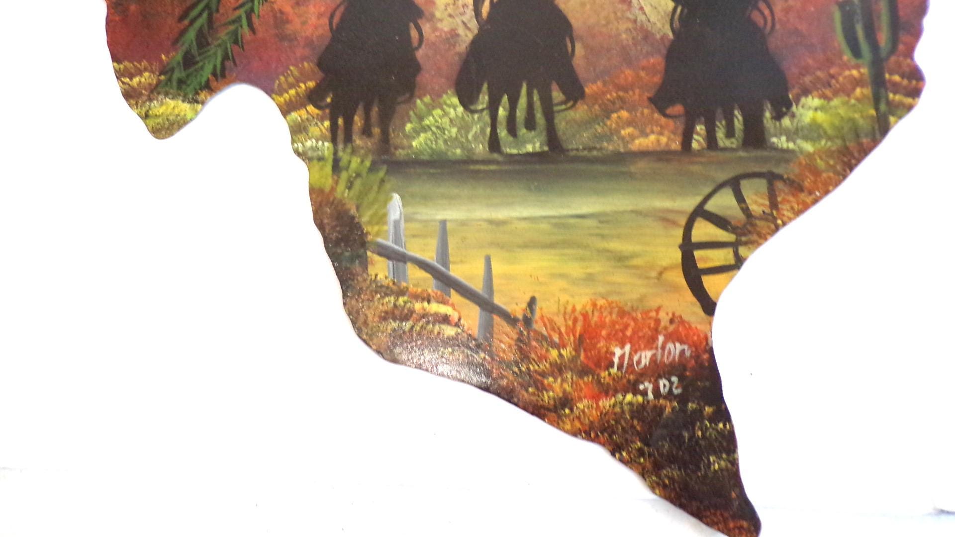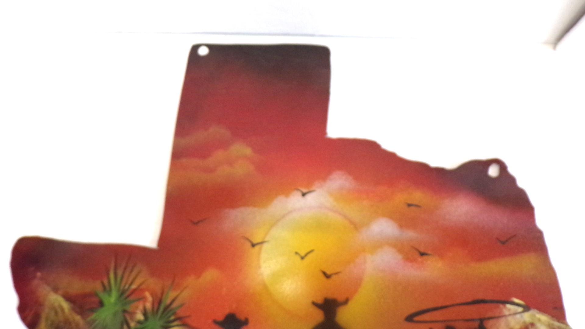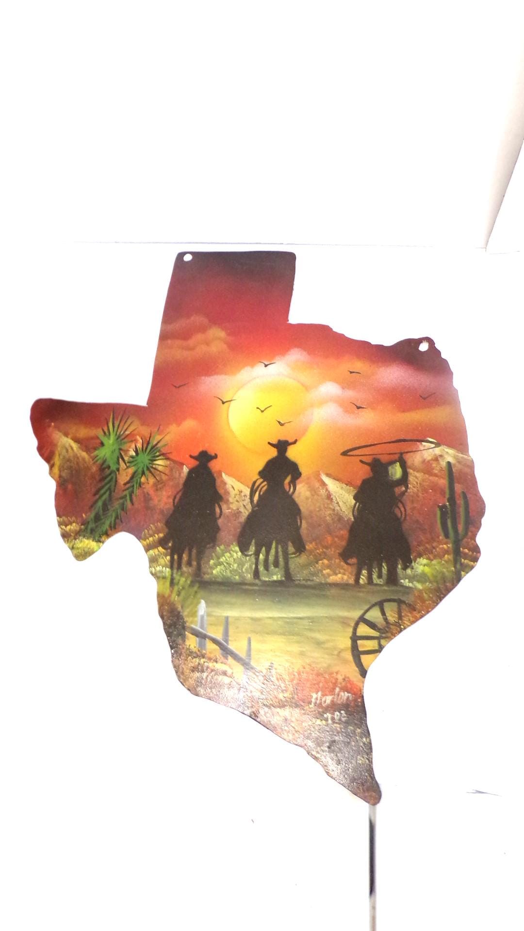 Laser Texas State Cut Out Hand Painted Original 17 1/4" Metal Art as Pictured with 3 Cowboys, Cactus, Fence, & Birds. Free Shipping! FREE SHIPPING! Painted by a good artist friend in Mexico. Rough irregular size 17 1/4" tall by 14" wide. You will be getting the one-sided painted metal art that is actually shown in the pictures above. Handmade hand painted items may sometimes have minor flaws, but the overall look is always quite beautiful. This would make a great gift for a friend or a loved one. So, why ever just gift something ordinary? Shop where so many home and business decorators come to find unique often one-of-a-kind items. We will soon have many different types and styles of painted saws and other beautiful hand painted art items to choose from. Favorite us now and then keep on checking back with us to see all the new items that we'll be adding. I am not the world's greatest photographer so I may not have the best pictures out there, but my prices certainly are the greatest so WHY EVER PAY MORE?