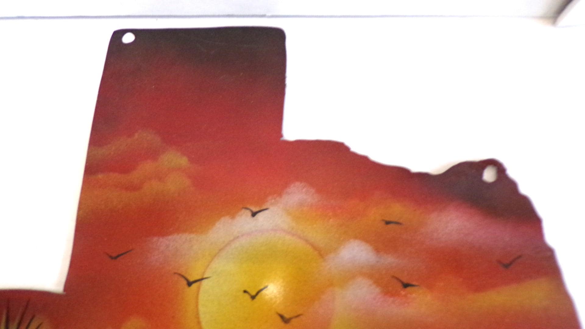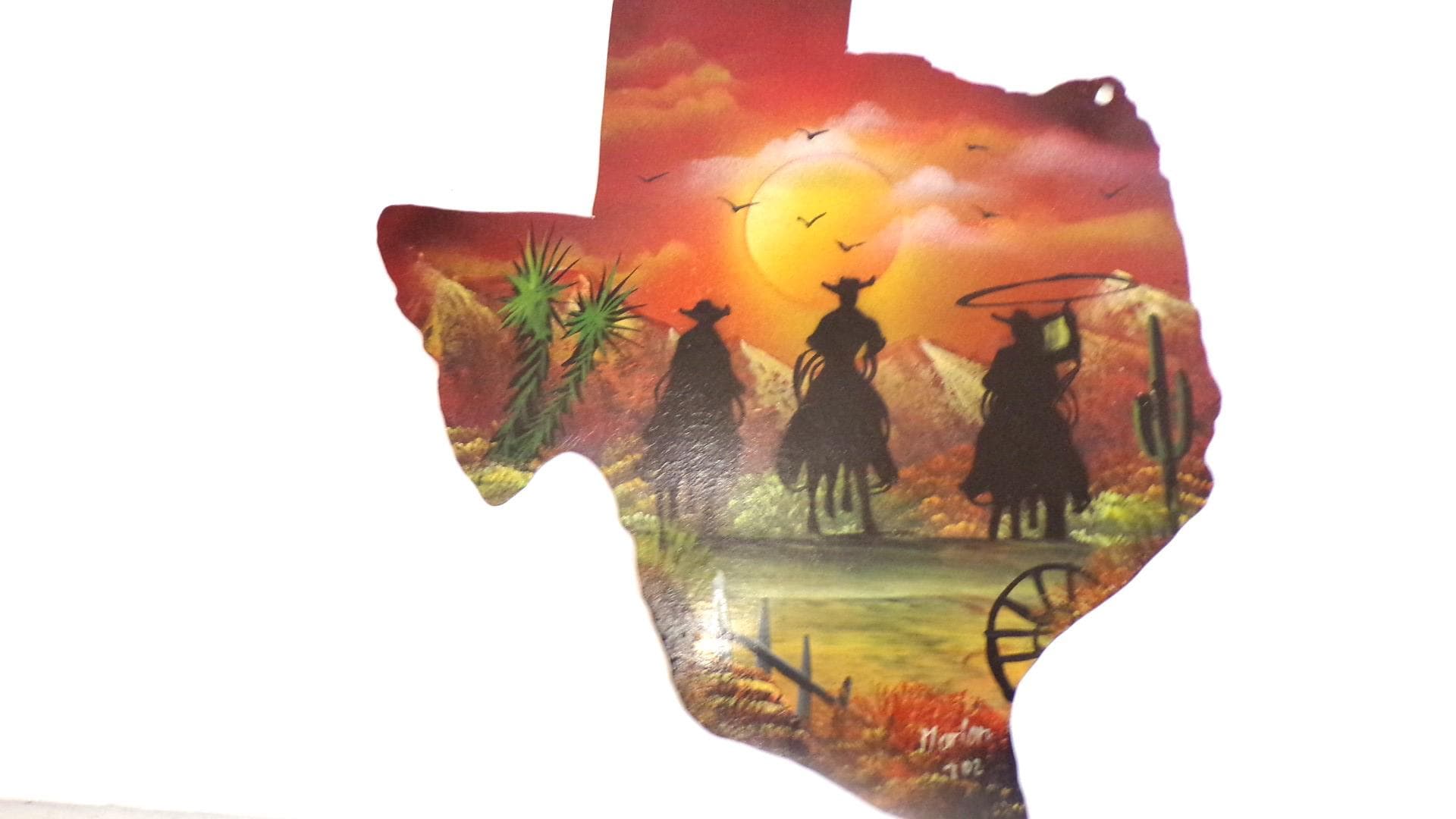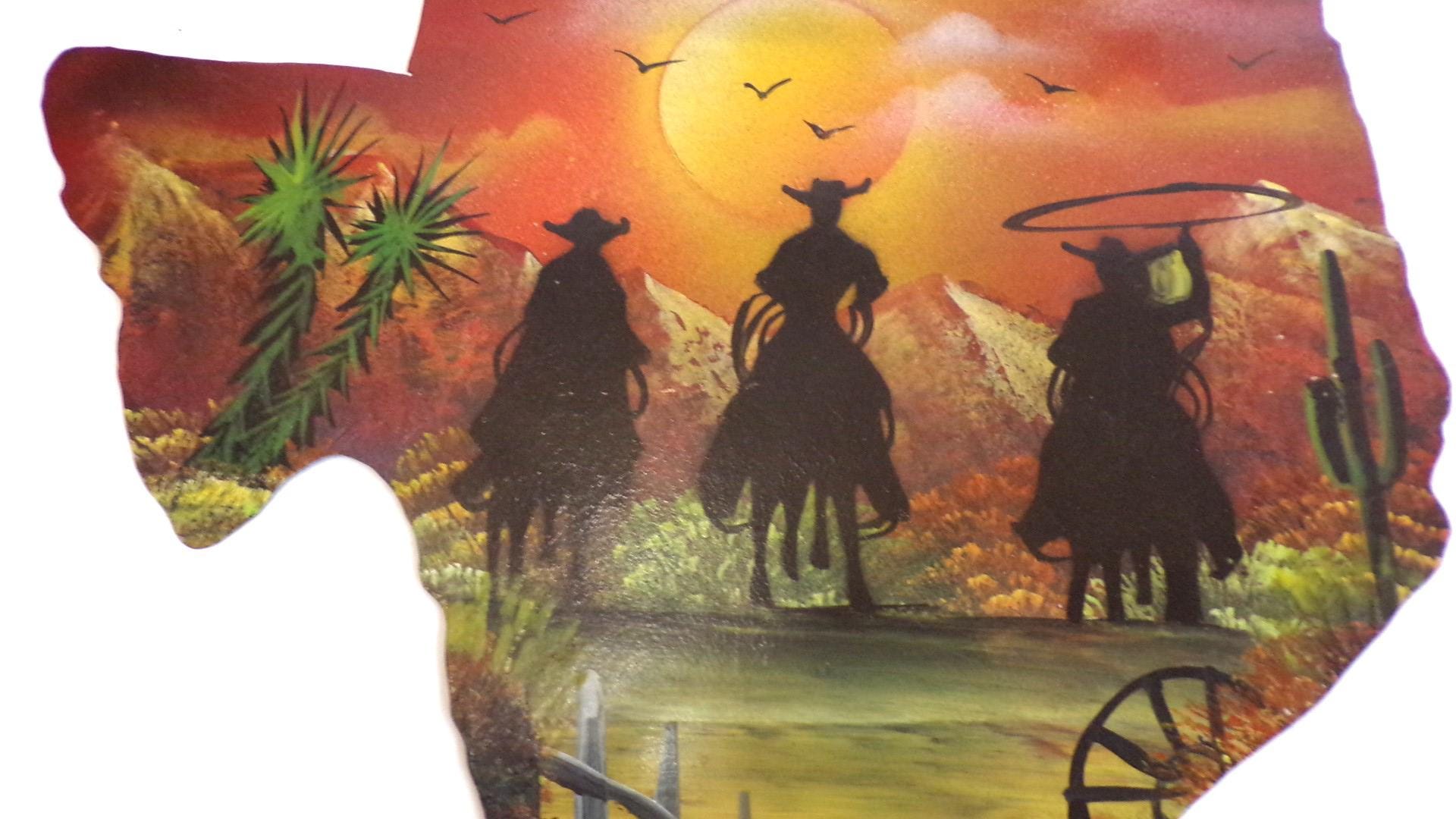 Laser Texas State Cut Out Hand Painted Original 17 1/4" Metal Art as Pictured with 3 Cowboys, Cactus, Fence, & Birds. Free Shipping! FREE SHIPPING! Painted by a good artist friend in Mexico. Rough irregular size 17 1/4" tall by 14" wide. You will be getting the one-sided painted metal art that is actually shown in the pictures above. Handmade hand painted items may sometimes have minor flaws, but the overall look is always quite beautiful. This would make a great gift for a friend or a loved one. So, why ever just gift something ordinary? Shop where so many home and business decorators come to find unique often one-of-a-kind items. We will soon have many different types and styles of painted saws and other beautiful hand painted art items to choose from. Favorite us now and then keep on checking back with us to see all the new items that we'll be adding. I am not the world's greatest photographer so I may not have the best pictures out there, but my prices certainly are the greatest so WHY EVER PAY MORE?