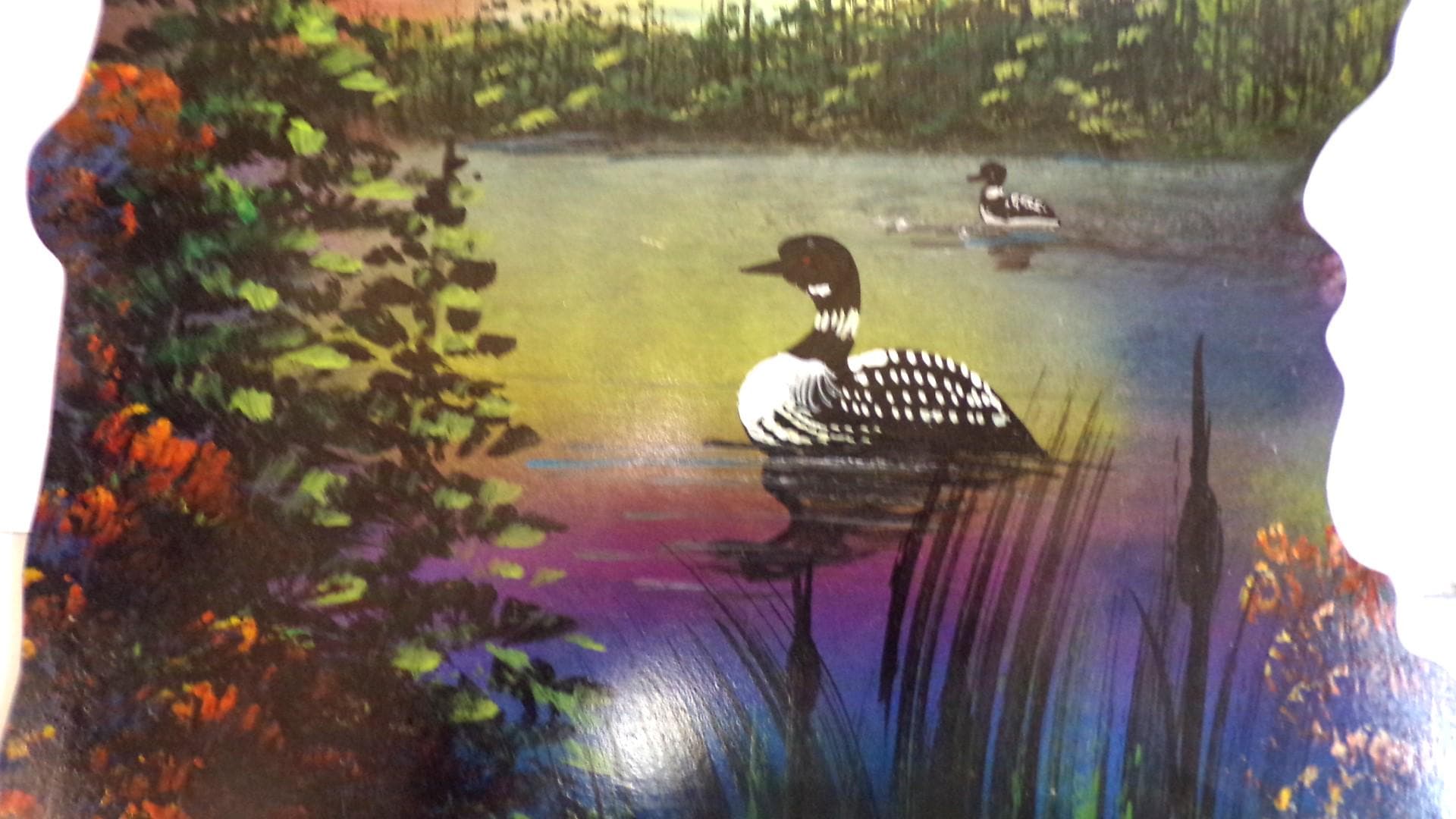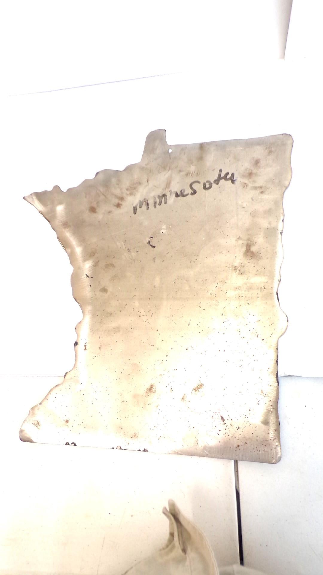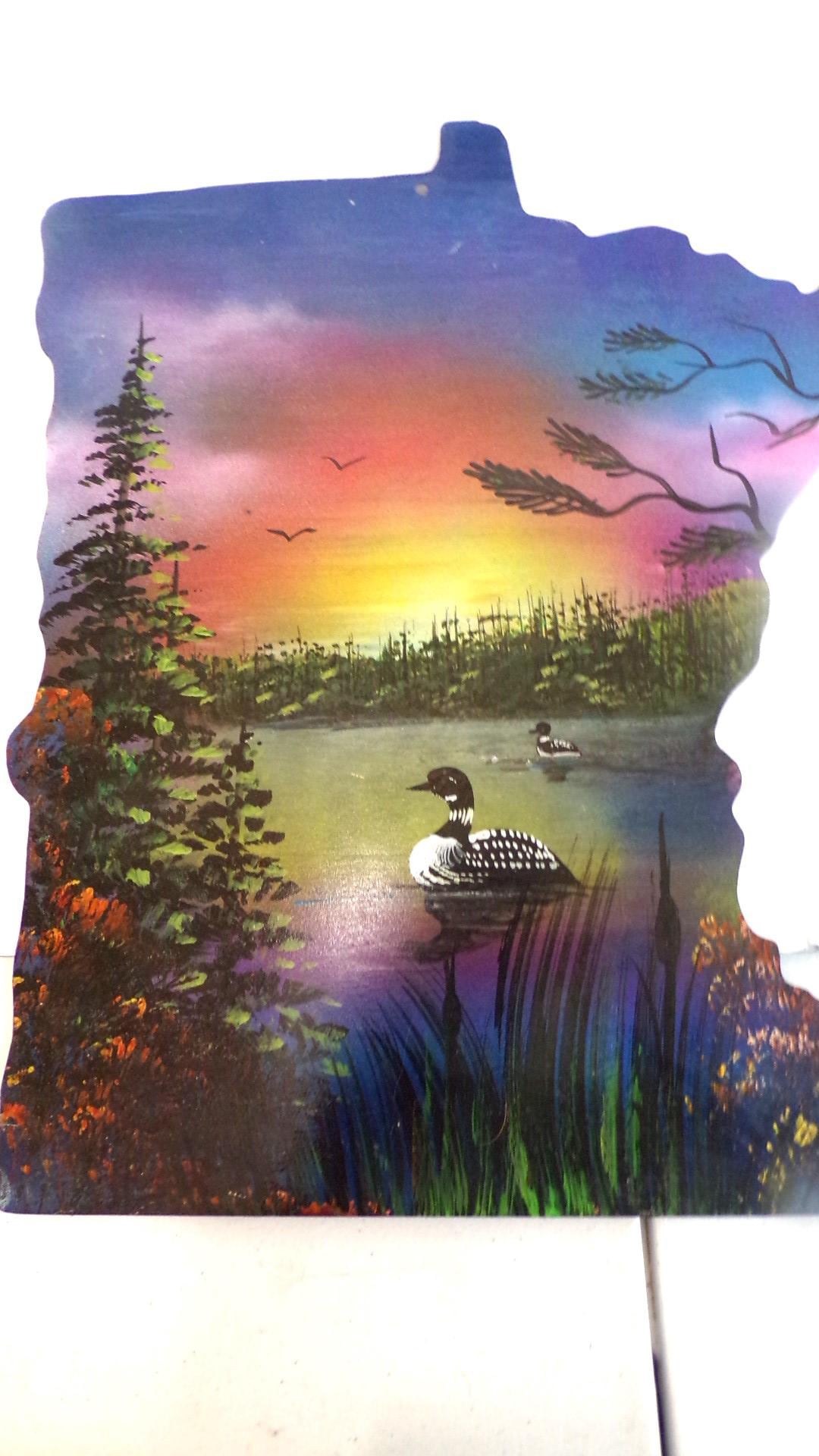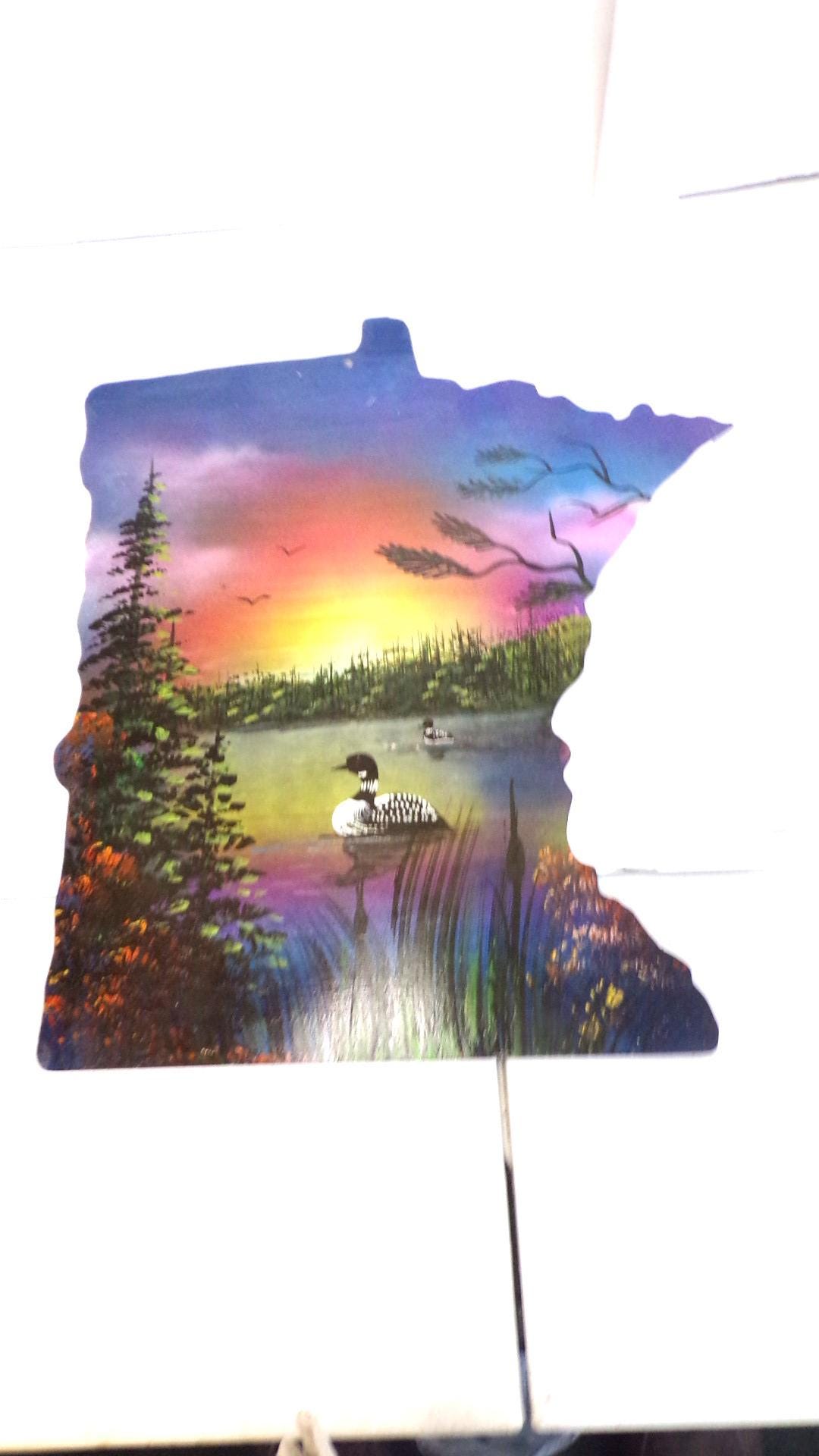 Laser Minnesota State Cut Out Hand Painted Original 16 1/2" Metal Art as Pictured with Loons, Lake, Forest, River, Reeds, & Birds. You will be getting the one-sided painted metal art that is actually shown in the pictures above. Roughly 16 1/2" tall by 14 1/2" wide irregular. Handmade hand painted items may sometimes have minor flaws, but the overall look is always quite beautiful. This would make a great gift for a friend or a loved one. So, why ever just gift something ordinary? Shop where so many home and business decorators come to find unique often one-of-a-kind items. We will soon have many different types and styles of painted saws and other beautiful hand painted art items to choose from. Favorite us now and then keep on checking back with us to see all the new items that we'll be adding. I am not the world's greatest photographer so I may not have the best pictures out there, but my prices certainly are the greatest so WHY EVER PAY MORE?