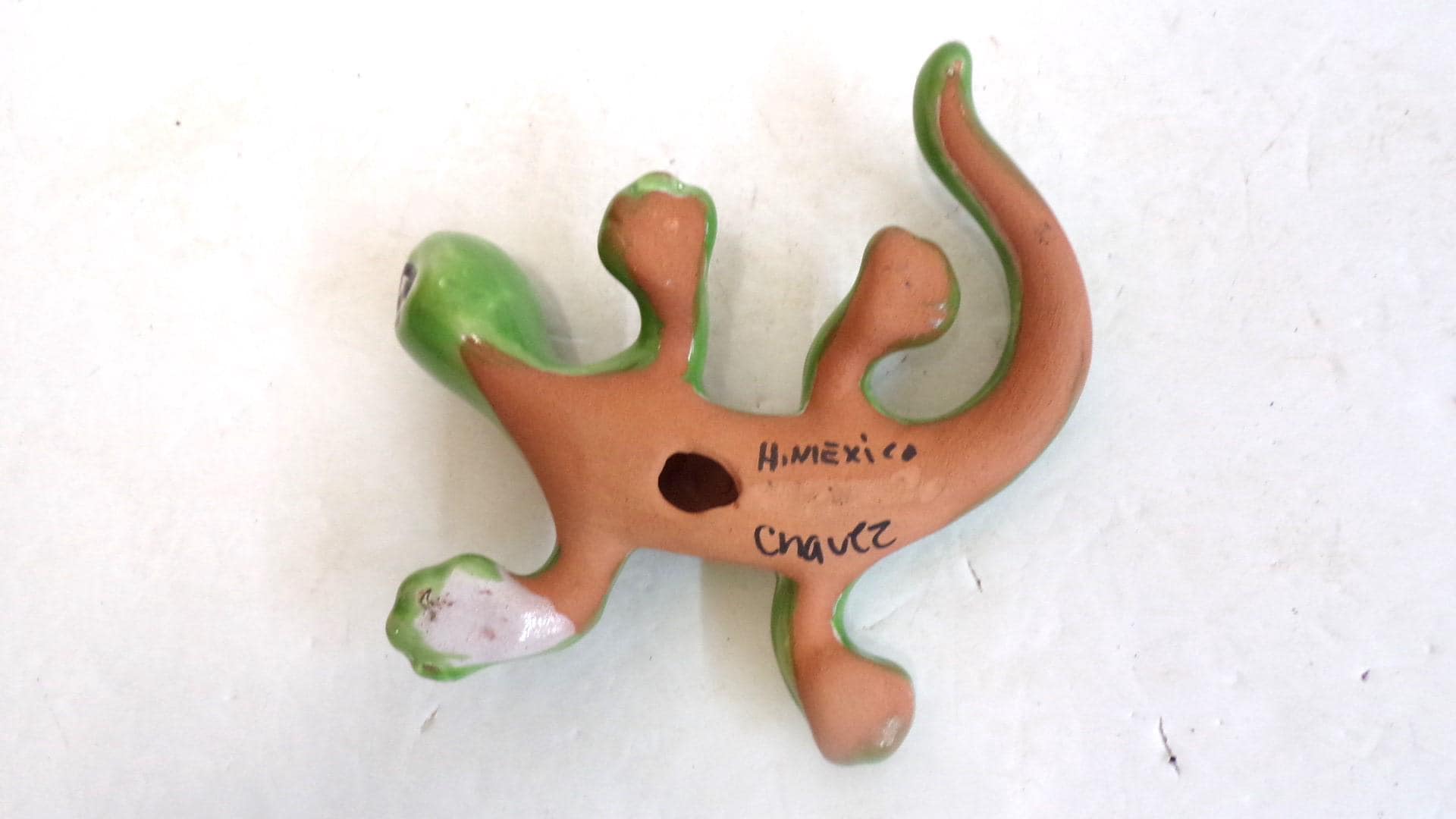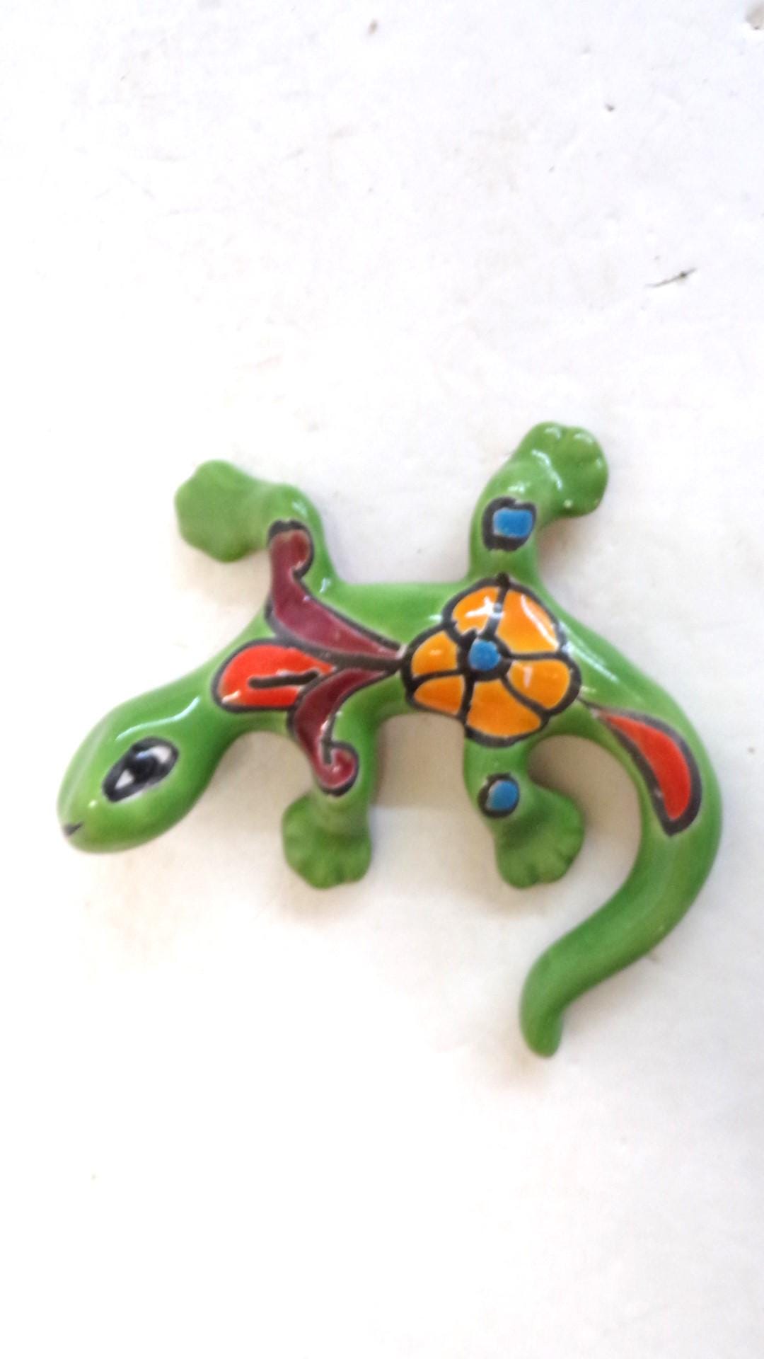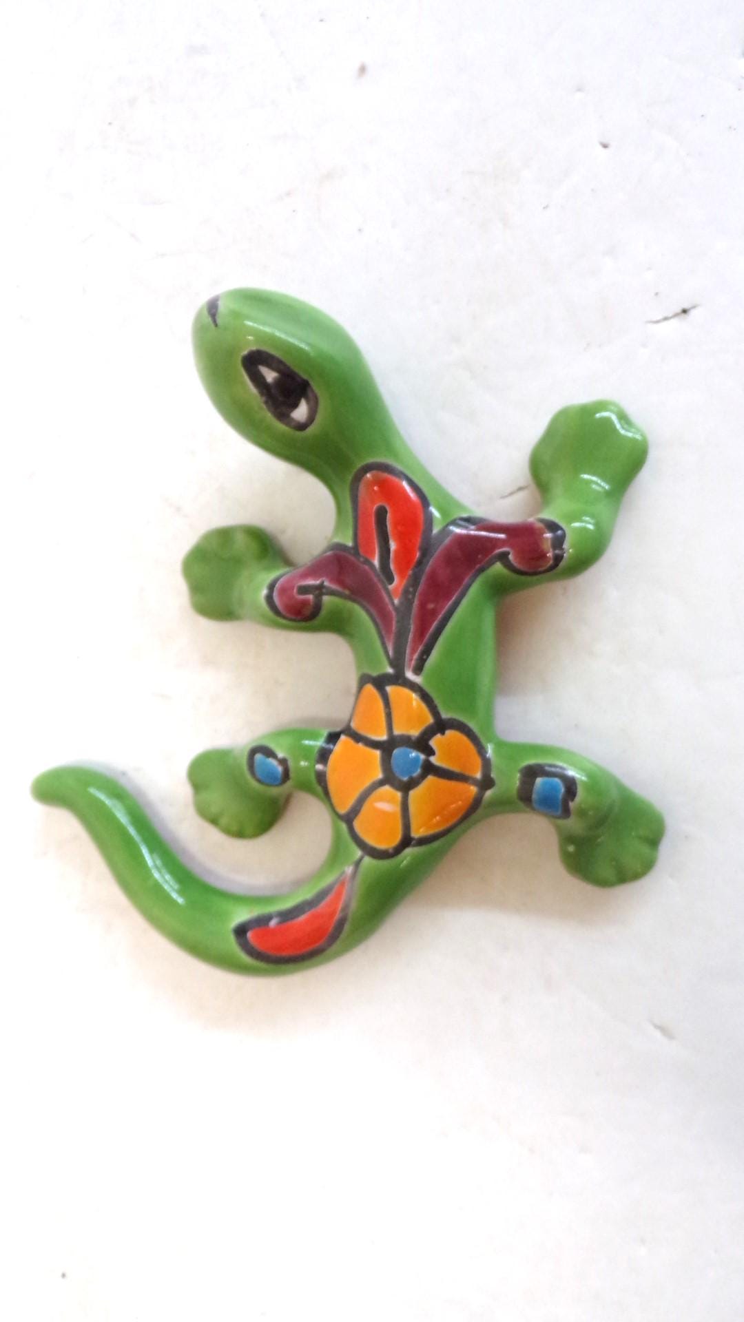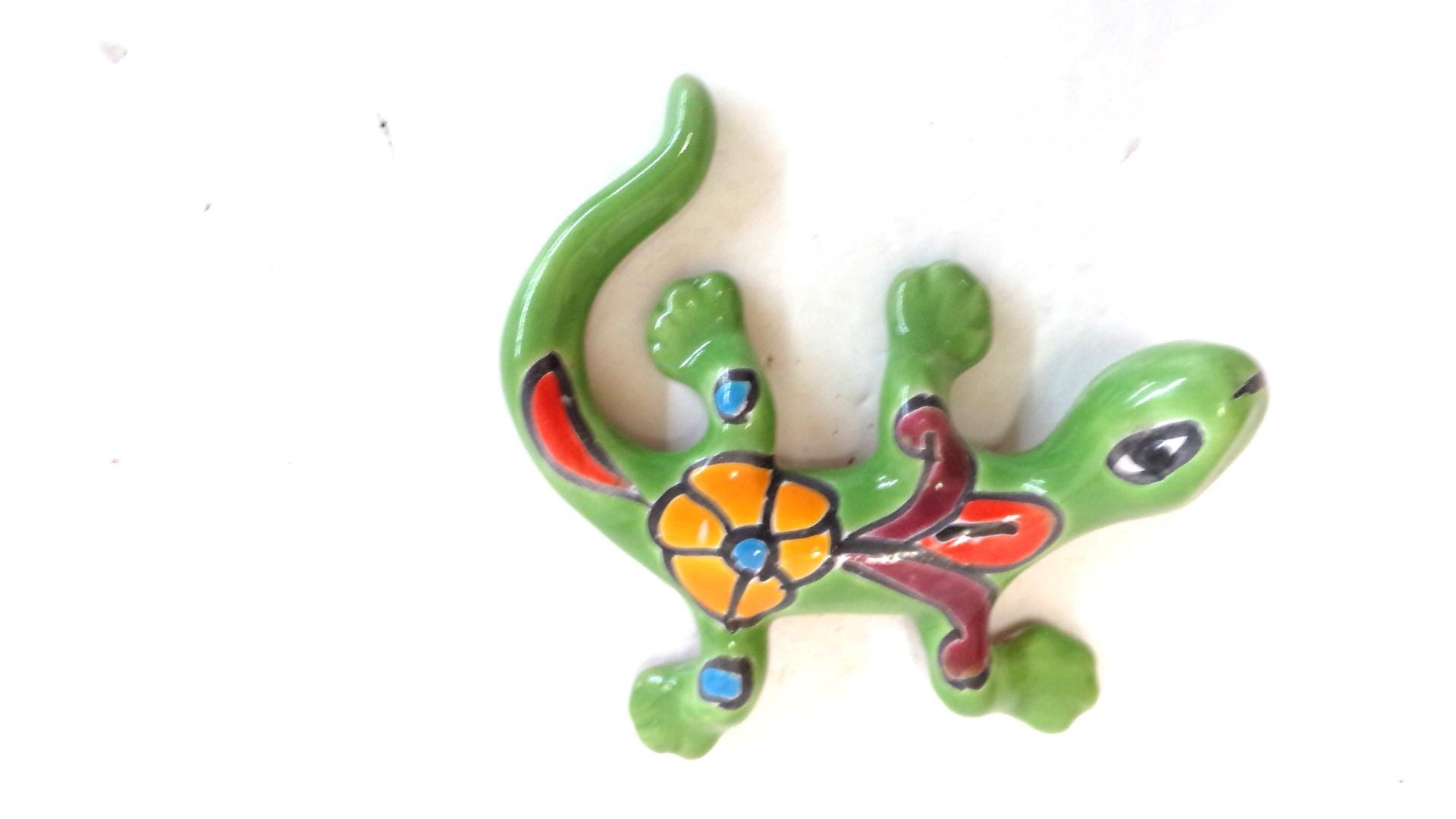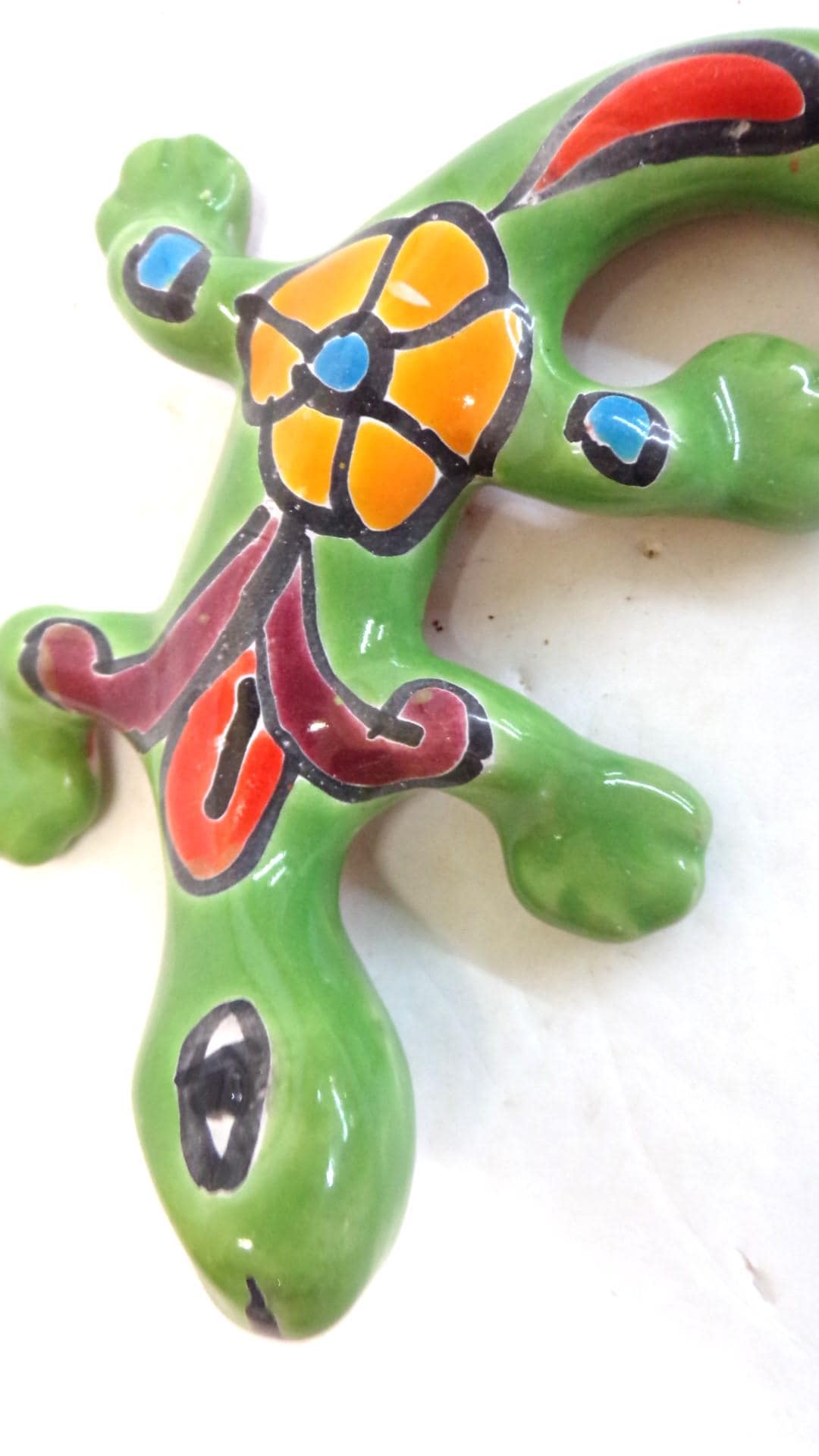 Very Beautiful Hand Painted 6" Lizard, Gecko, Iguana by an excellent Artisan in Mexico. Has a hole on the back side so it would be very easy to hang up on your wall if so desired. You will be getting the lizard that is actually shown in the pictures above. This item measures roughly 6" long by 6"" wide irregular. This would also make a great gift for a friend or a loved one. So, why ever just gift something ordinary? We will soon have many other and very unique hand painted wall art items to choose from. Favorite us now and then keep on checking back with us to see all the new items that we'll be adding. I am not the world's greatest photographer so I may not have the best pictures out there, but my prices certainly are the greatest so WHY EVER PAY MORE?