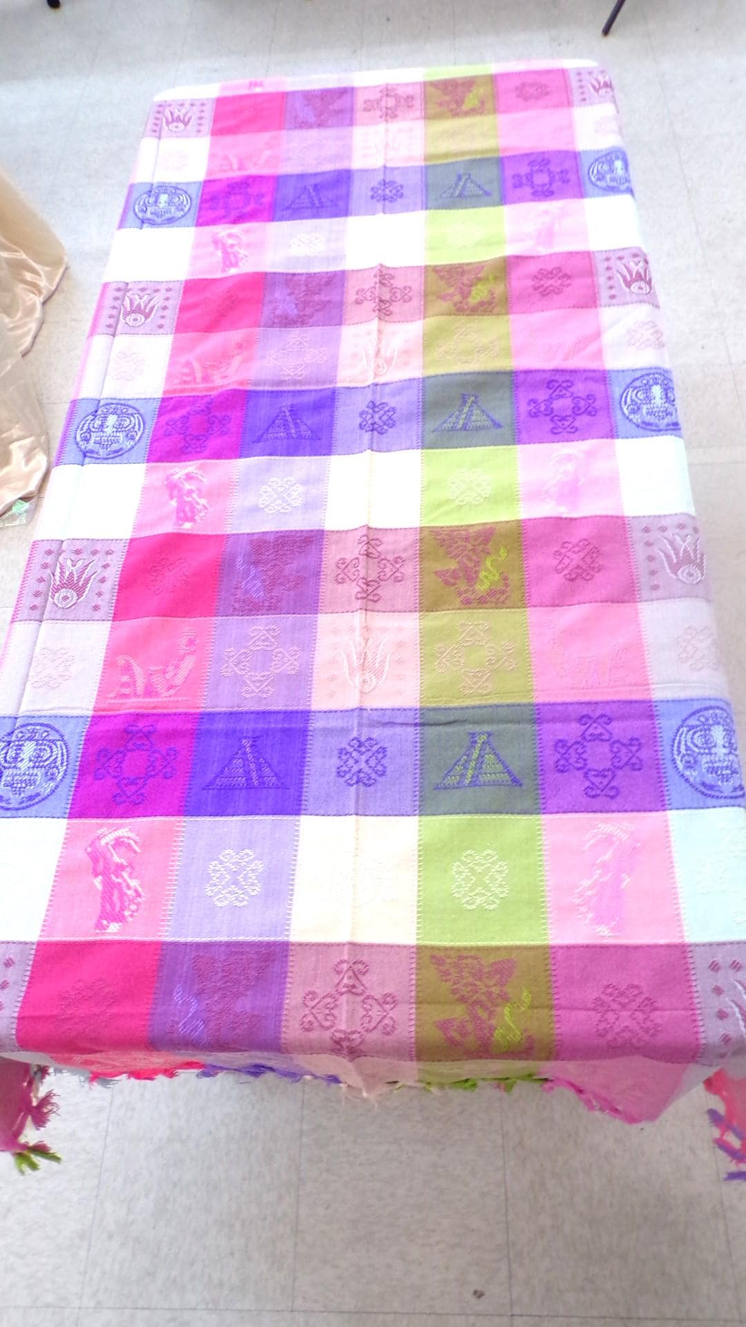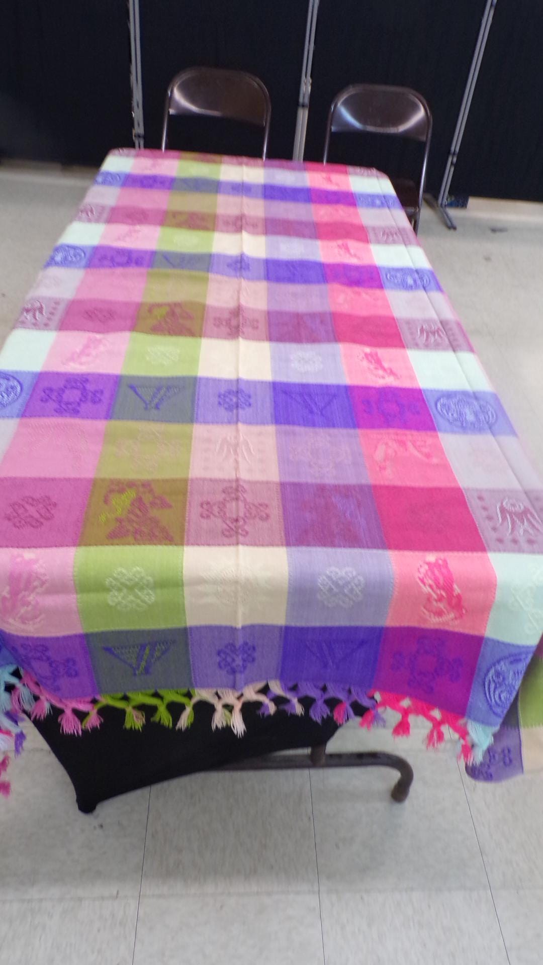 Beautiful Authentic Mexico Tablecloth. Southwest, Aztec, Mayan, Baja, Oaxacan, Traditional, Fringed at 2 Ends, Ethnic, Southwest Style. Free Shipping. Vibrant colors. Excellent for dining room tables. Really nice over picnic tables. My wife keeps a couple of these tablecloths in our RV for camping trips. The people at the campgrounds and RV parks are always giving her very great compliments on them. She says she brings 2 along because birds might have a tendency to mess them up when the picnic table is under a shade trees. I think she just likes the added compliments and is showing off a bit. Multi use, use at home and pack it along when camping too. I use them to cover my folding display tables when I am doing festivals and shows. These are the real thing rather than some Chinese or India tablecloth being passed off as a real ethic Mexico tablecloth. Tablecloths are shown here laying on a 6' by 2/12" folding display table. You will be getting the tablecloth shown in the pictures. Shop where so many home decorators do. These tablecloths would also make wonderful gifts for your friends or loved ones. So, why ever think of just gifting something ordinary? I am not the greatest photographer, but I strive to always bring you the best prices I can, so why ever pay more elsewhere?