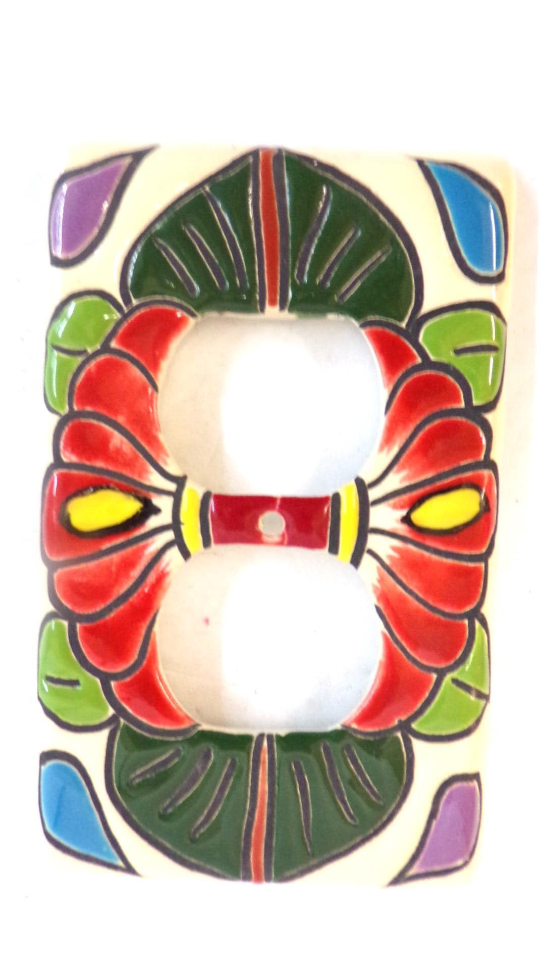 Handmade, Hand Painted Mexican Artisan Authentic Talavera Electric 2 Gang Electric Outlet Plate. These are authentic handmade talavera pottery ceramic covers rather than a stick on or plastic Chinese product. You will be getting the item actually shown in the pictures rather than an item kinda like this one. Each one is handmade and hand-painted, rather than machine made, so sometimes there can be minor flaws, but the overall look is always very beautiful and impressive. Be careful not to tighten your screws from your old plate so hard that you actually break your new cover plate. Slightly larger screws are available at any hardware store if need be. I am not the world's greatest photographer so I may not have the best pictures out there, but my prices certainly are the greatest so WHY PAY MORE?