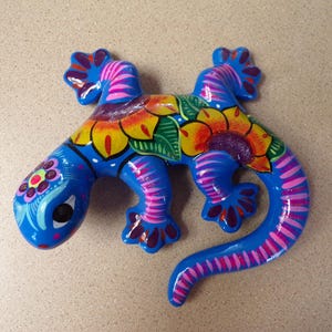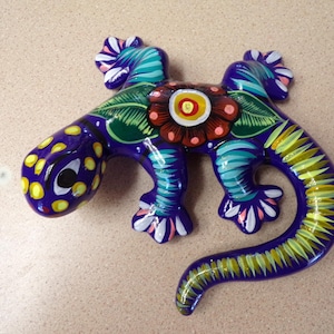 Very Beautiful Hand Painted 5" Lizard, Gecko, Iguana by an excellent Artisan in Mexico. Has a hole on the back side so it would be very easy to hang up on your wall if so desired. You will be getting the lizard that is actually shown in the pictures above. This item measures roughly 5" long by 2 1/2" wide irregular. This would also make a great gift for a friend or a loved one. So, why ever just gift something ordinary? We will soon have many other and very unique hand painted wall art items to choose from. Favorite us now and then keep on checking back with us to see all the new items that we'll be adding. I am not the world's greatest photographer so I may not have the best pictures out there, but my prices certainly are the greatest so WHY EVER PAY MORE?