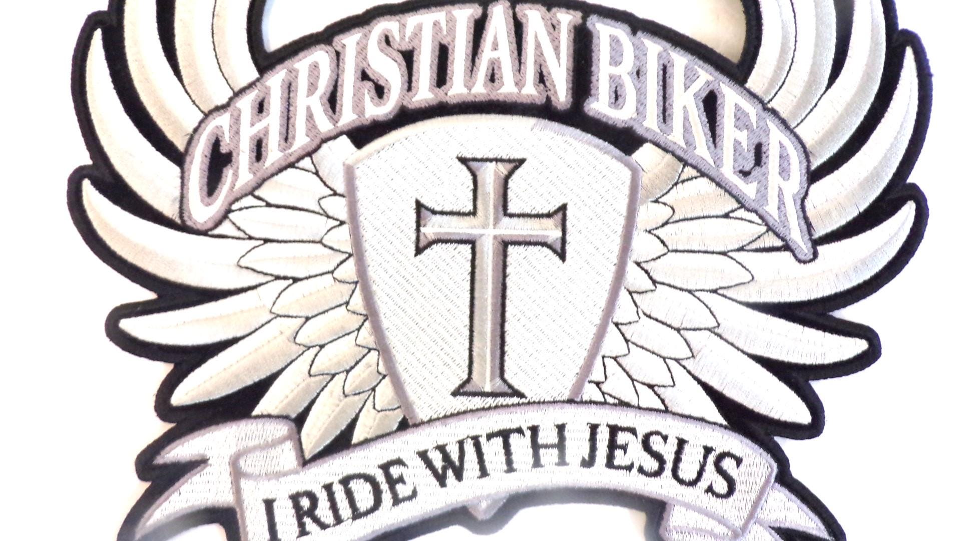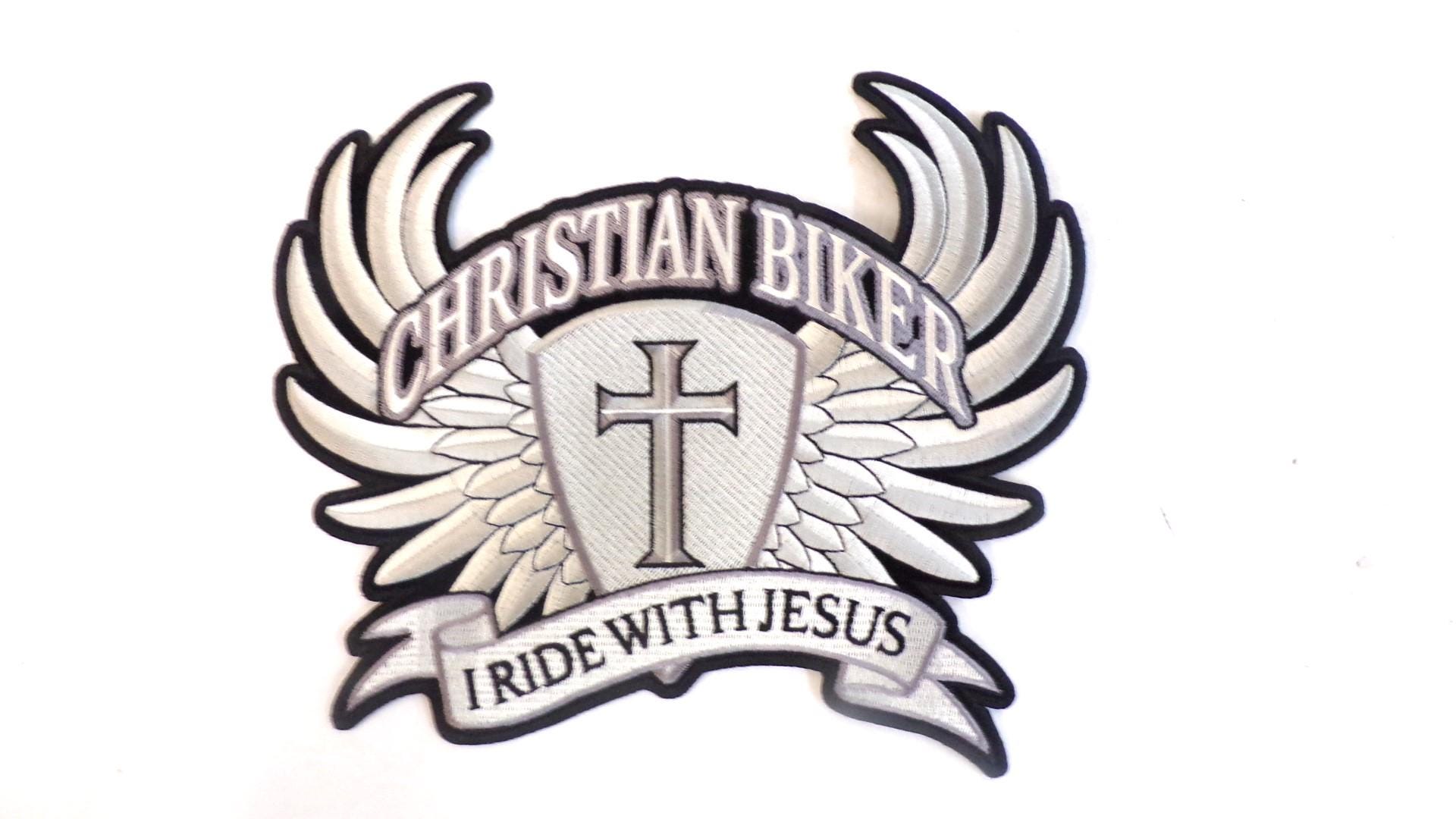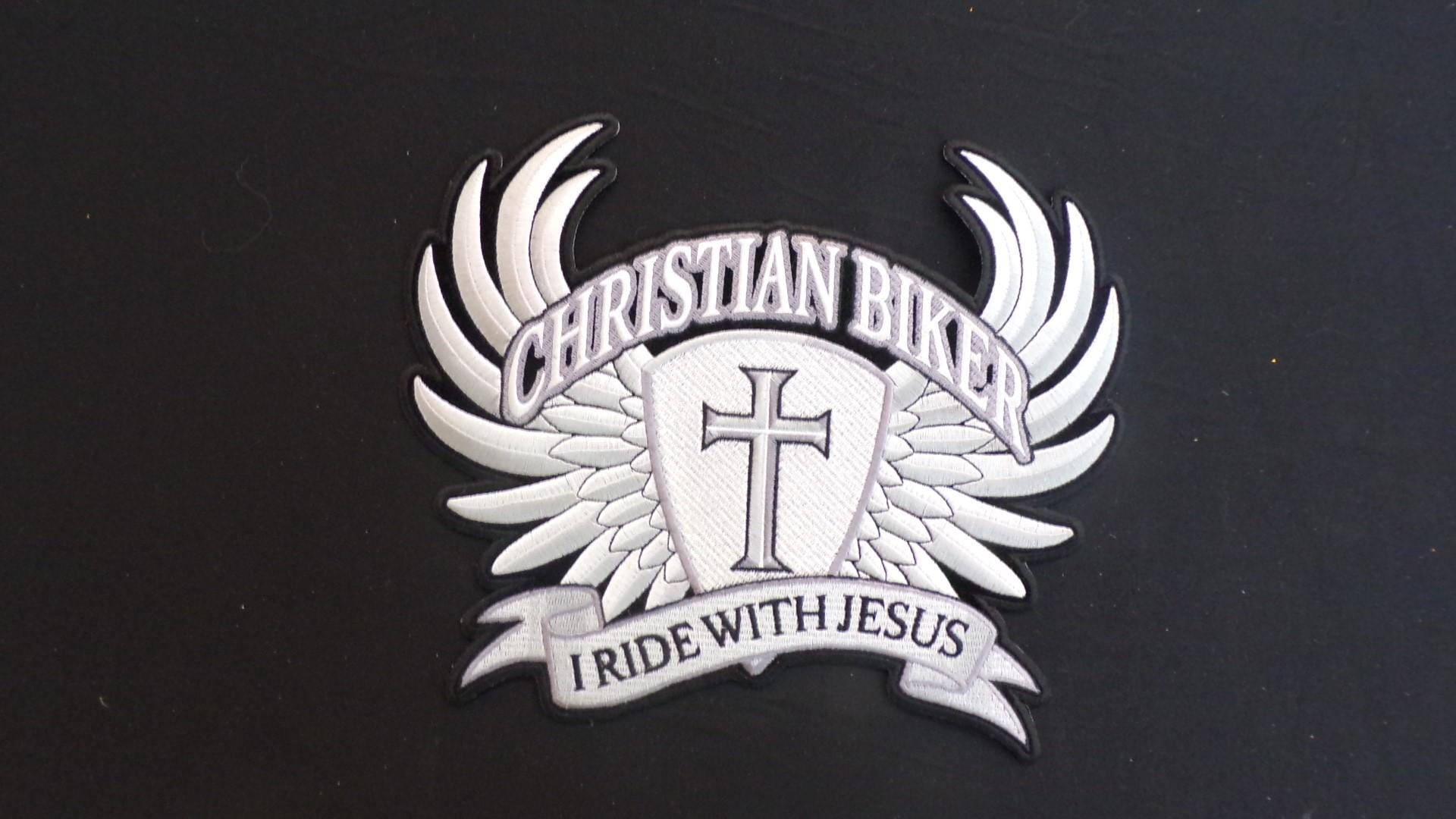 Christian Motorcycle Patch – I Ride with Jesus – 10" Wide – Free Shipping. Roughly 10" by 8" irregular. This would look so great on the back of a vest, jacket, or denim shirt. Sew or iron on but always sew onto leather items. And be sure to see all the great prices we have on our other patches and biker accessories.