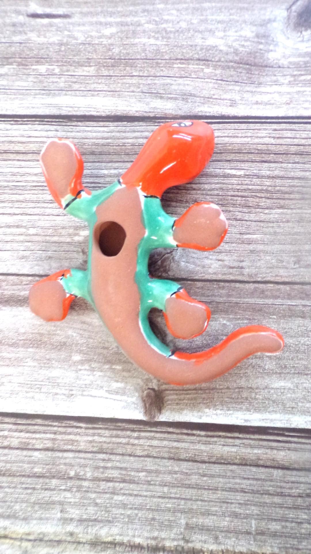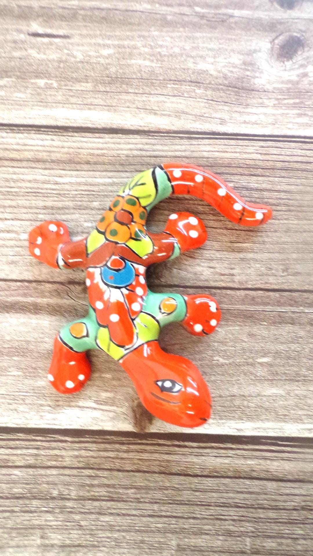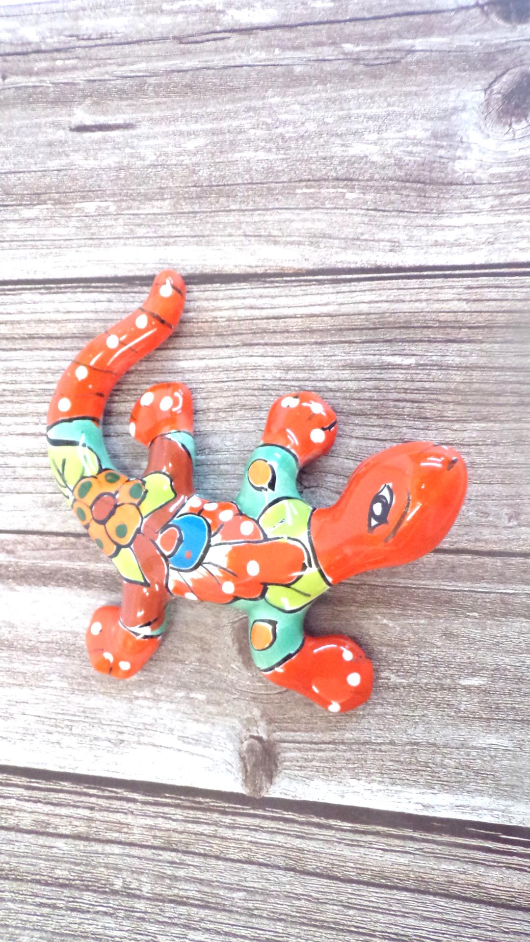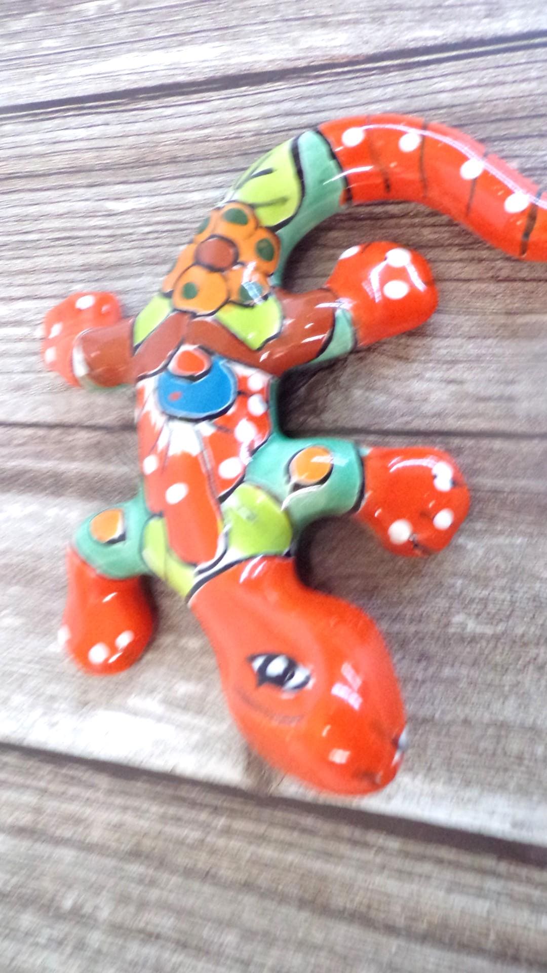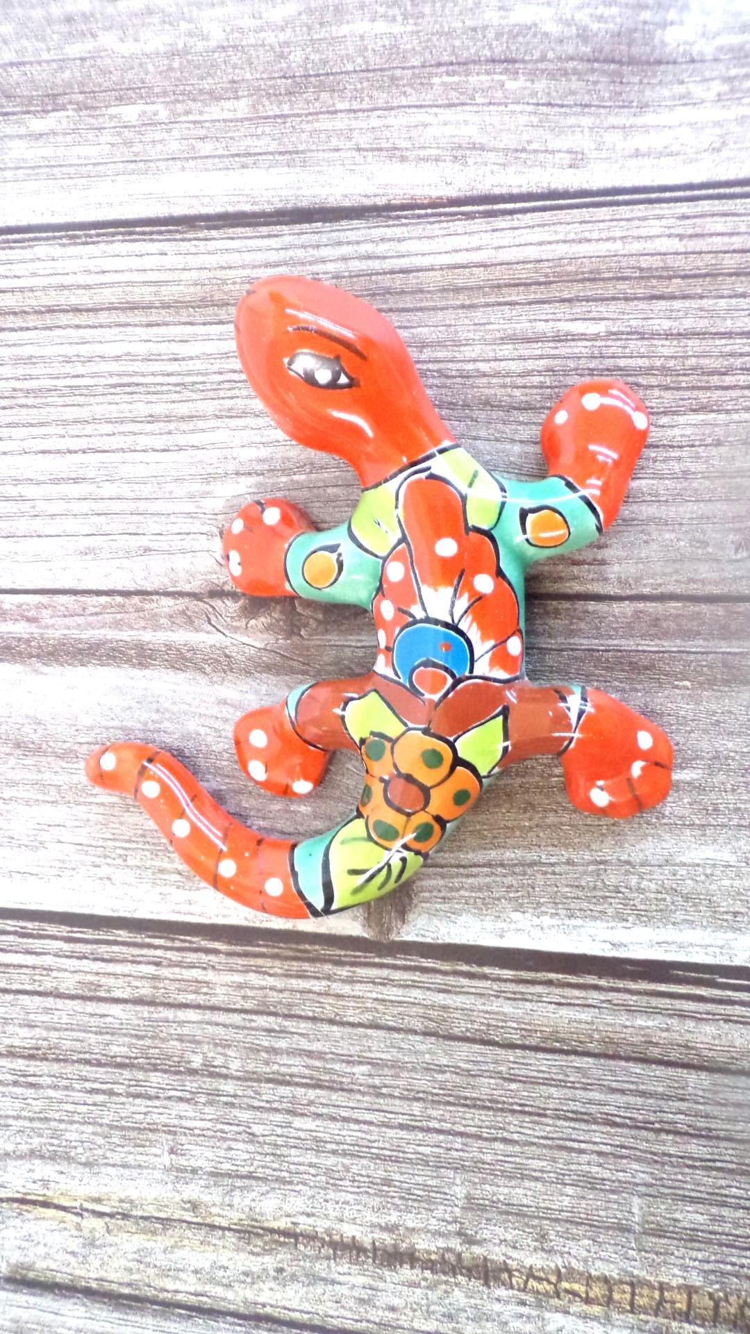 Very Beautiful Hand Painted 5" Lizard, Gecko, Iguana by an excellent Artisan in Mexico. Has a hole on the back side so it would be very easy to hang up on your wall if so desired. You will be getting the lizard that is actually shown in the pictures above. This item measures roughly 5" long by 2 1/2" wide irregular. This would also make a great gift for a friend or a loved one. So, why ever just gift something ordinary? We will soon have many other and very unique hand painted wall art items to choose from. Favorite us now and then keep on checking back with us to see all the new items that we'll be adding. I am not the world's greatest photographer so I may not have the best pictures out there, but my prices certainly are the greatest so WHY EVER PAY MORE?