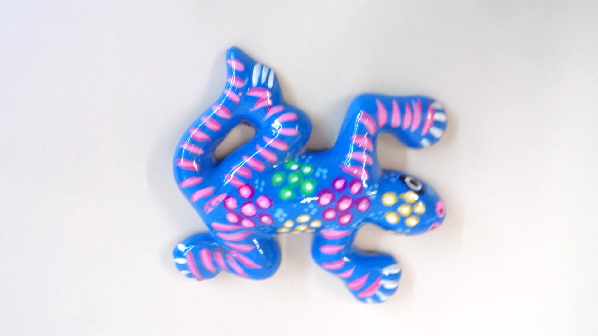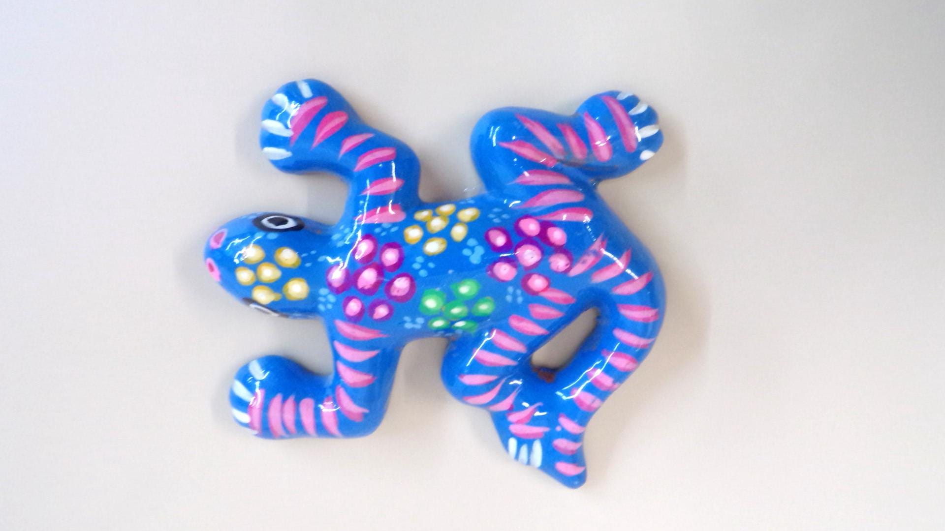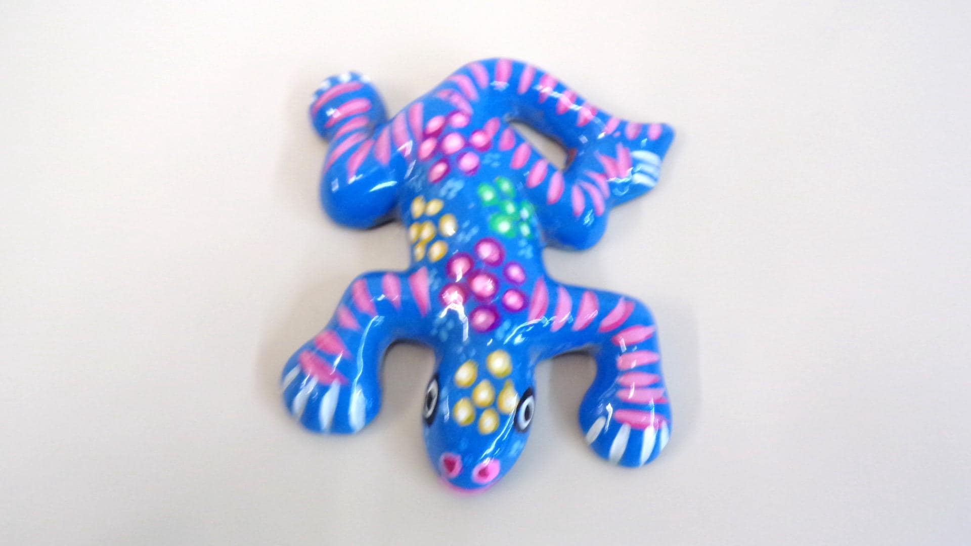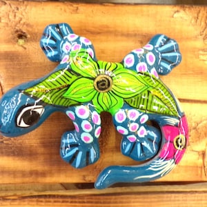 Very Beautiful Hand Painted 4 1/2" Lizard, Gecko, Iguana by an excellent Artisan in Mexico. Has a hole on the back side so it would be very easy to hang up on your wall if so desired. You will be getting the lizard that is actually shown in the pictures above. This item measures roughly 4 1/2" long by 2 1/2" wide irregular. This would also make a great gift for a friend or a loved one. So, why ever just gift something ordinary? We will soon have many other and very unique hand painted wall art items to choose from. Favorite us now and then keep on checking back with us to see all the new items that we'll be adding. I am not the world's greatest photographer so I may not have the best pictures out there, but my prices certainly are the greatest so WHY EVER PAY MORE?