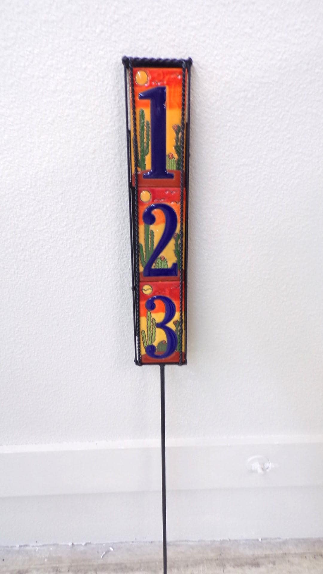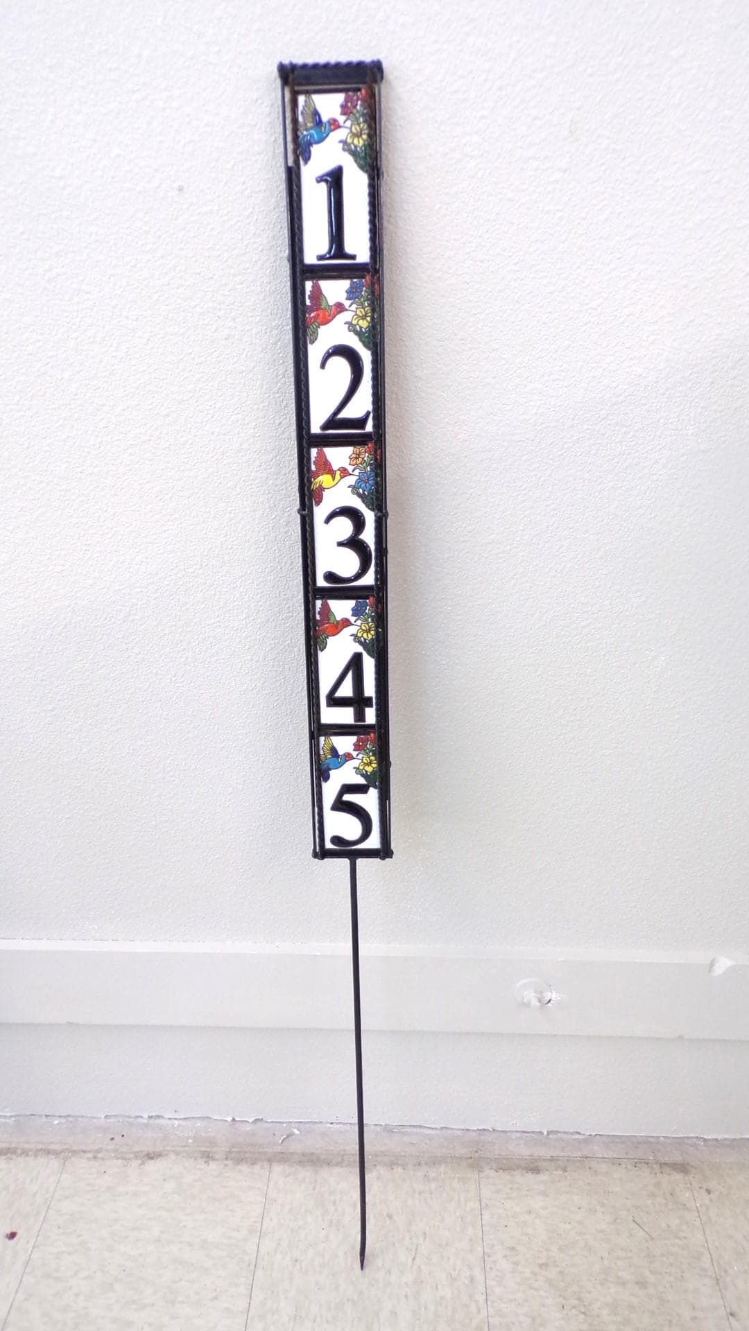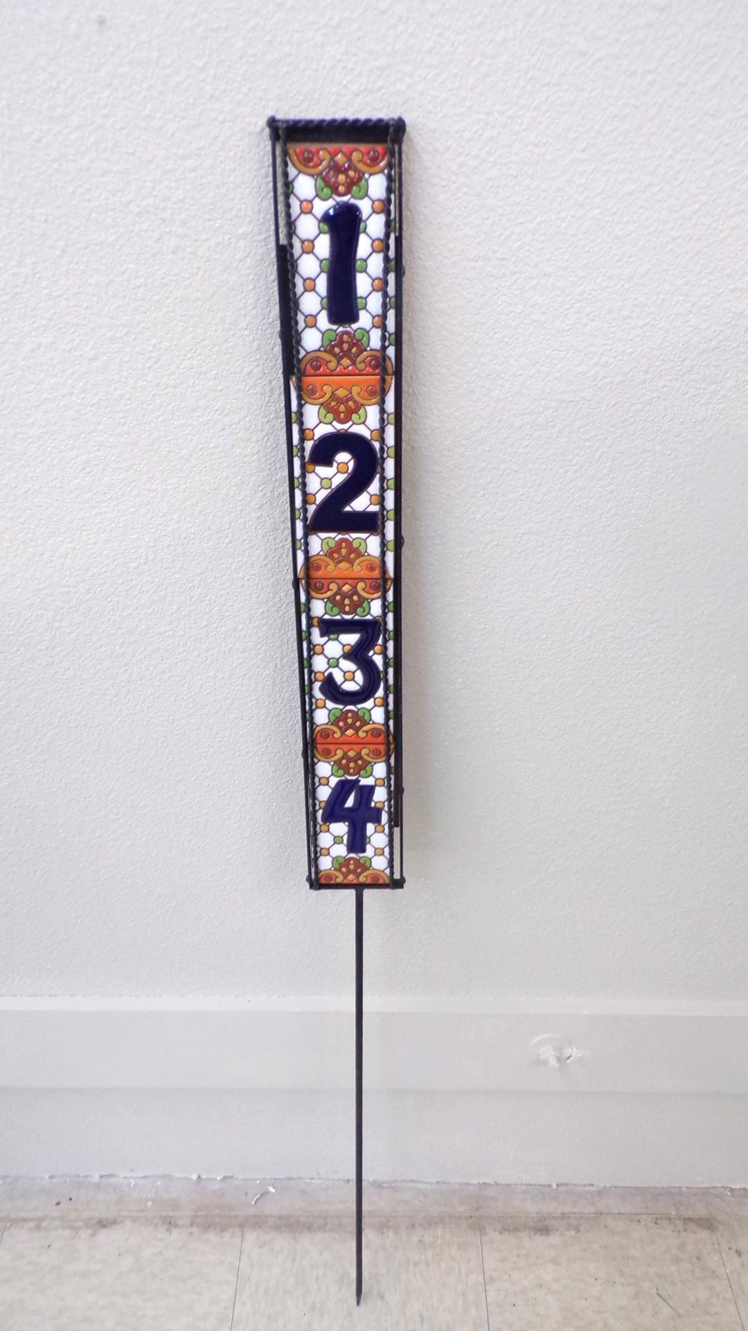 These stick in the ground welded iron frames are designed only for our 6" by 3" Talavera address tiles—please measure yours before ordering. Many tile makers use different dimensions, and these frames won’t fit other sizes. The in-ground stem is 31-33" long. TILES shown for display purposes ARE NOT included but are available in our shop. We also offer vertical ground frames & hang up frames in our shop.