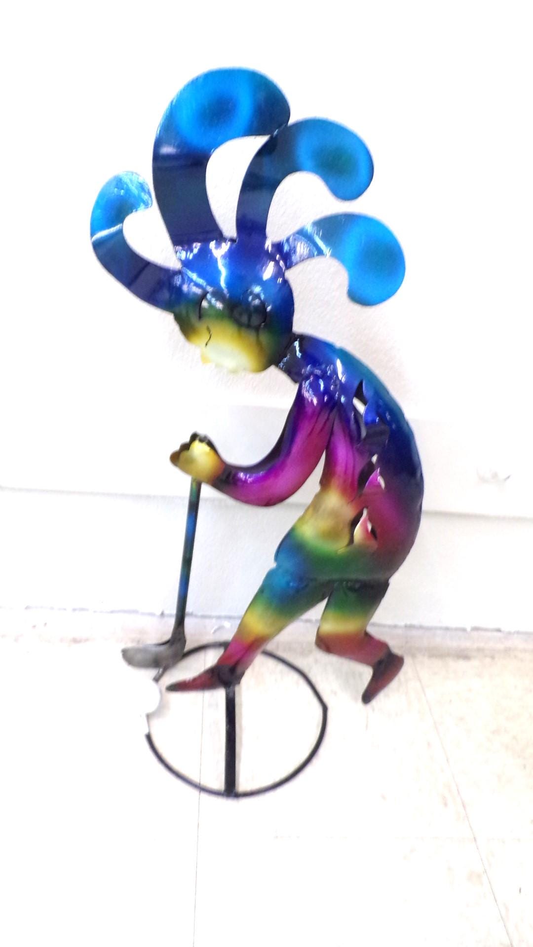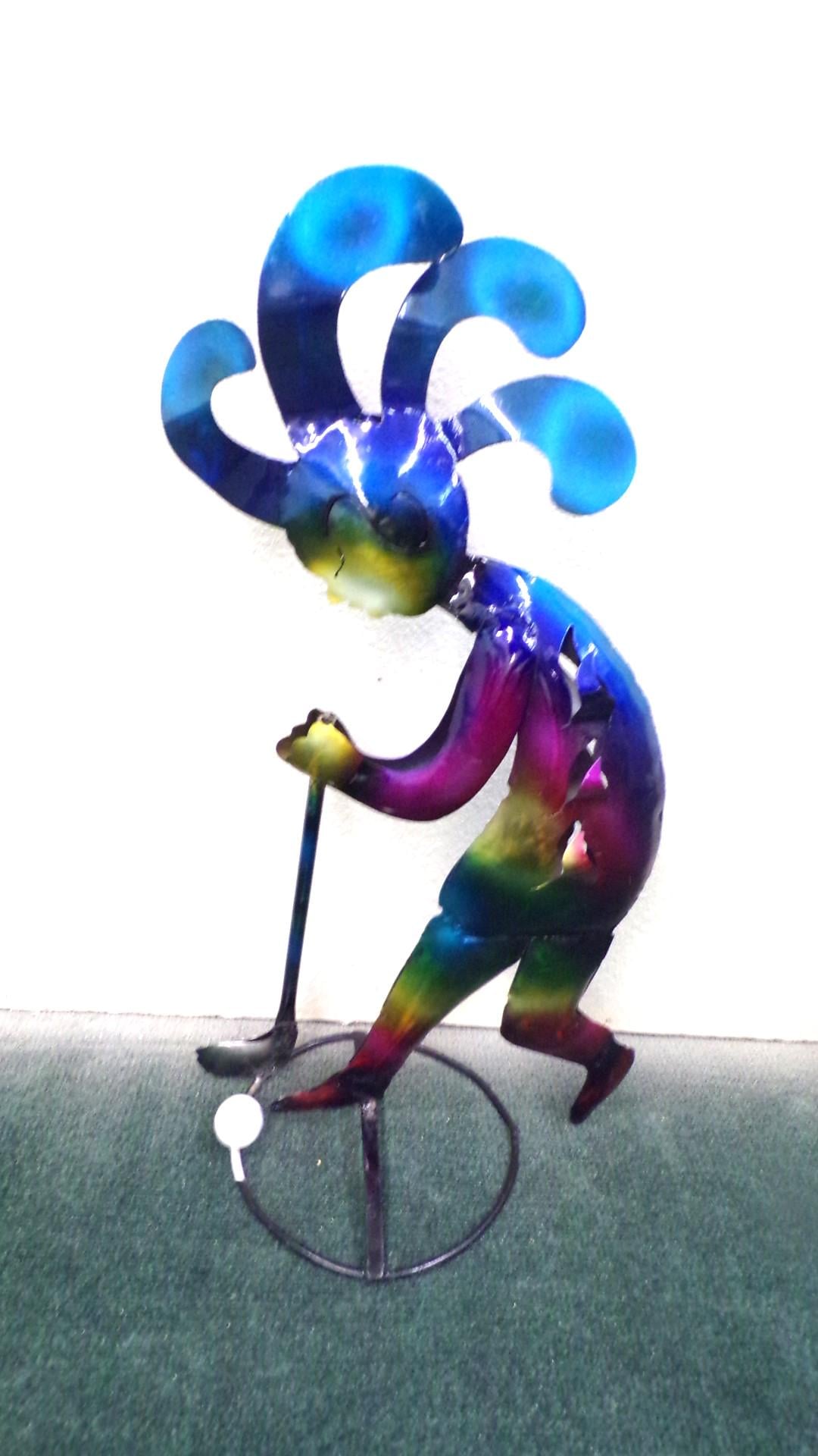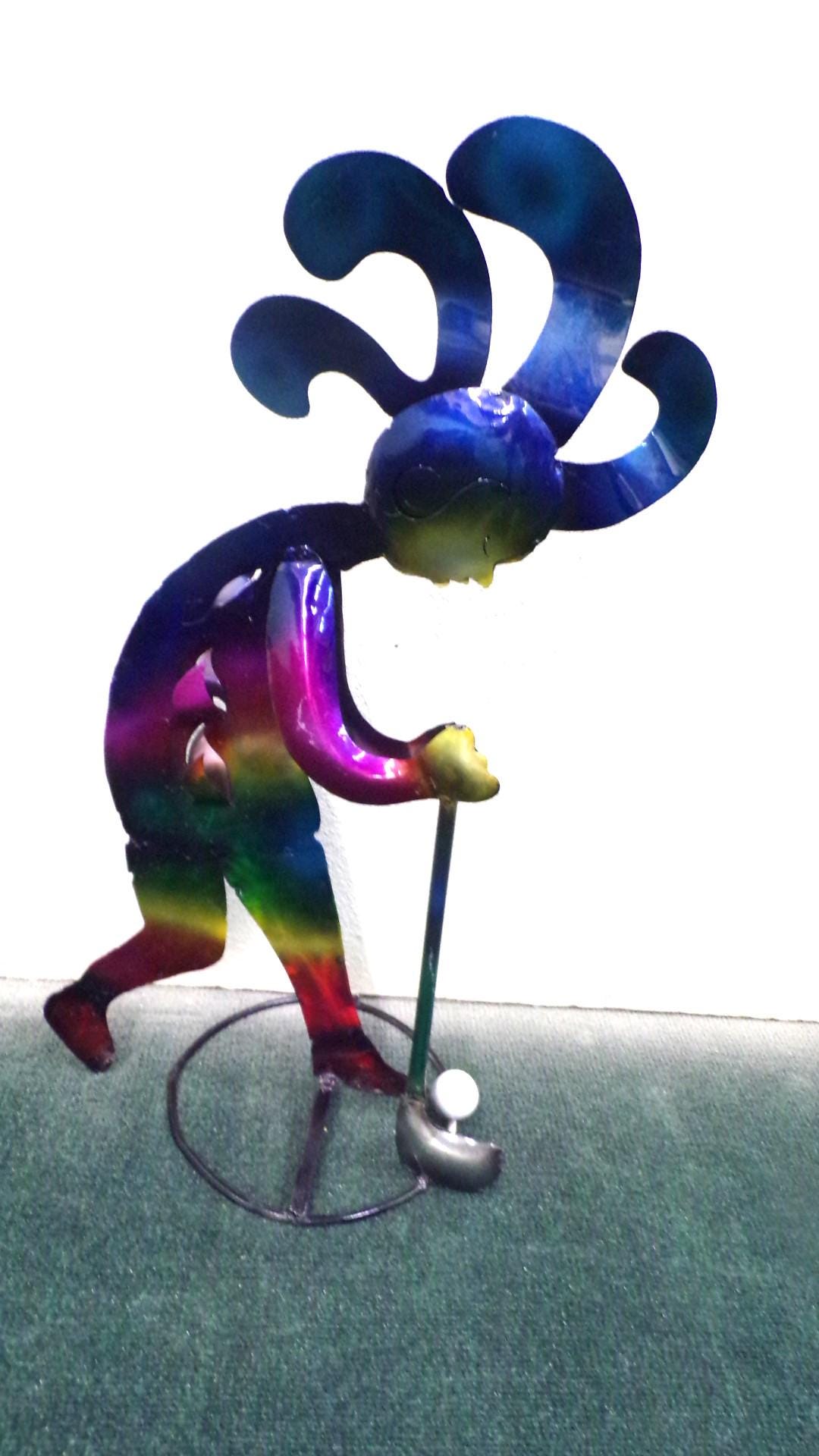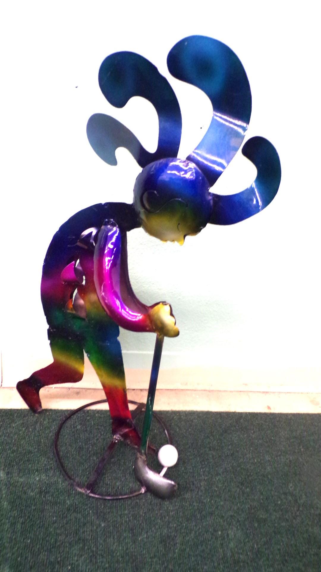 Kokopelli Playing Golf • Handmade 27" Tall Metal Folk Art• Free Shipping. This would look so great in your bar area or patio. This item is roughly 27 1/2" tall by 14" wide irregular. And he's got friends that may be in our Etsy shop if still available. You will be getting the item actually shown in the pictures. Each of these are items are handmade by artisans so there can at times be minor imperfections, but the overall look is quite beautiful. This item would make a great & unusual gift for a friend or a loved one too. Why just gift something ordinary? I am not the world's greatest photographer so I may not have the best pictures out there, but my prices certainly are the greatest so WHY EVER PAY MORE?