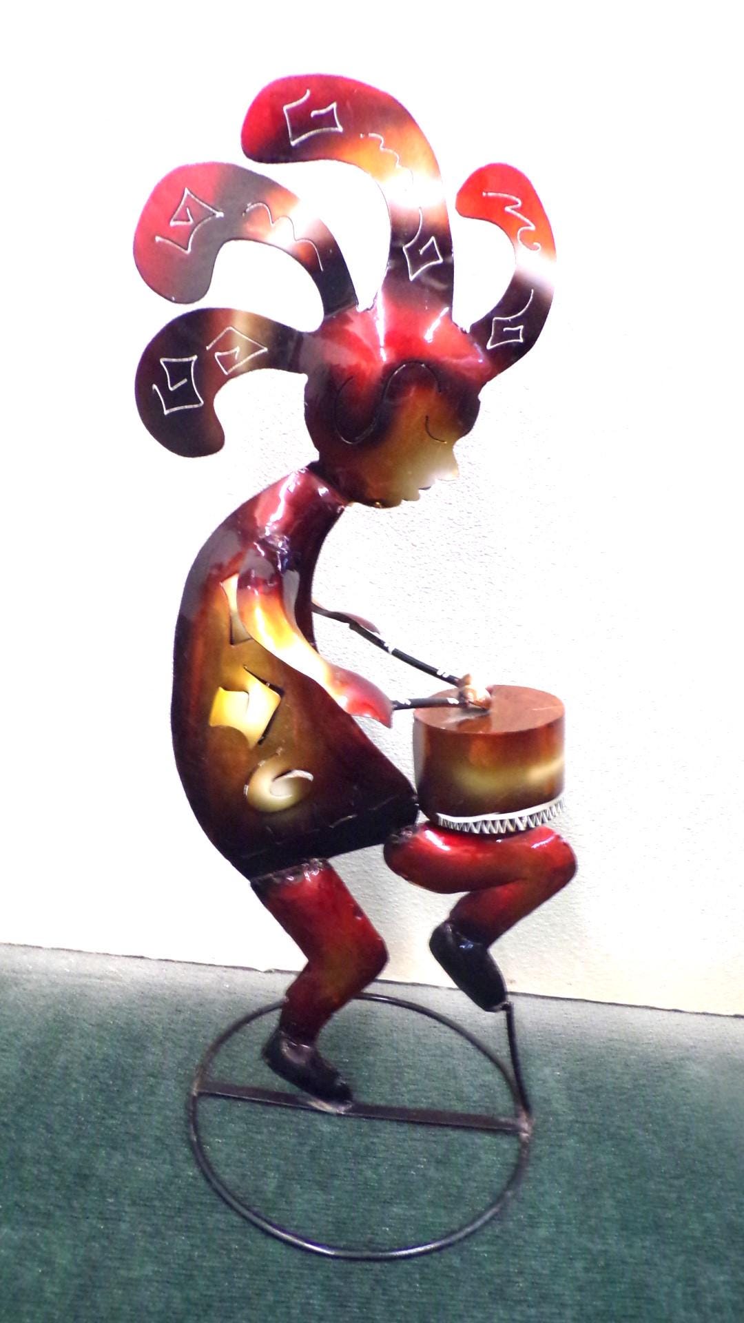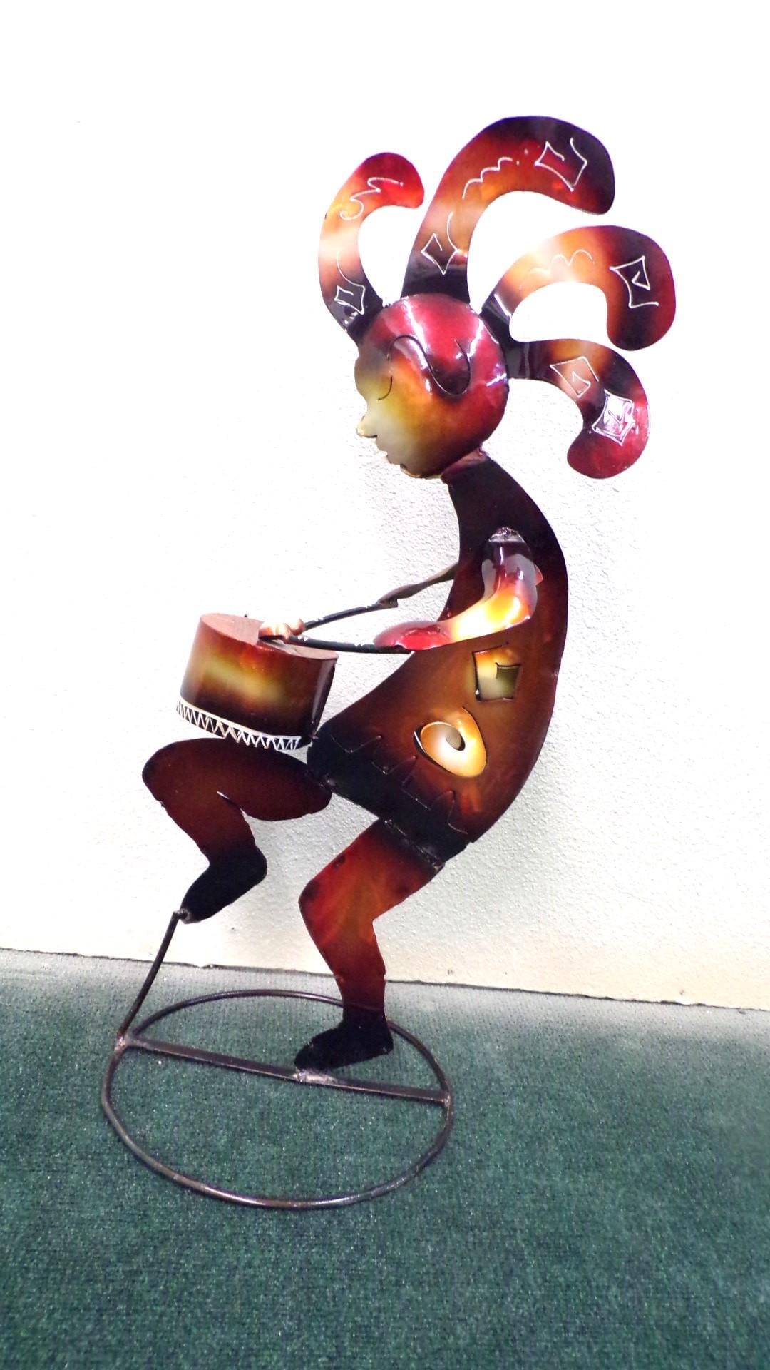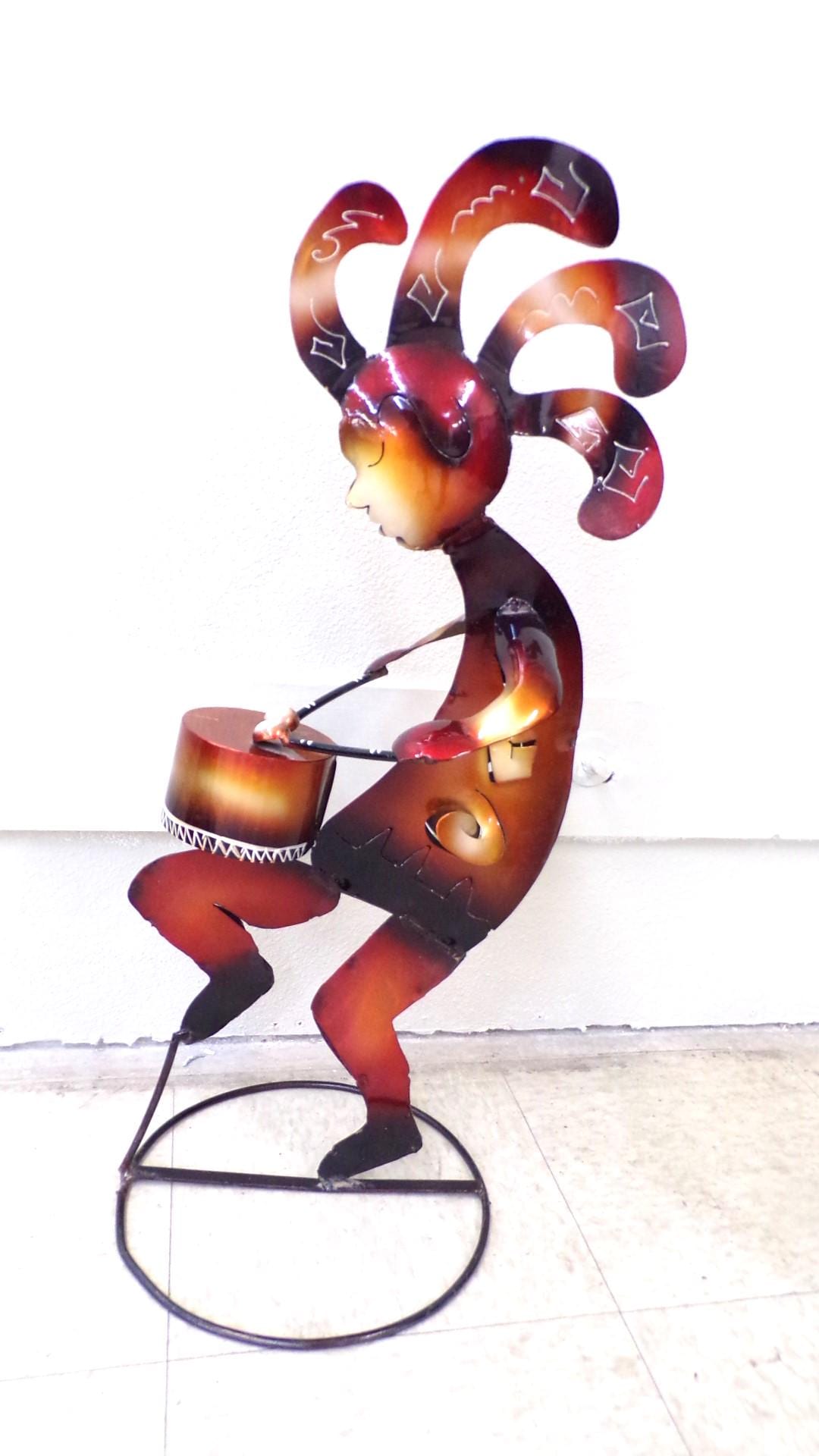 Kokopelli Playing Drum • Handmade 29" Tall Metal Folk Art• Free Shipping. This would look so great in your bar area or patio. This item is roughly 2" tall by 14" wide irregular. And he's got friends that may be in our Etsy shop if still available. You will be getting the item actually shown in the pictures. Each of these are items are handmade by artisans so there can at times be minor imperfections, but the overall look is quite beautiful. This item would make a great & unusual gift for a friend or a loved one too. Why just gift something ordinary? I am not the world's greatest photographer so I may not have the best pictures out there, but my prices certainly are the greatest so WHY EVER PAY MORE?