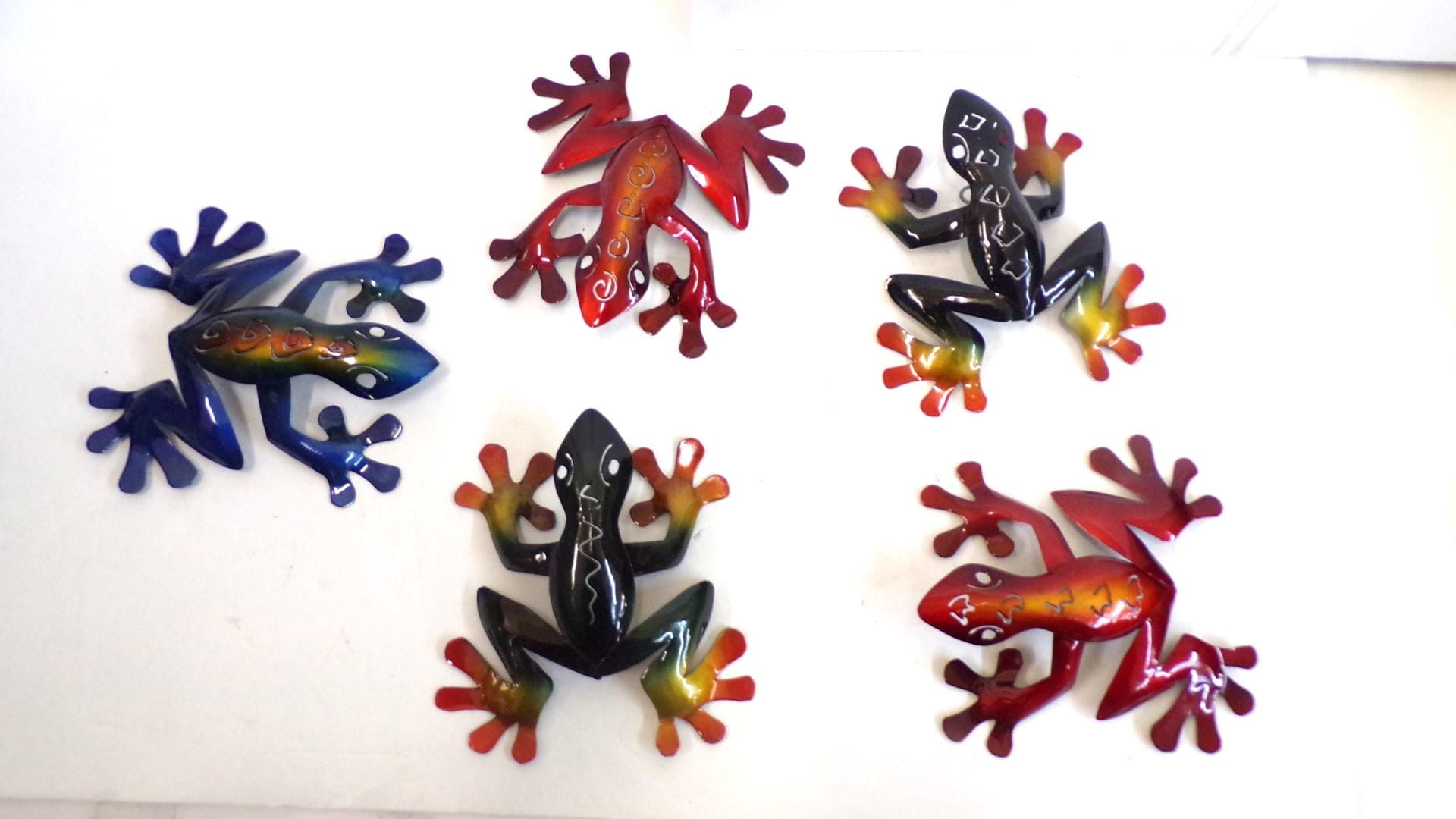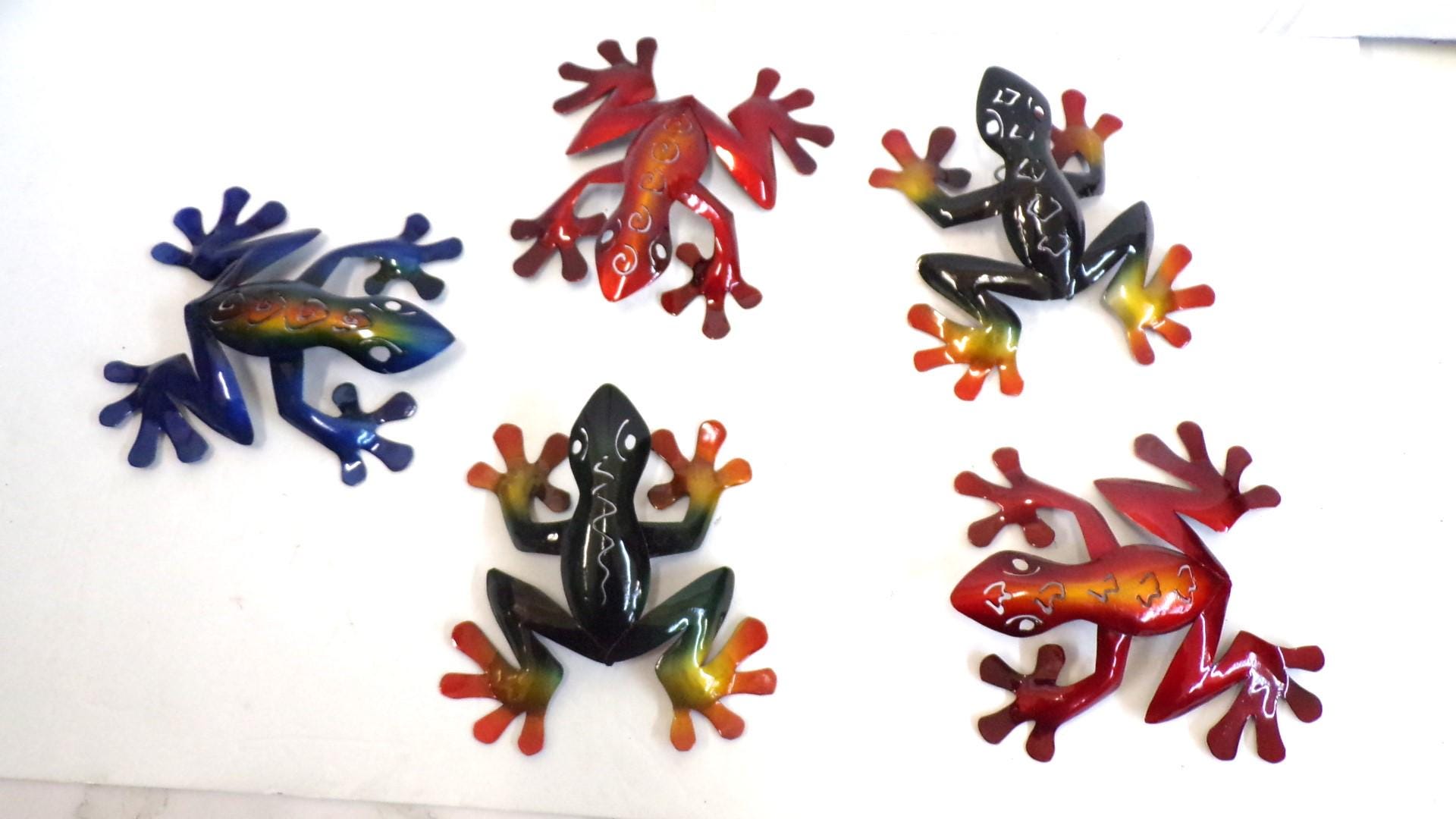 Wholesale 5pc Metal Wall Art Frog – Handmade in Mexico. Handcrafted by artisan friends. Each piece features vibrant detail and an eyelet on the back for easy hanging with a screw or nail. No color substitutions, each lot is different, all colors sell well.