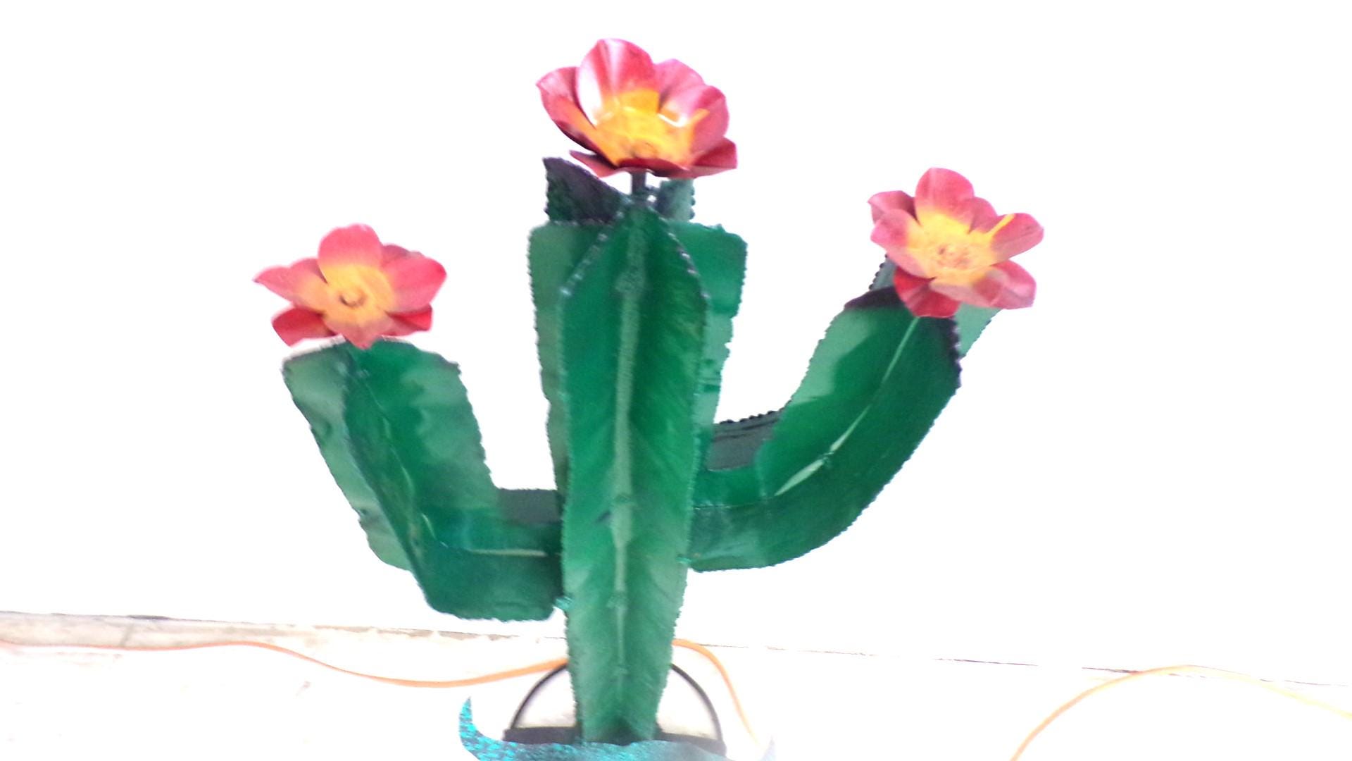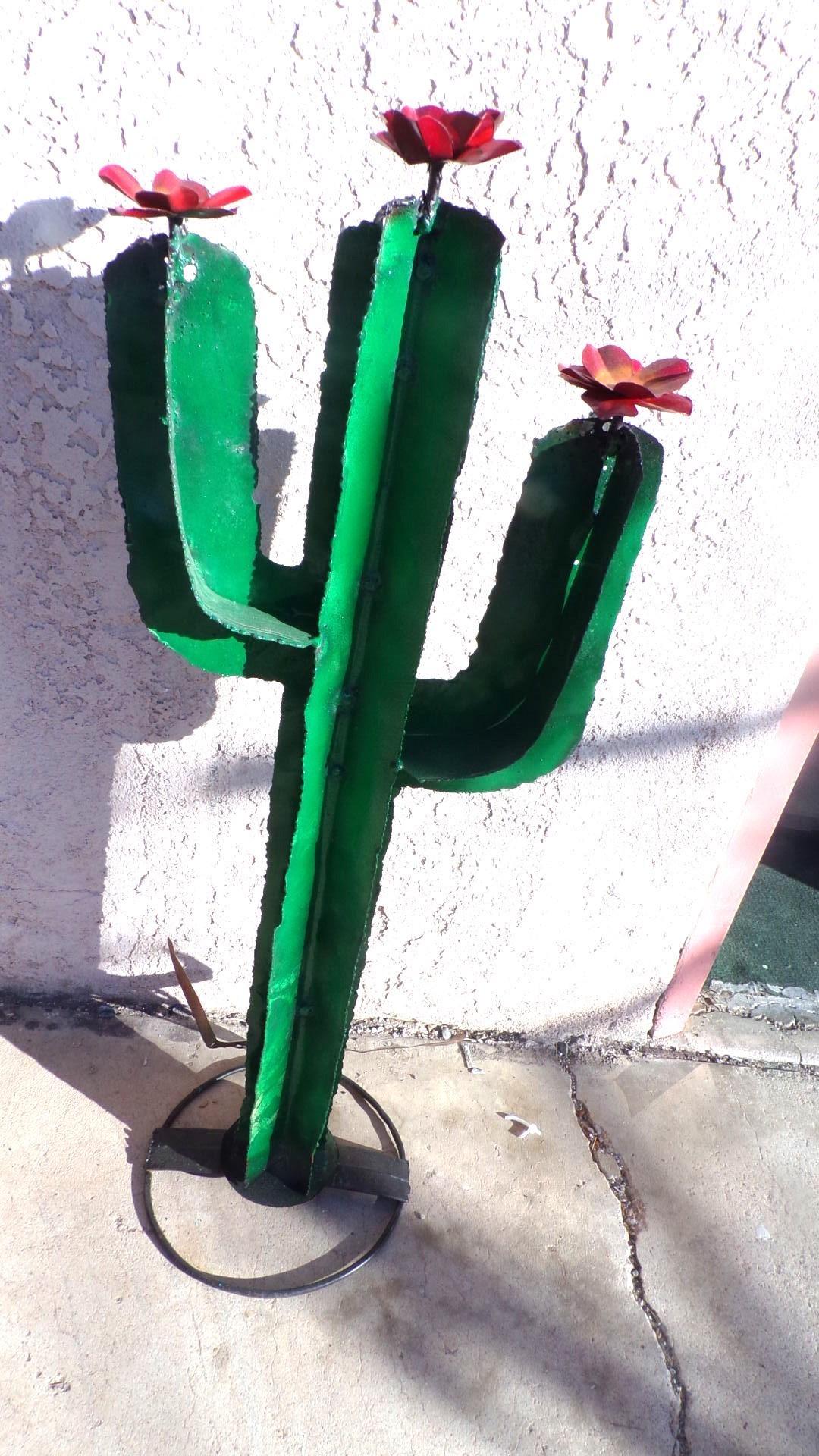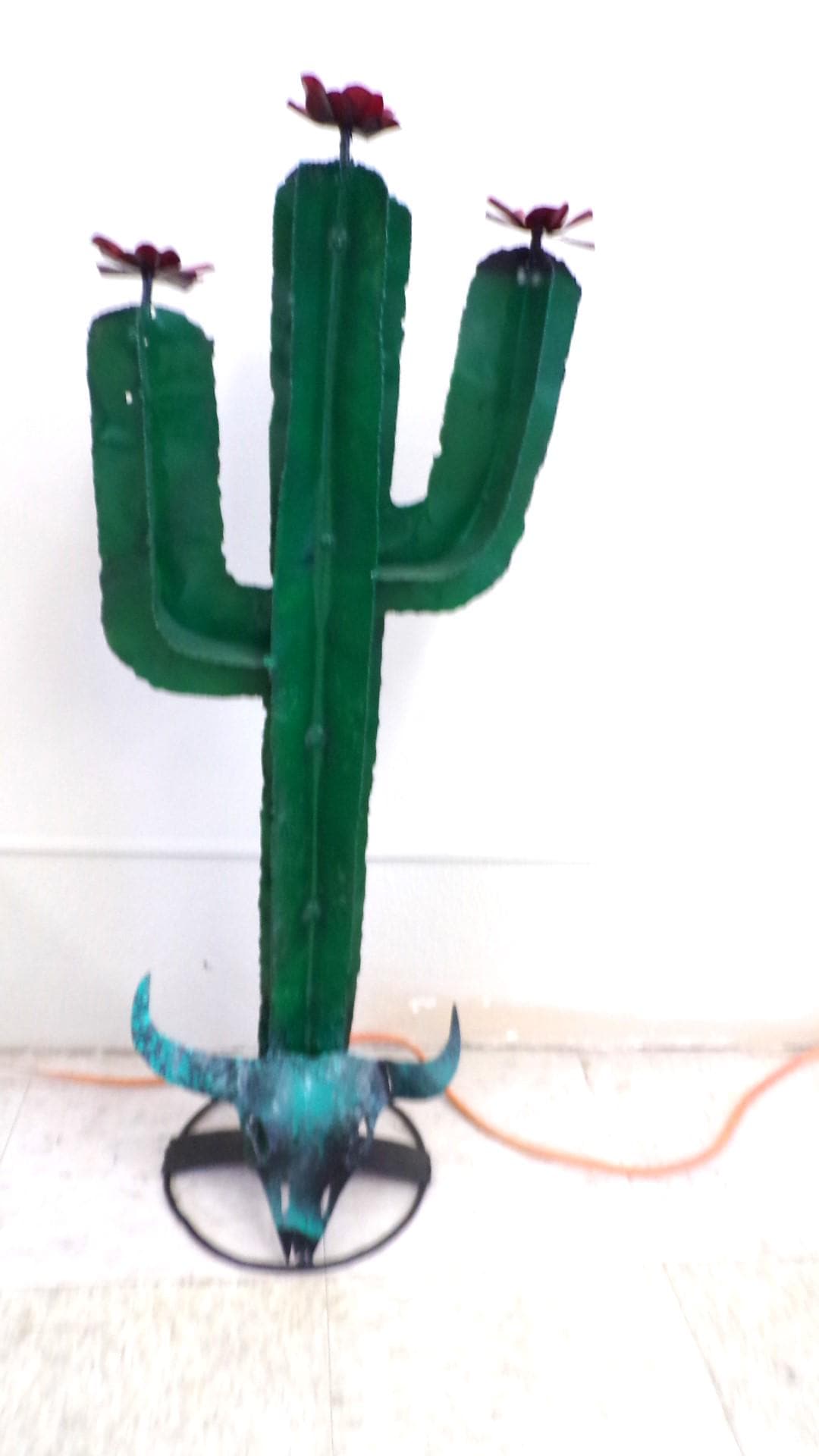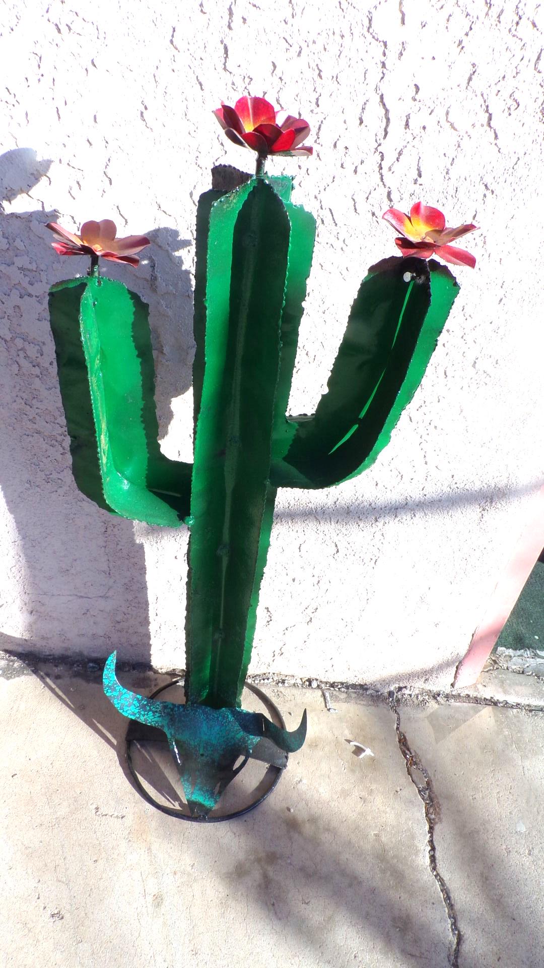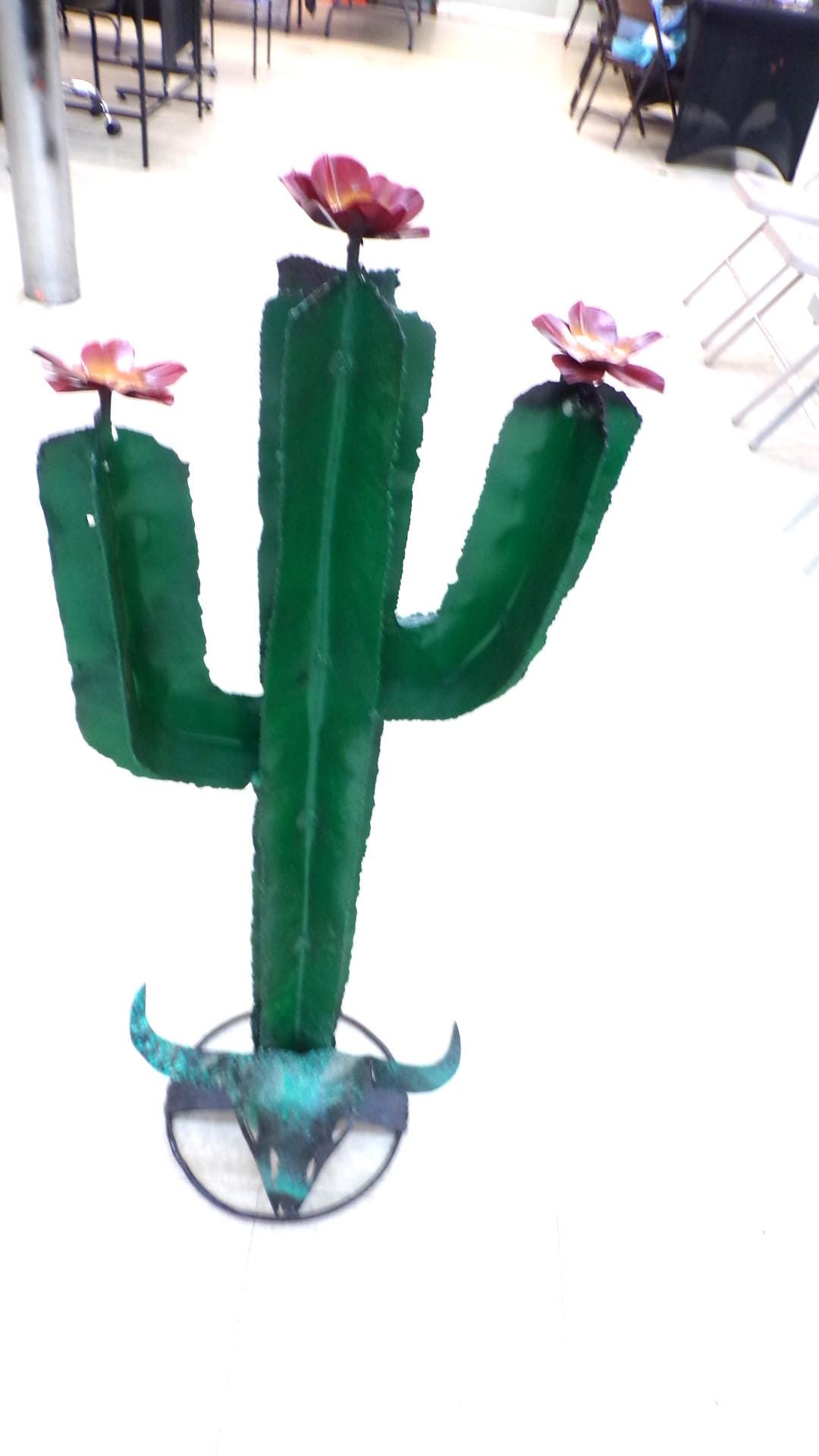 35" Metal Saguaro with Steer Head – Handmade Yard Art That Never Wilts | 3 Flowers. Doesn't Need Water. Handcrafted by a good artisan friend of mine. Roughly 35 .5" tall by 13" wide irregular. Handmade items may sometimes have minor flaws, but the overall look is usually quite awesome. This would look so awesome in your yard, house, restaurant, bar, or business. Shop where so many home decorators do. And this would also make an awesome gift for a friend or a loved one. So, why gift something just ordinary? Favorite us now and then keep on checking back with us to see all the beautiful & many unusual new items that we will be adding on a regular basis. Many of our items are just one of a kind artistic pieces. I am not the world's greatest photographer so I may not have the best pictures, but my prices certainly are the greatest so Why Pay More?