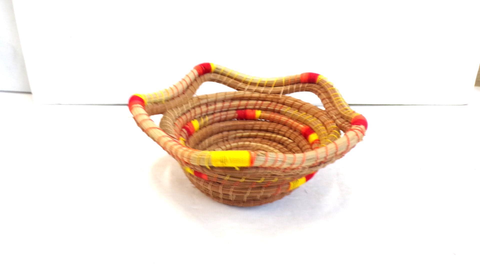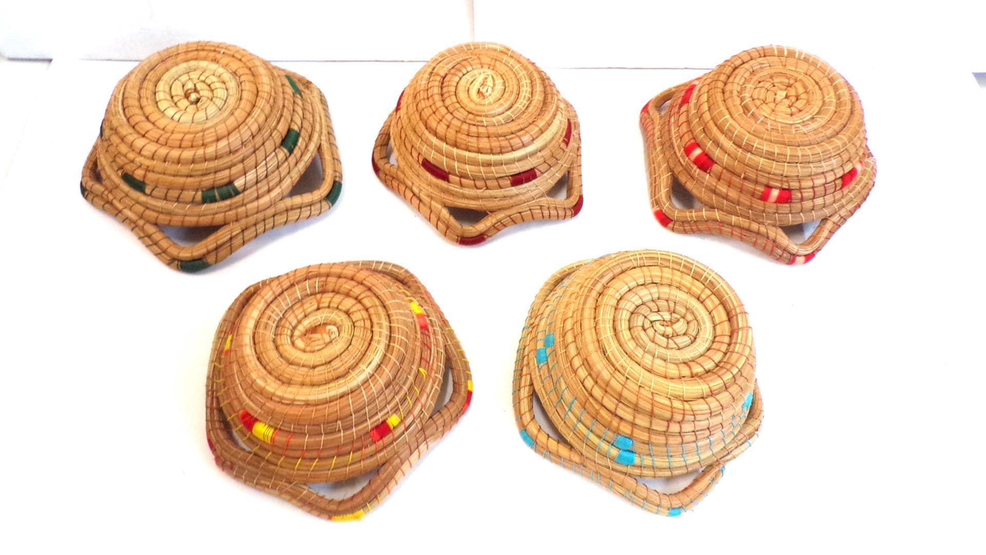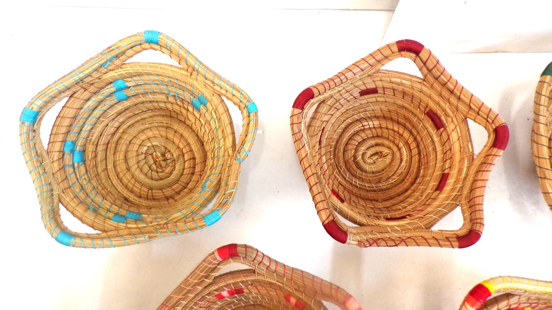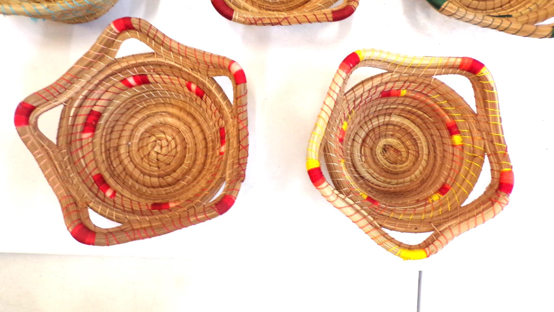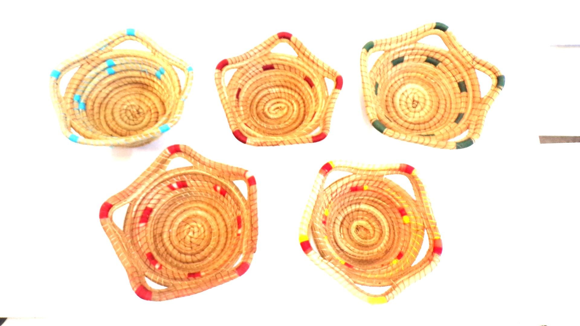 Wholesale 5pc Michoacan Indian Handmade Pine Baskets–Free Shipping. Handmade in Mexico. Handmade so no 2 pieces are alike. "Smell the Pine" I write on a table sign which sells these baskets quickly. No color substitutions, each lot is different, all colors sell well.