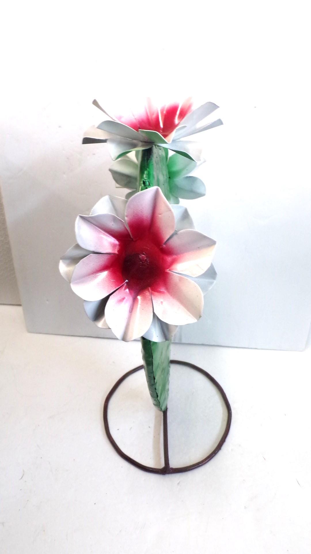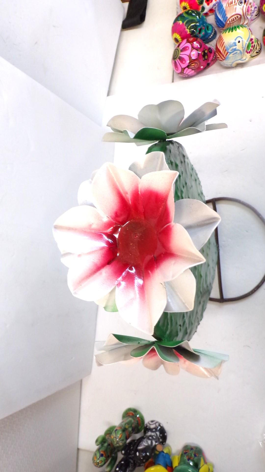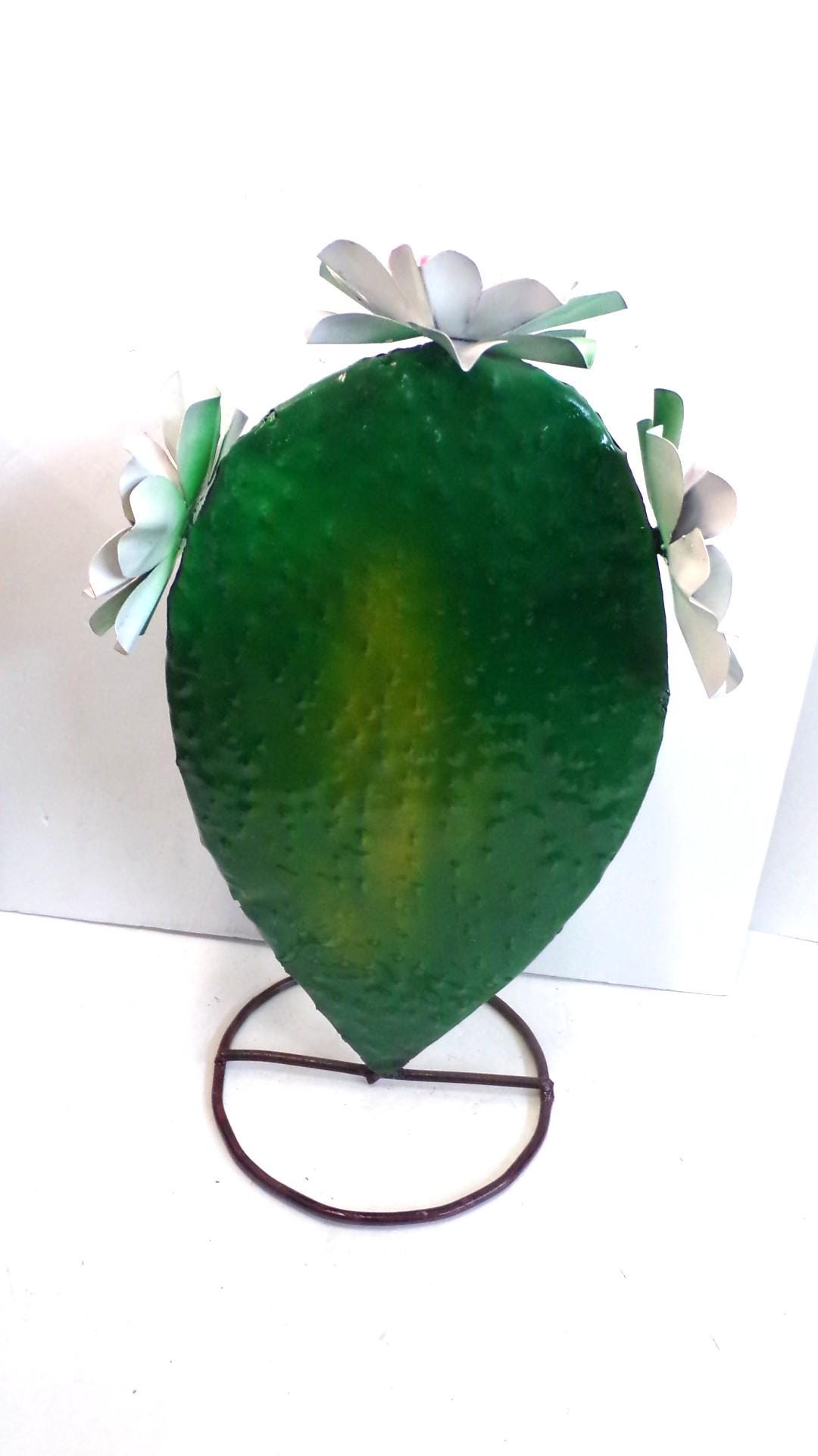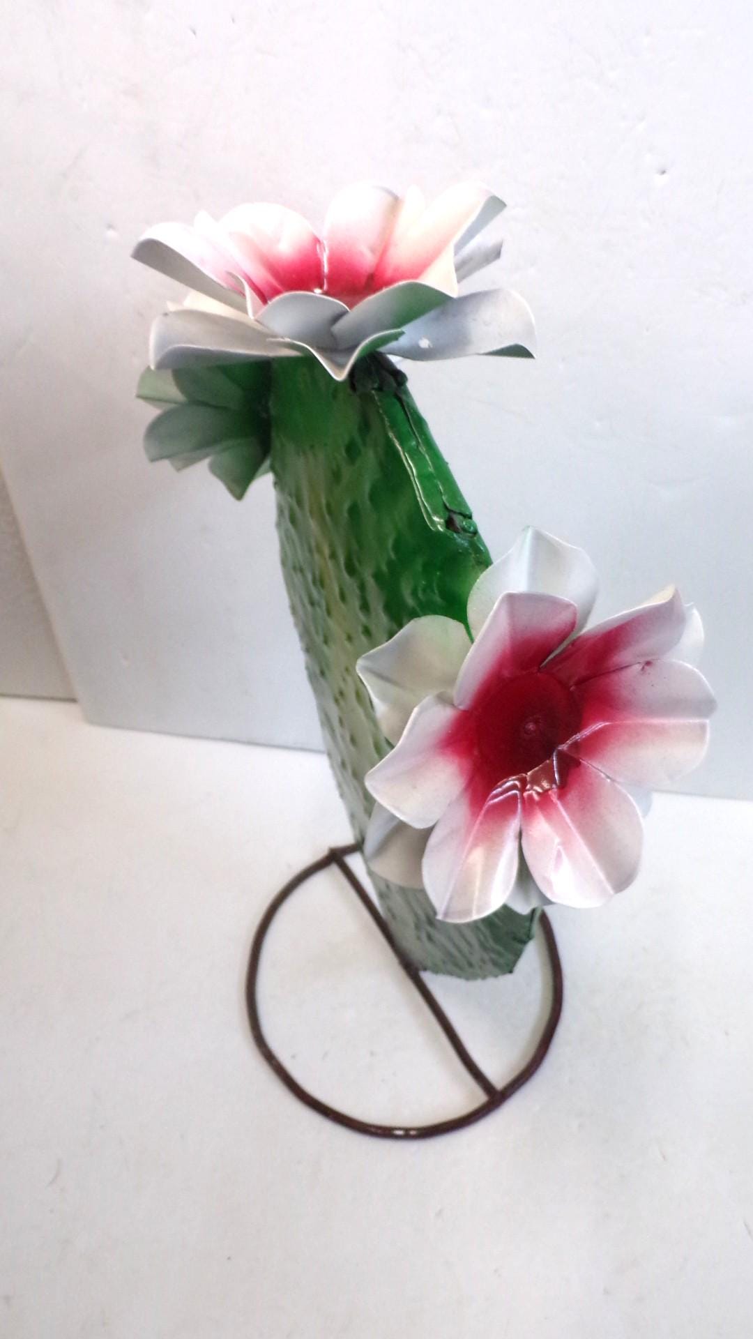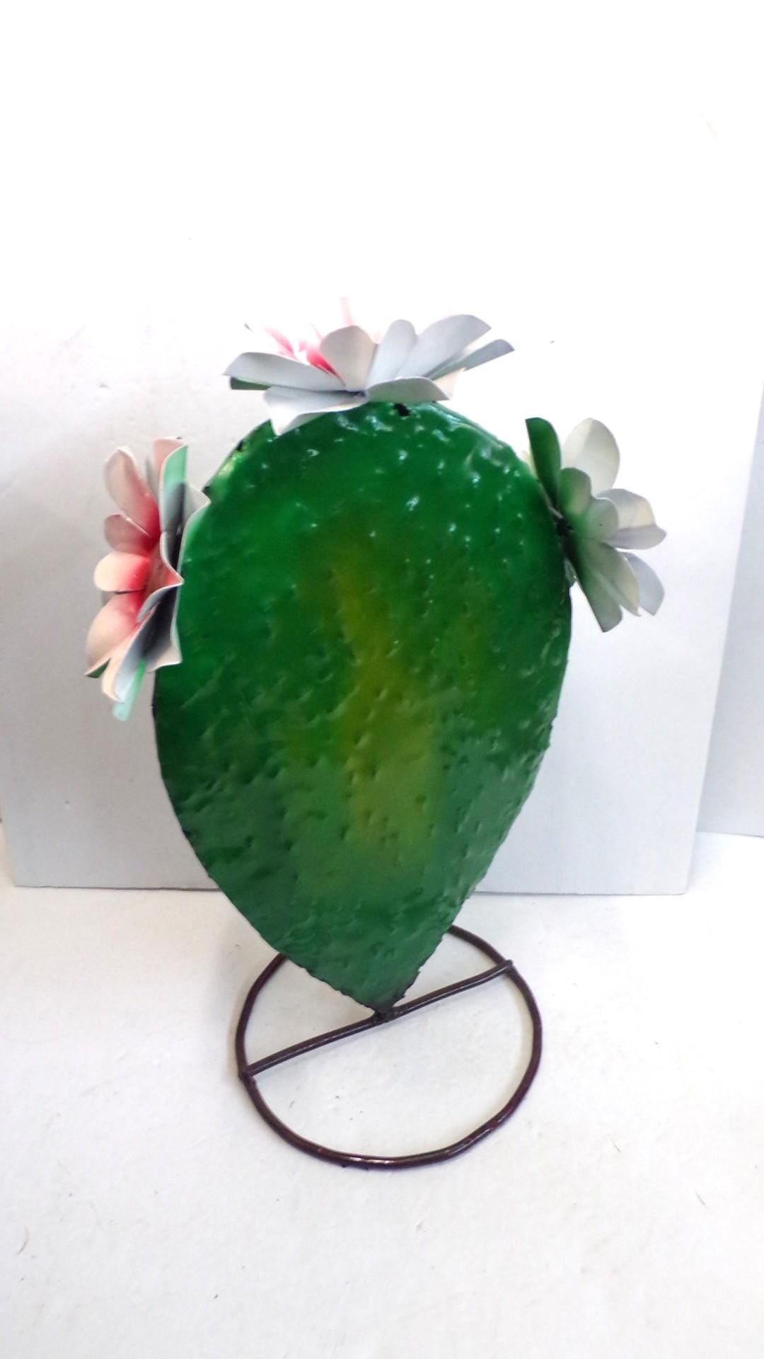 Prickly Pear Nopal Barrel Cactus | 17.5" Metal Artisan Yard Art | With 3 Flowers. Because they are handmade there can be minor flaws, but the overall look is quite impressive. This one measures roughly 10" wide by 17 1/2" tall. We'll be adding many more beautiful metal art one-of-a-kind cactuses in many sizes so keep on coming back to see what we have. This Metal Yard Art Cactus is made by a good artisan friend of mine in Mexico. This cactus would look so nice in your home, patio, or place of business. Shop where so many home interior designers shop for unique pieces. They would also make a wonderful gift for your friends or loved ones. So, why ever buy something just ordinary?
