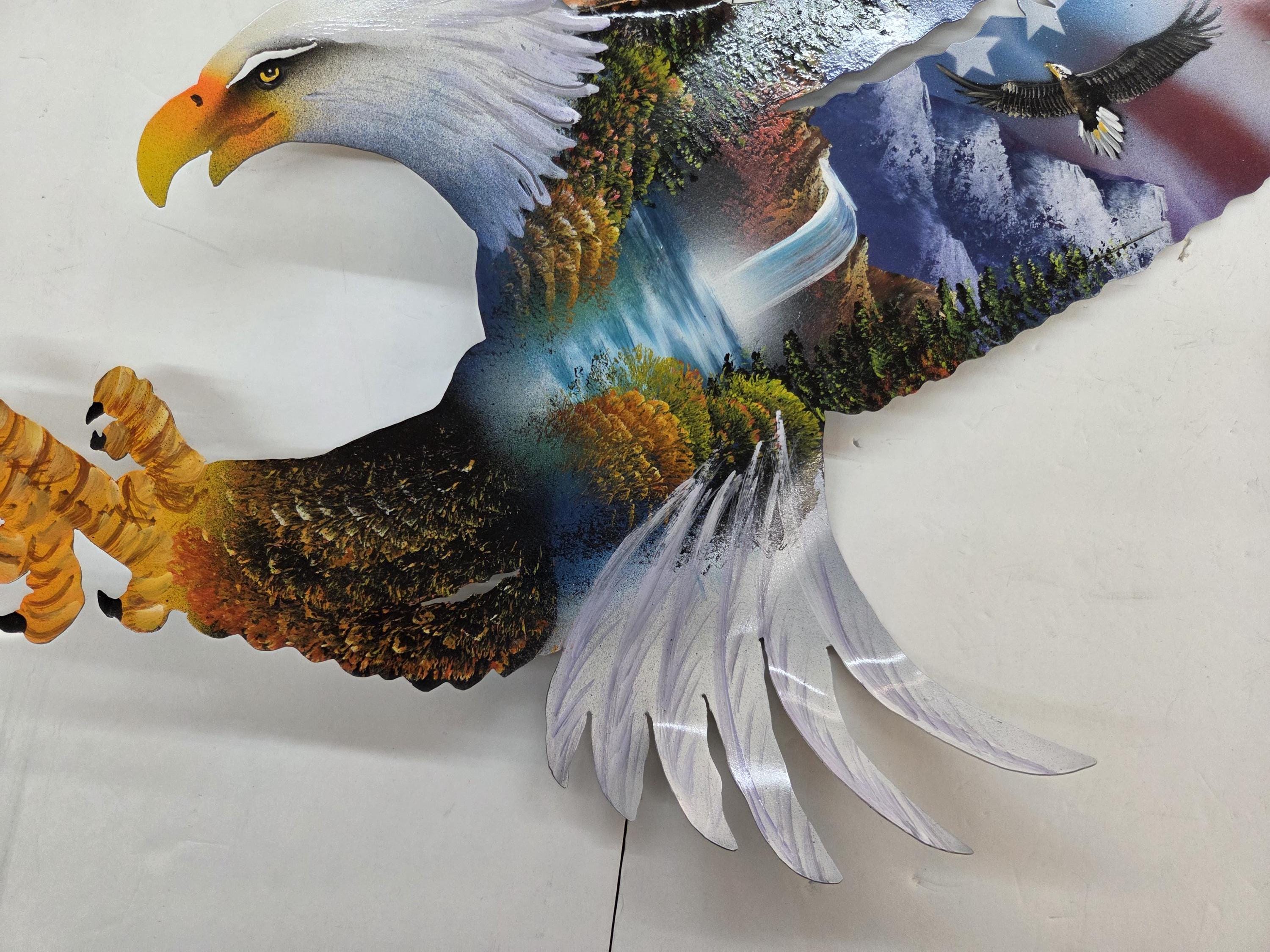 Hand Painted Bald Headed Eagle on 25" Metal Laser Cut Eagle Cutout. You will be getting the one-sided painted laser cut metal cutout that is actually shown in the pictures above. Roughly measures 22" tall by 25" wide very irregular. protrudes out just a bit. This would make a great gift for a friend or a loved one. So, why ever just gift something ordinary? We will soon have many different types and styles of beautiful hand painted art items to choose from. Favorite us now and then keep on checking back with us to see all the new items that we'll be adding.