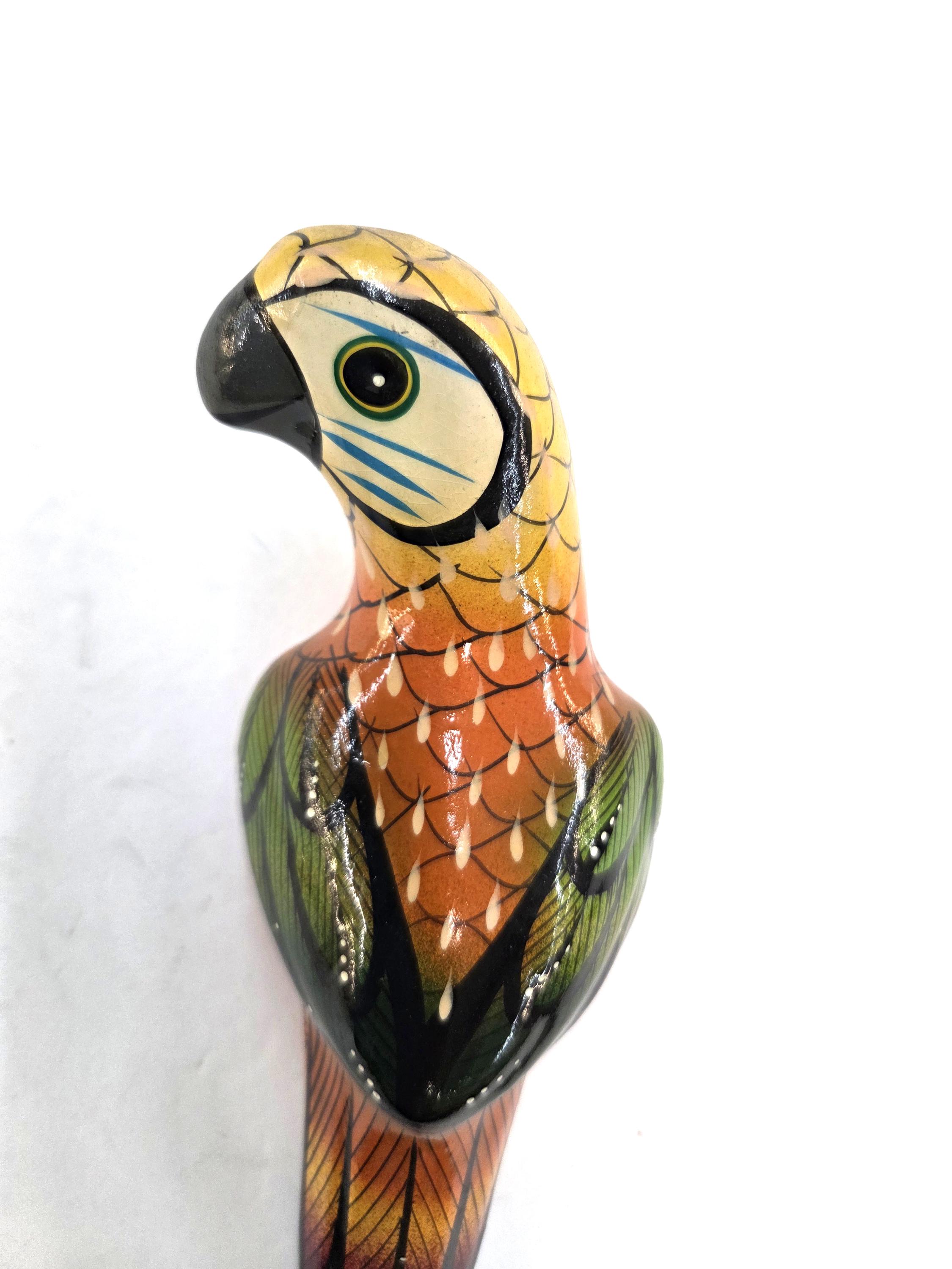 THIS ITEM. Beautiful Hanging Parrot on a Metal Perch. Handmade, Hand-Painted, Ceramic Pottery Parrots Made by a Mexico Artisans. You will be getting the parrot as actually shown in our pictures rather than something just kinda like them. Each parrot is handmade by Mexico Artisans and hand-painted, rather than machine made, so sometimes there can be minor flaws, but the overall look is always very beautiful and impressive. This parrot is roughly 8.5" tall by about 3 1/2" wide irregular, not including the metal perch. We normally have some more parrots in different colors and sizes in our Etsy shop to choose from. This would also make a lovely present for a friend or a loved one. So, why ever gift something just ordinary? Shop where so many home decorators do, right here. I am not the world's greatest photographer so I may not have the best pictures out there, but my prices certainly are the greatest so WHY PAY MORE?