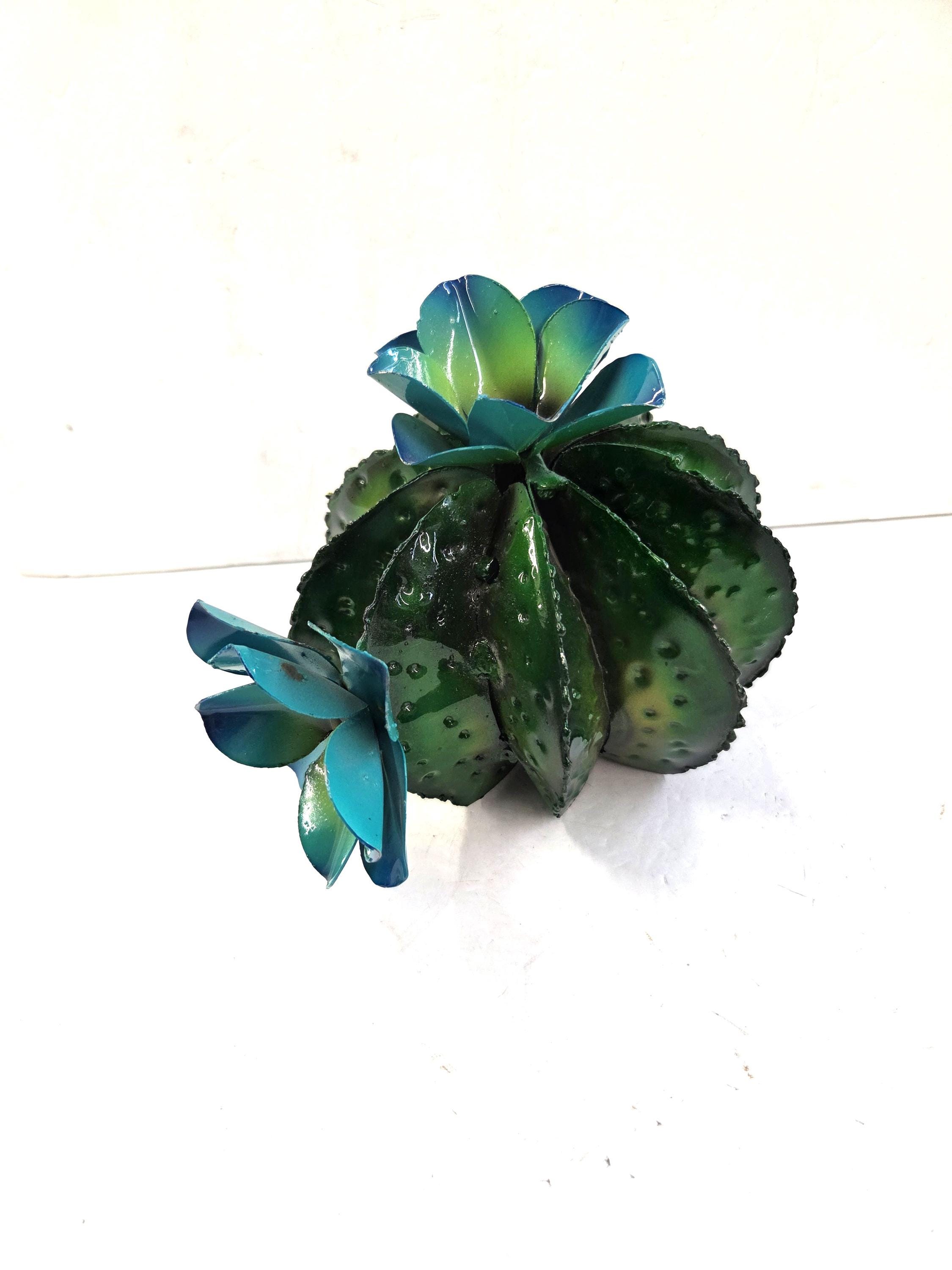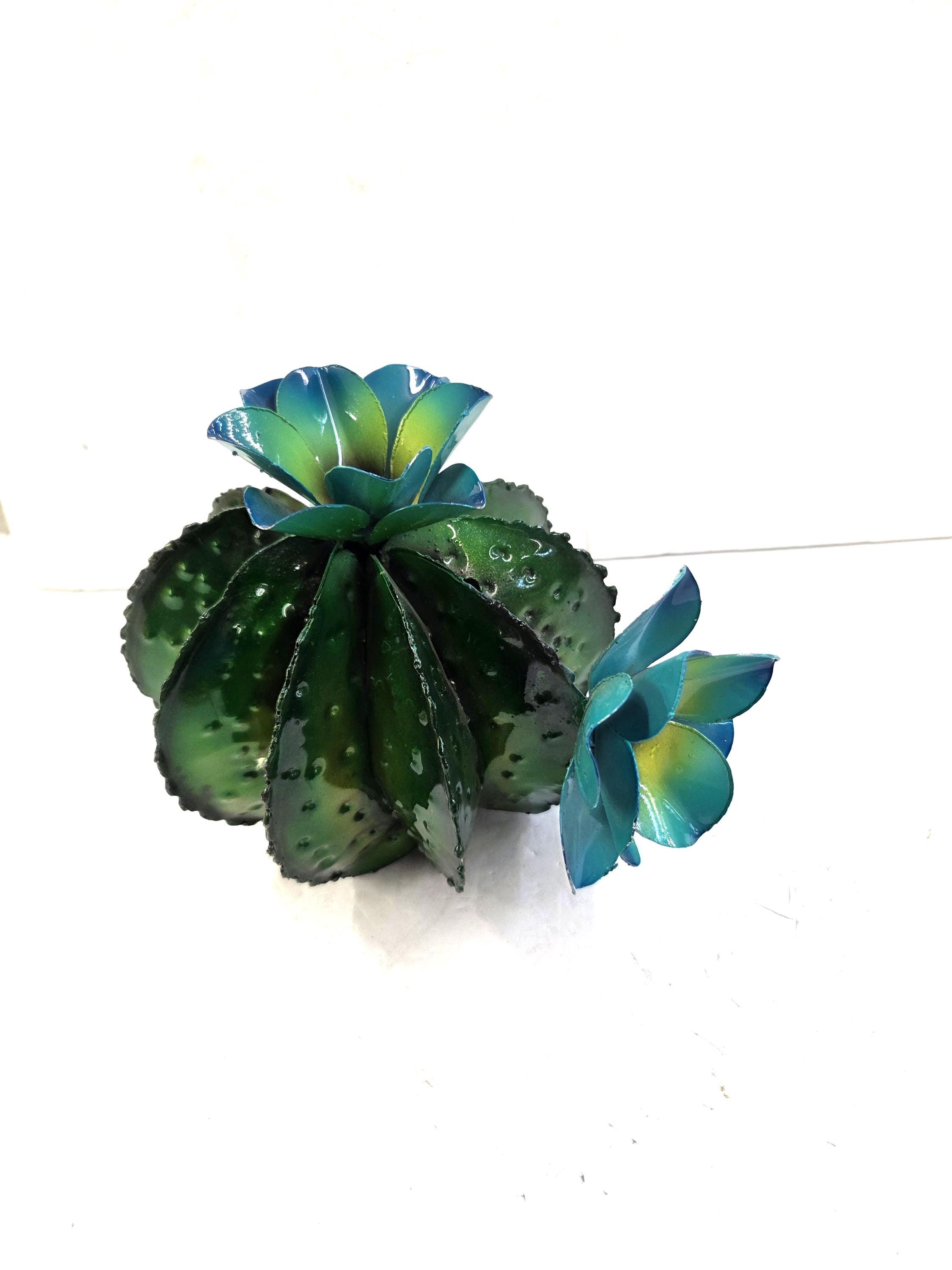 Handmade 8" Barrel Saguaro Type Barrel Cactus with 2 Flowers, Mexico Artisan Metal Folk Art. Handmade items may sometimes have minor flaws, but the overall look is always quite impressive. Measures roughly 8" wide by 7" tall irregular. You would be getting the actual item shown in the pictures. If still available there may be some other colors to choose from. These are made by a good friend of mine in Mexico. This beautiful cactus would look so nice in your home, patio, or place of business. They would also make wonderful gifts for friends and loved ones so why ever gift something just ordinary?