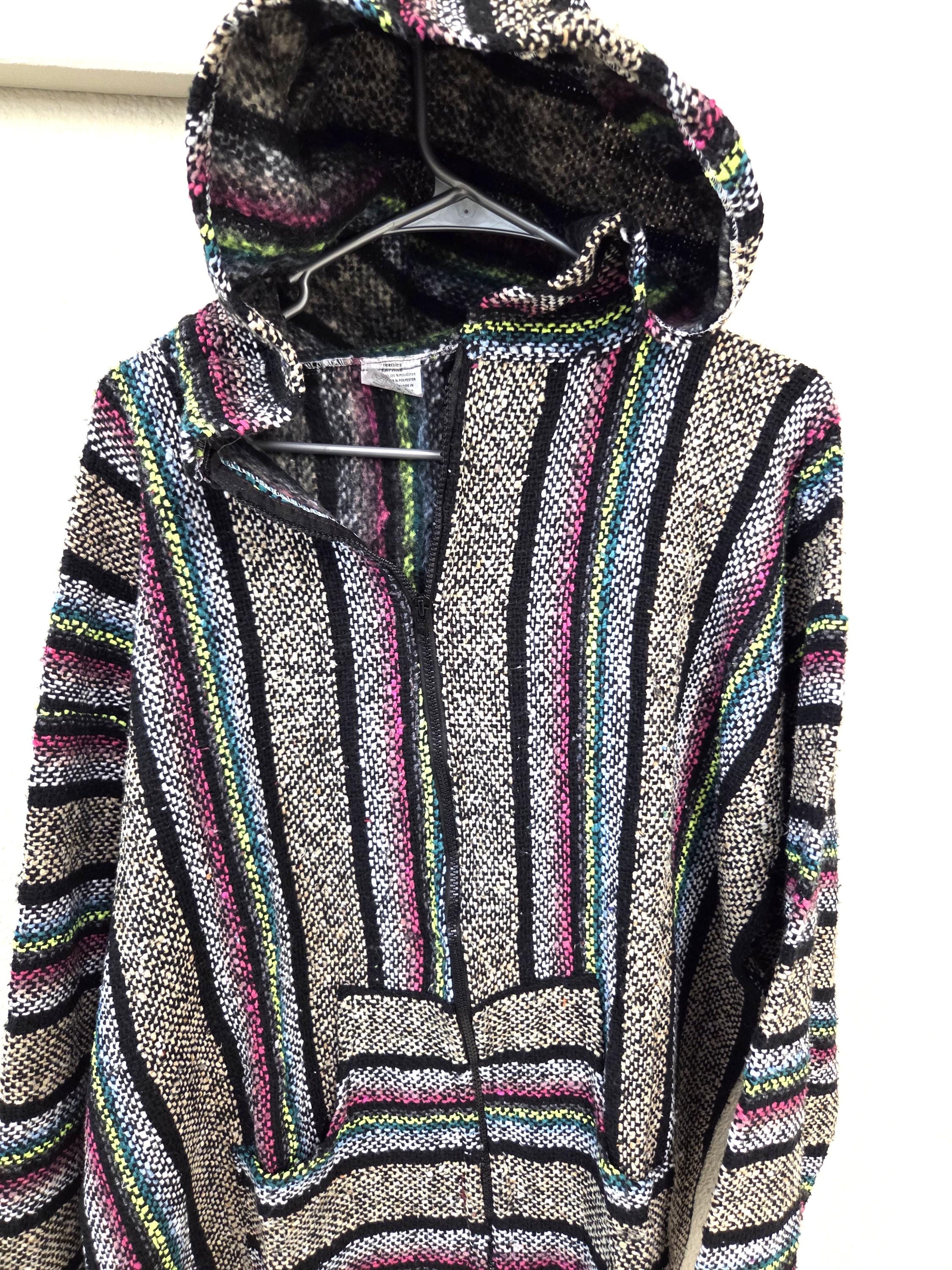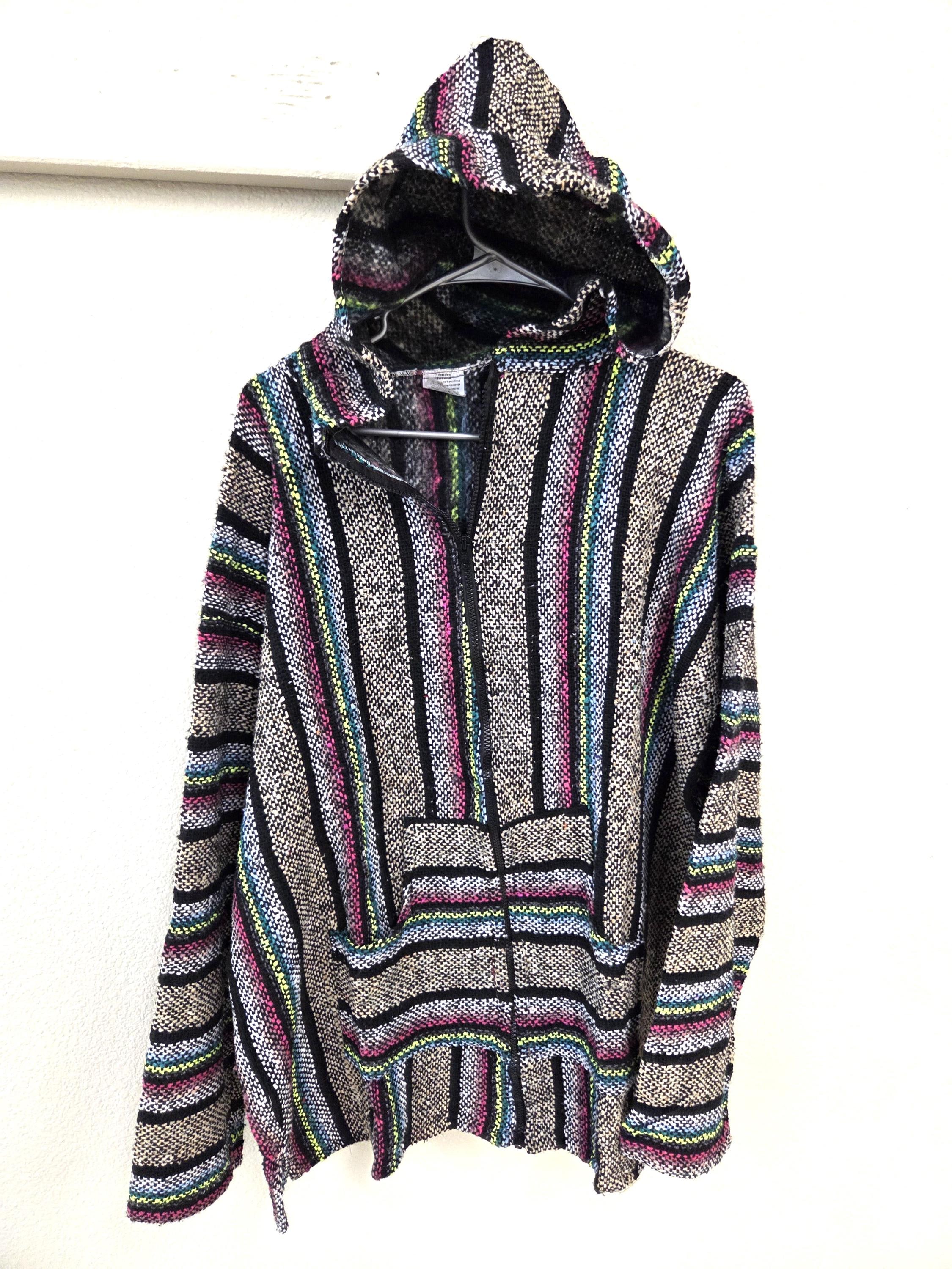 Much Preferred Zipper Baja Surfer Beach Hoodie Drug Rug Poncho – Serape Jacket from Mexico. As Pictured Here, Awesome!! This poncho would look great on the guys and even much better on our lovely lady friends. Has a nice hand warmer pocket in front. You will be getting the poncho that is actually shown above in the pictures above, not some poncho that looks kinda looks like it or is kinda the same color as you might sometimes see elsewhere. We will soon have many different styles & colors of ponchos to pick from in many different sizes. You may also want to check out our awesome pullover ponchos. This would also make a great gift for a friend or a loved one. So, why ever gift something just ordinary?