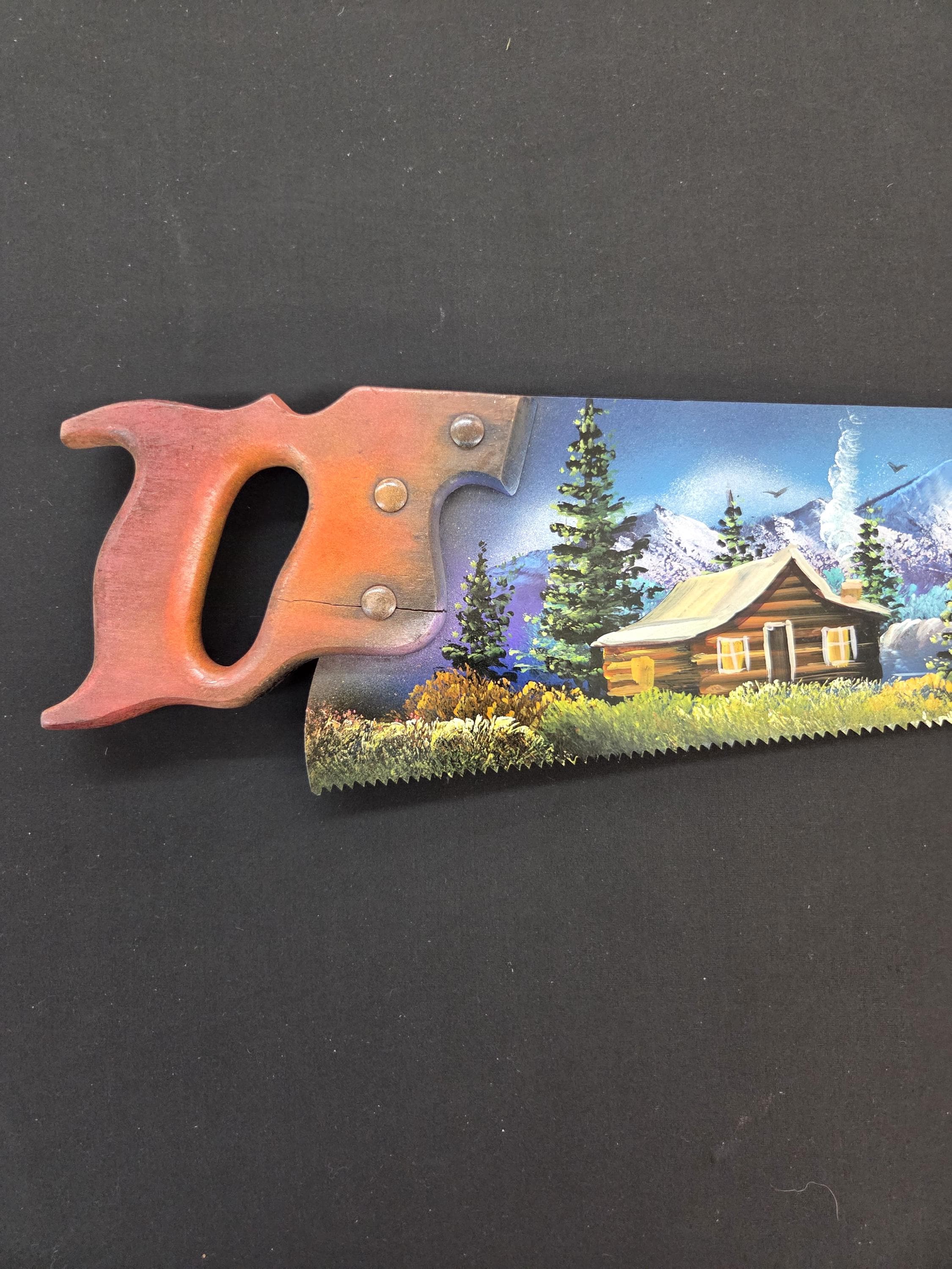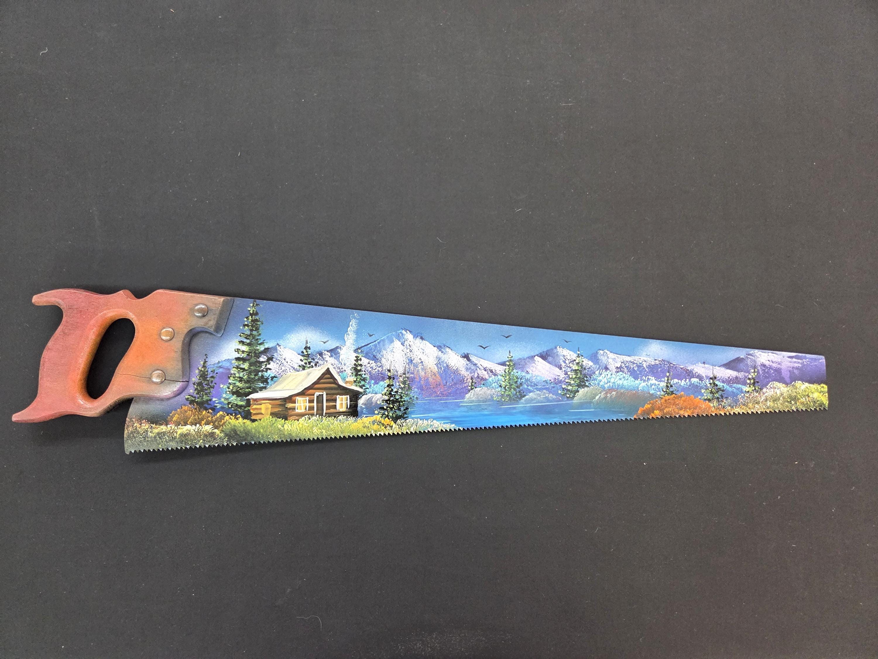 Beautiful Hand Painted Carpenters Hand Saw Blade! You will be getting the one-sided painted saw blade that is actually shown in the pictures above. These saws aren't new so you may see some cracks, missing nuts, etc. on the old blades and handles which just adds to the ambience of the item. This saw measures roughly 30" by 6" irregular. This would make a great gift for a friend or a loved one. So, why ever just gift something ordinary? Shop where so many home and business decorators come to find unique often one-of-a-kind items. We will soon have many different types and styles of saws and other beautiful hand painted art items to choose from.
