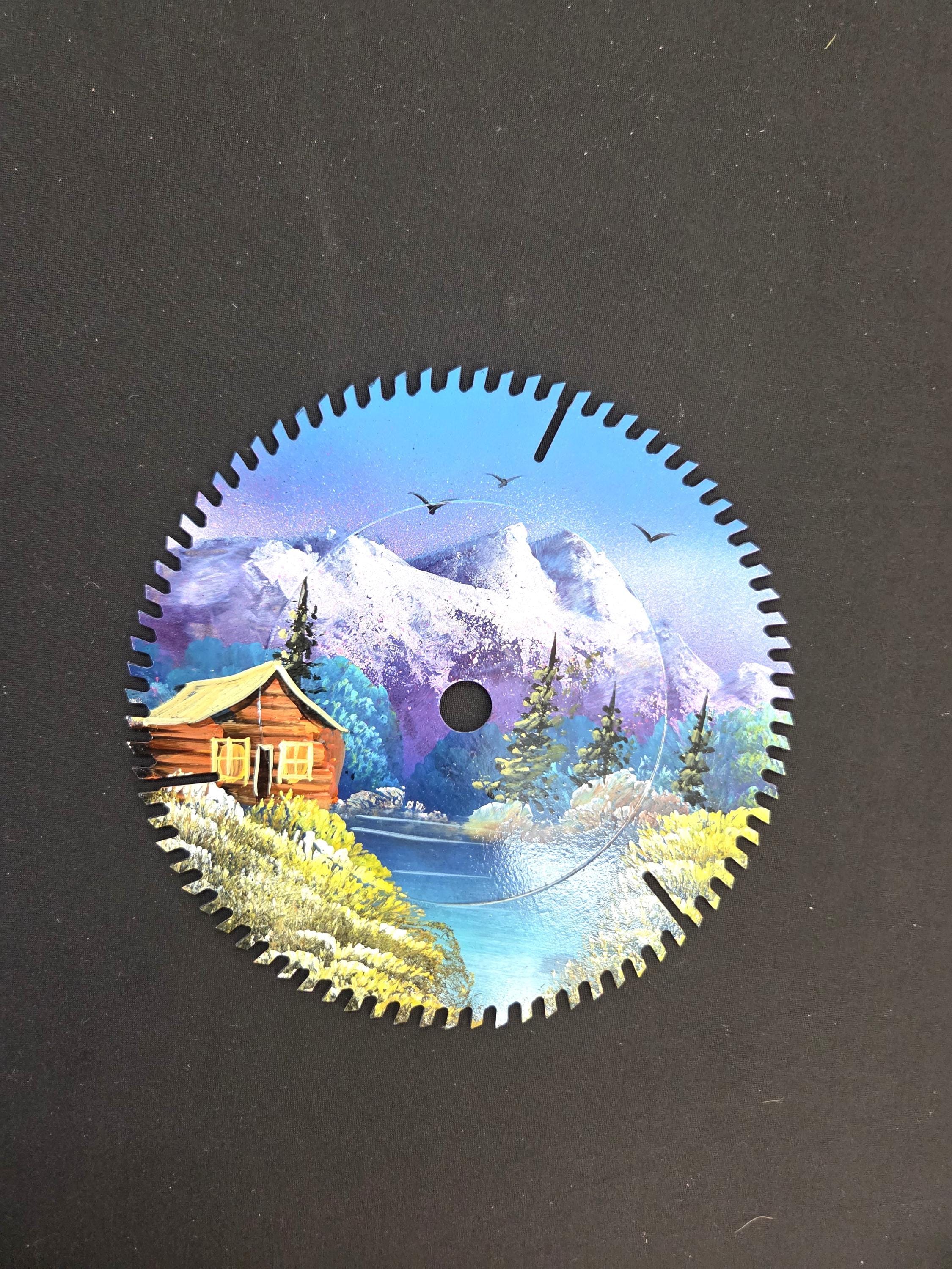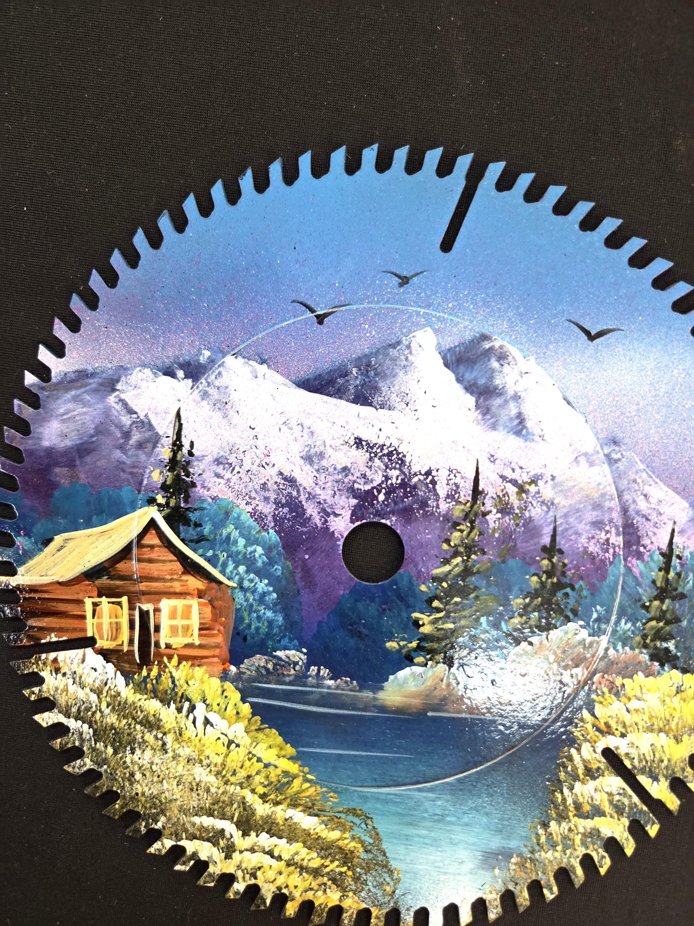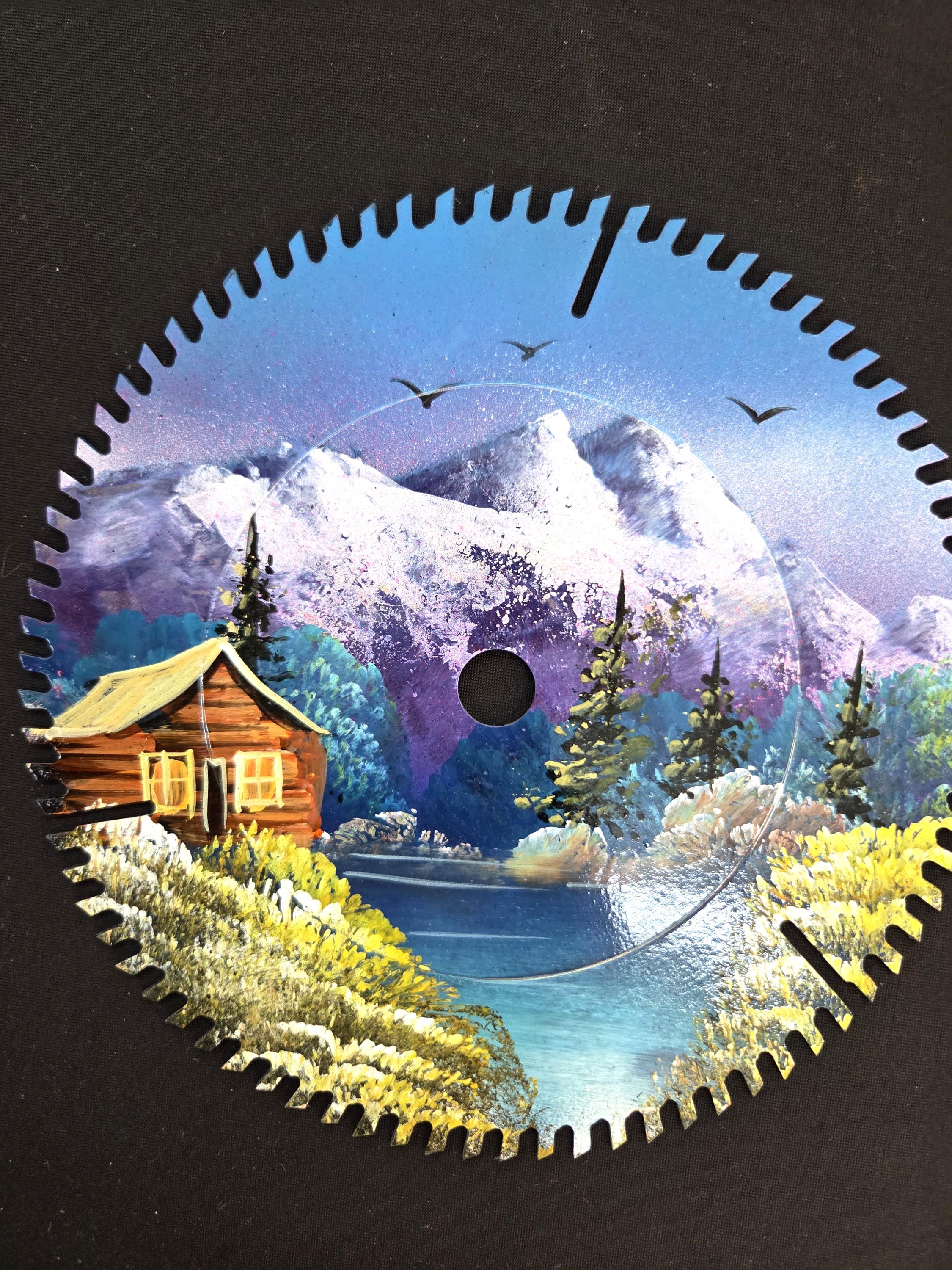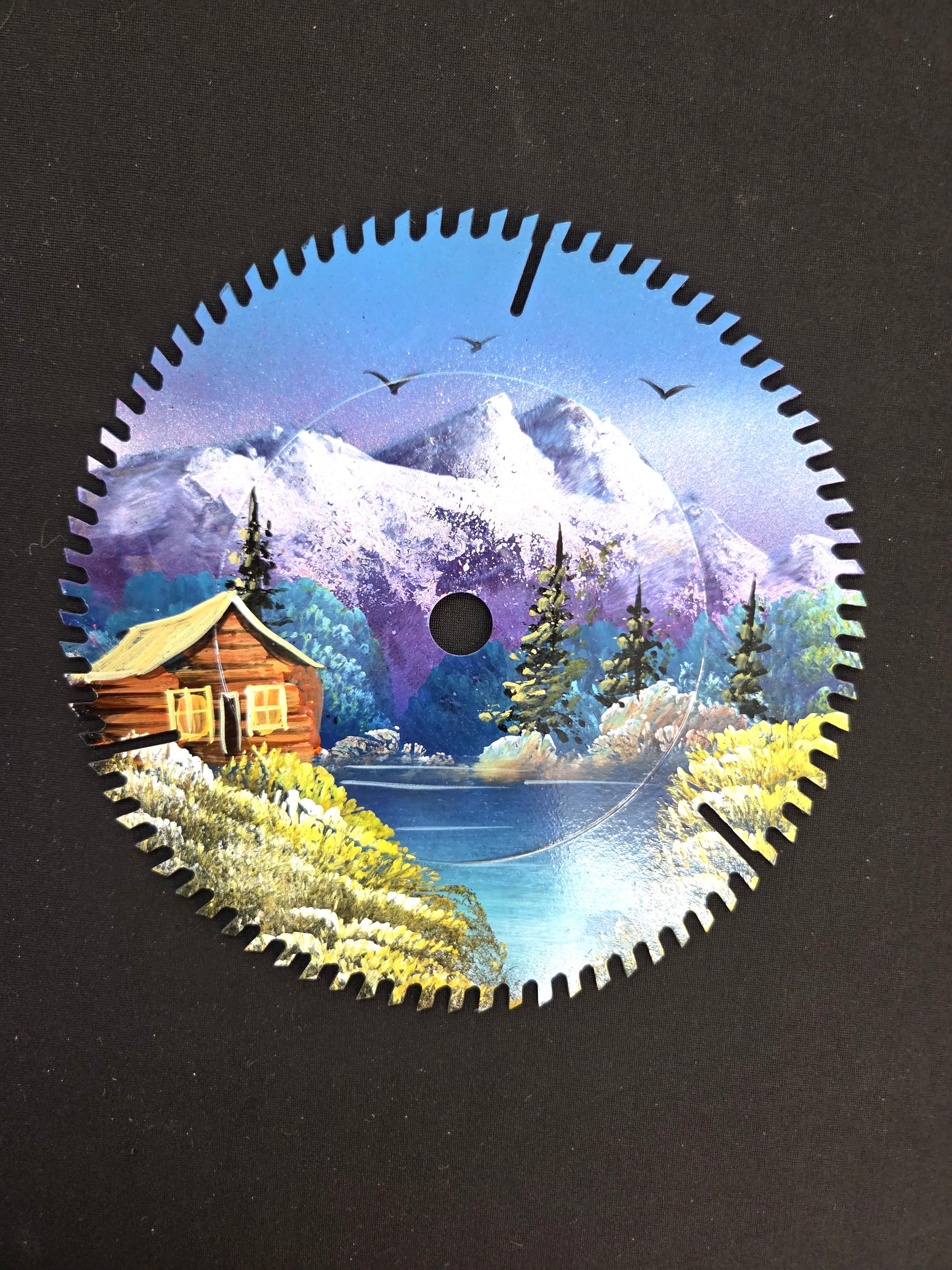 Hand Painted 8" Saw Blade Cabin on Lake Scene as pictured painted by a good artist friend in Mexico. You will be getting the one-sided painted saw blade that is actually shown in the pictures above. Many of these saw blades saws aren't new, but some are. This would make a great gift for a friend or a loved one. So, why ever just gift something ordinary? Shop where so many home and business decorators come to find unique often one-of-a-kind items. We will soon have many different types and styles of saws and other beautiful hand painted art items to choose from.