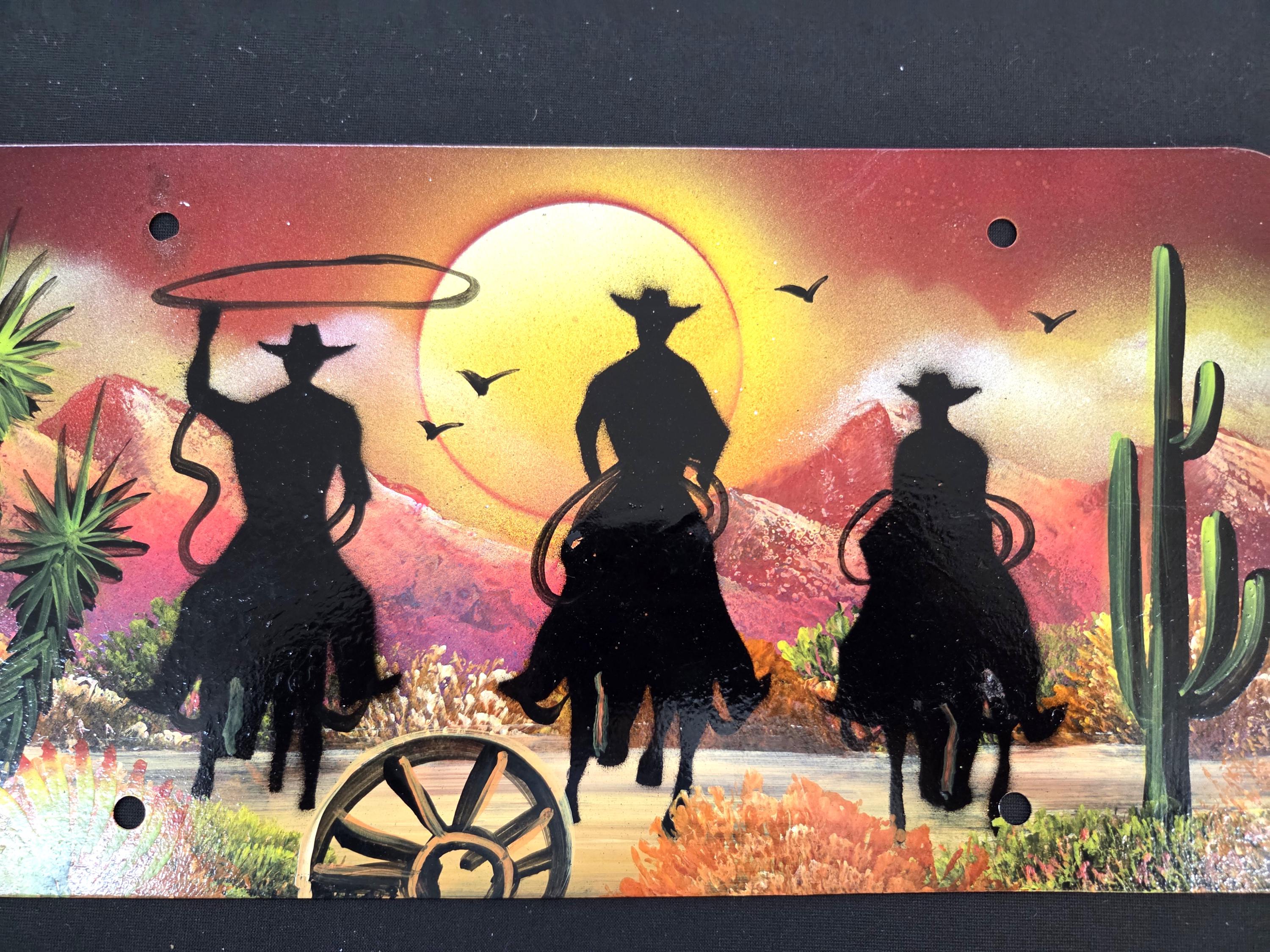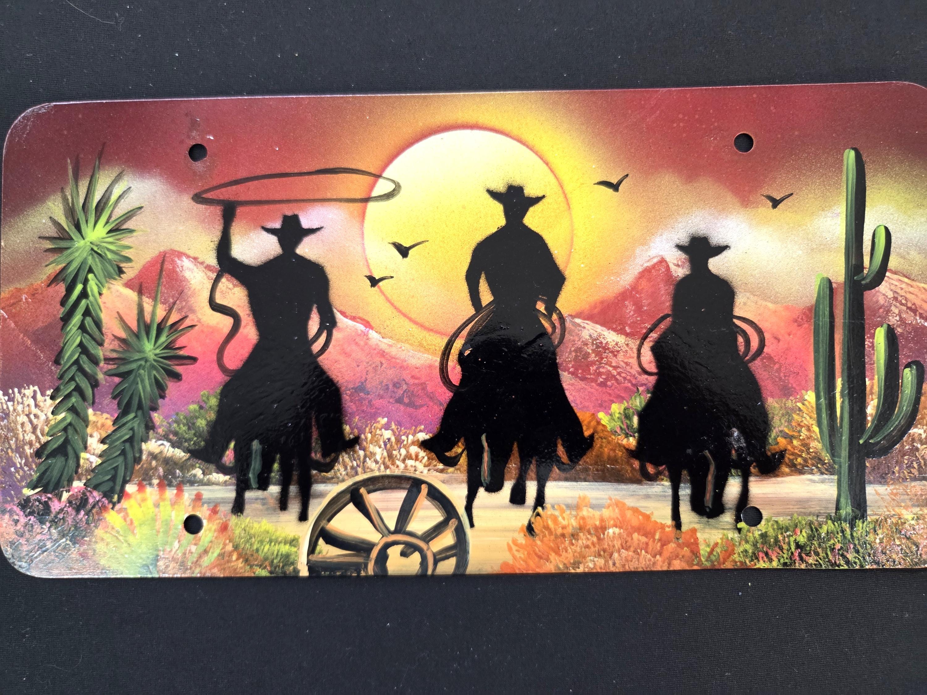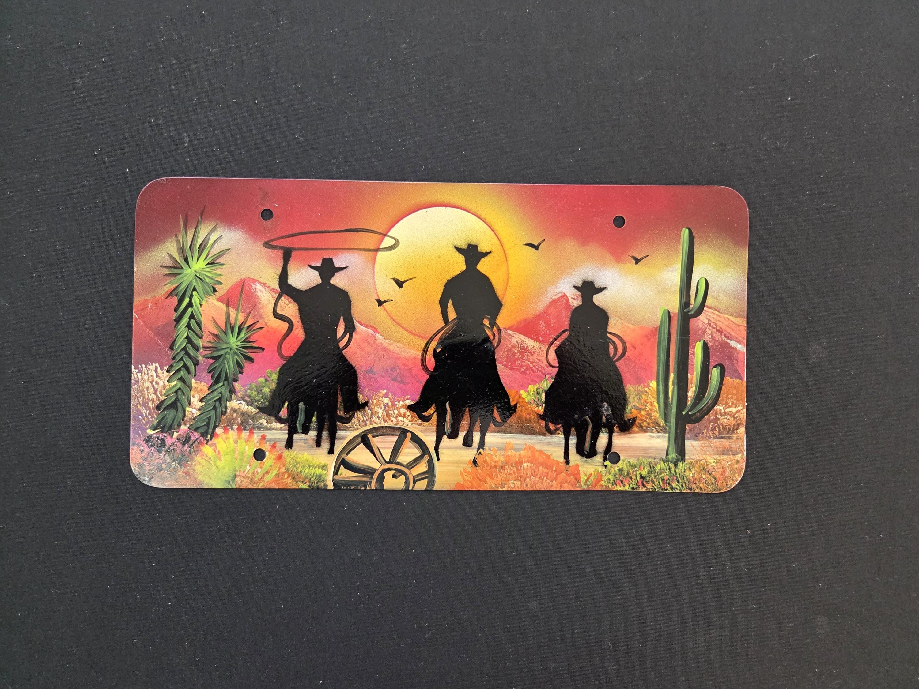 Cowboys, Cactus, Wagon Wheel, & Mountains Hand Painted Western License Plate. You will be getting the one-sided painted license plate that is shown in the pictures above. You are an original so why shouldn't your license plate also reflect that? This license plate measures roughly 12" by 6" irregular. Anything handmade may be a little imperfect but these items always look quite beautiful. This would make a great gift for a friend or a loved one. So, why ever just gift something ordinary? Shop where so many home and business decorators come to find unique often one-of-a-kind items. We will soon have many different types and styles of saws and other beautiful hand painted art items to choose from.