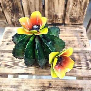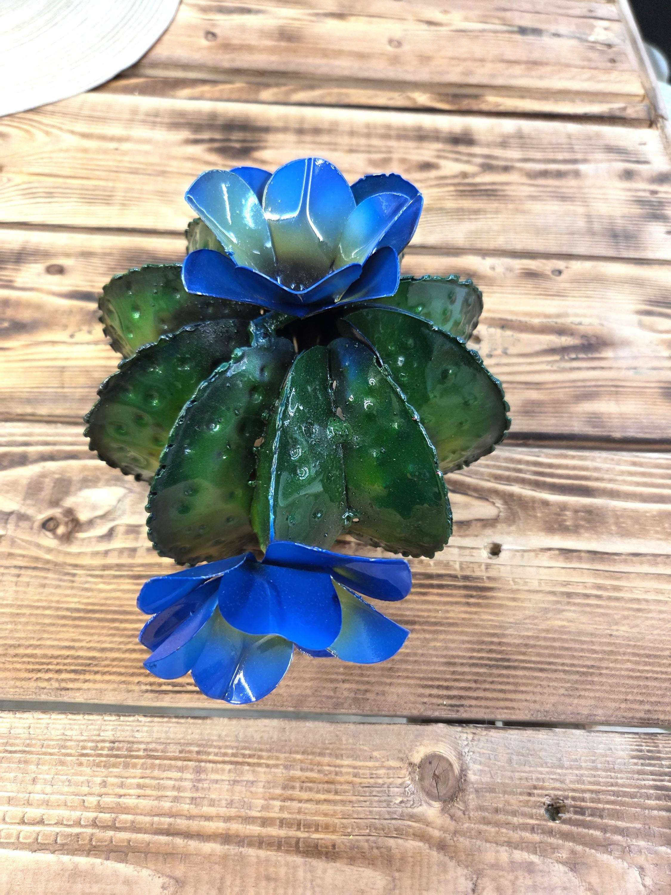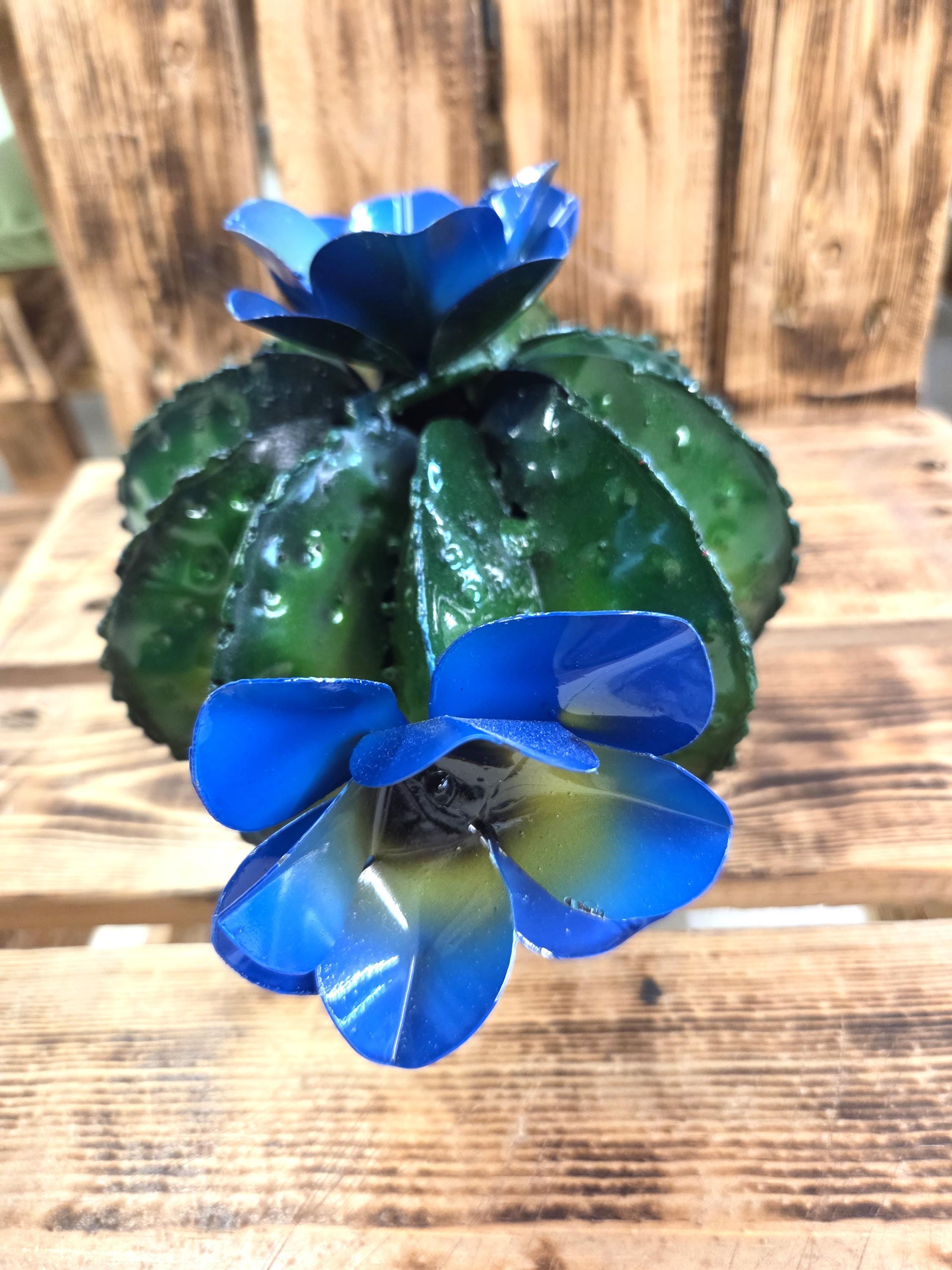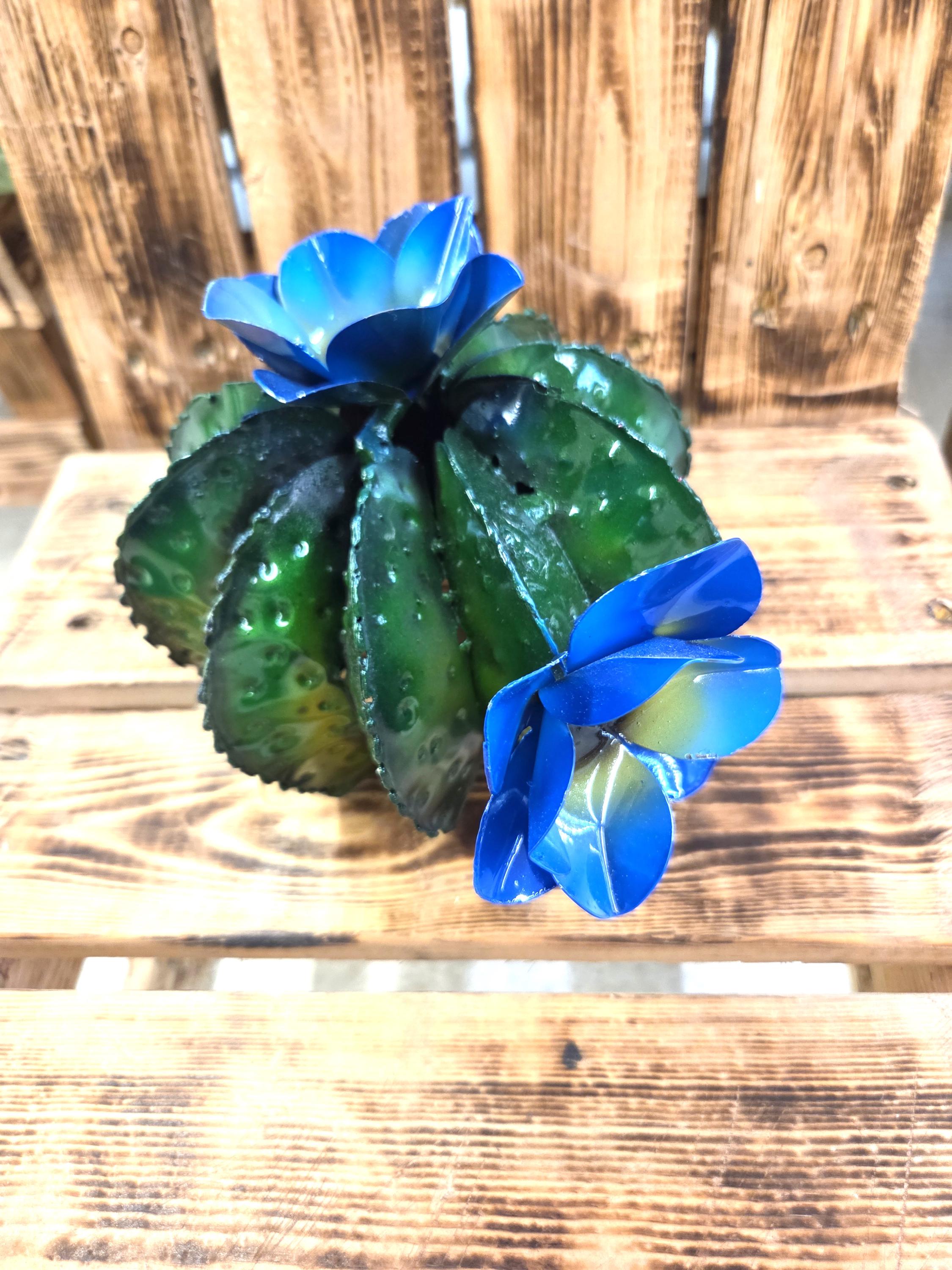 Handmade 9" Barrel Saguaro Type Barrel Cactus with 2 Flowers, Mexico Artisan Metal Folk Art. Handmade items may sometimes have minor flaws, but the overall look is always quite impressive. Measures roughly 8.5" wide by 6 1/2" tall irregular. You would be getting the actual item shown in the pictures. If still available there may be some other colors to choose from. These are made by a good friend of mine in Mexico. This beautiful cactus would look so nice in your home, patio, or place of business. They would also make wonderful gifts for friends and loved ones so why ever gift something just ordinary?