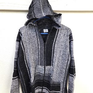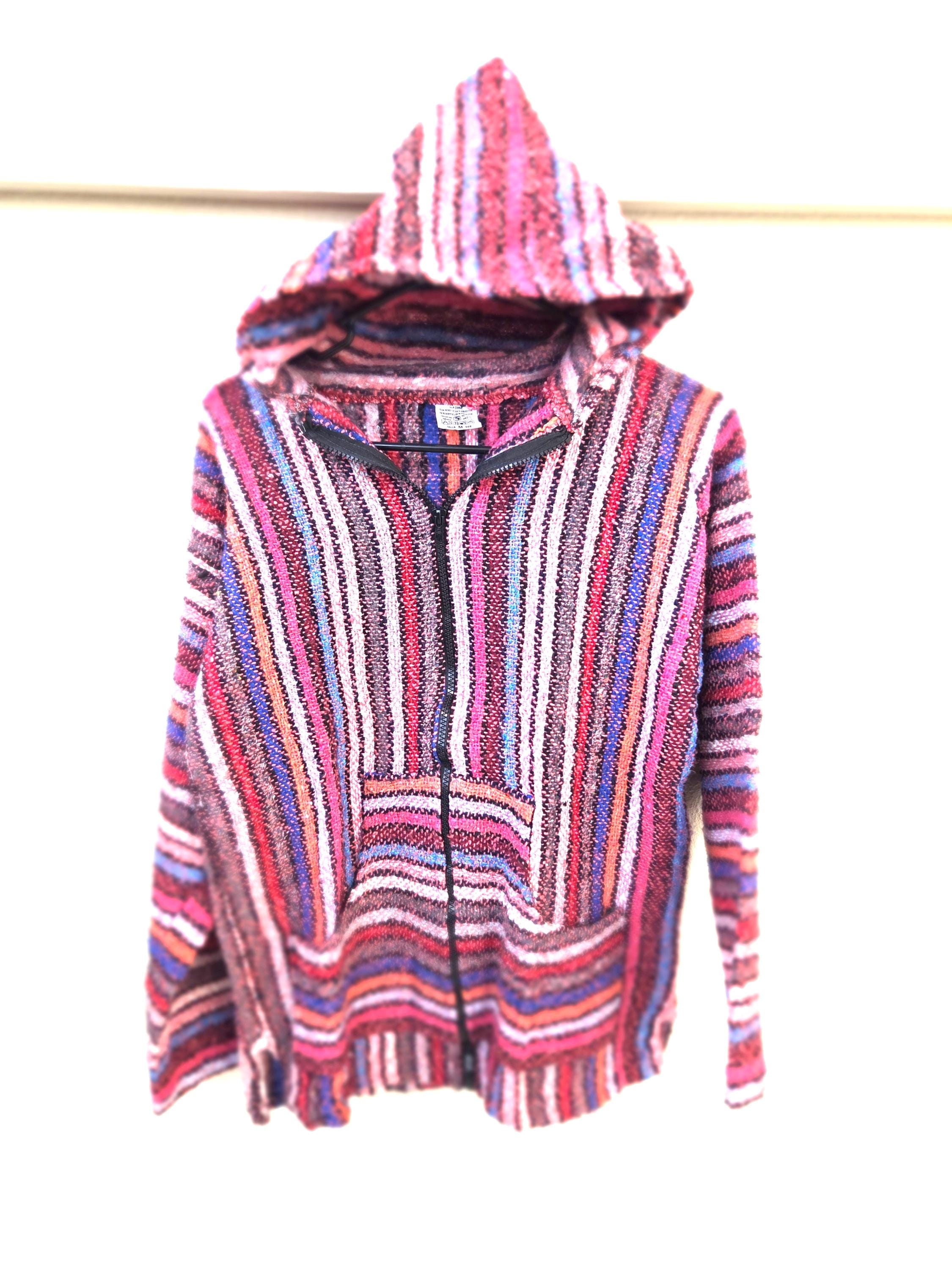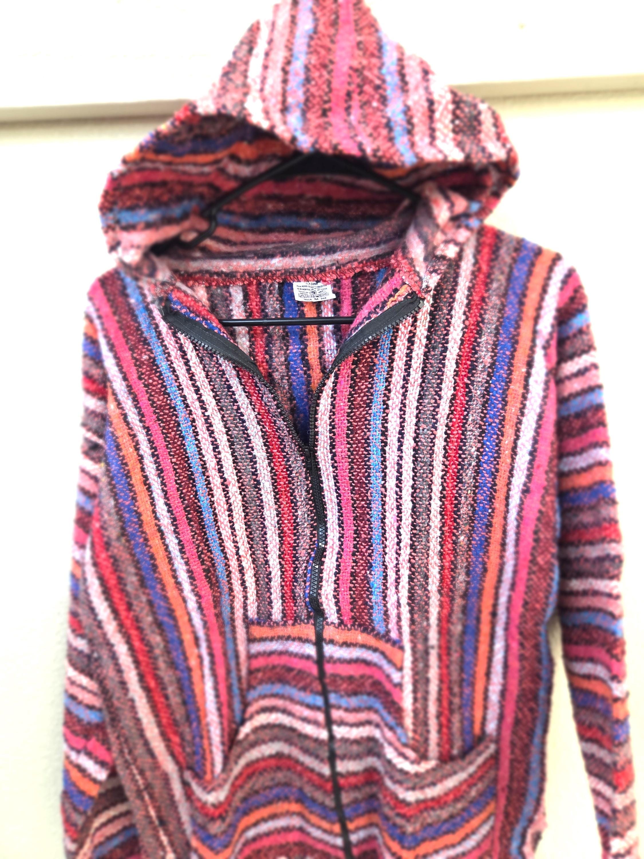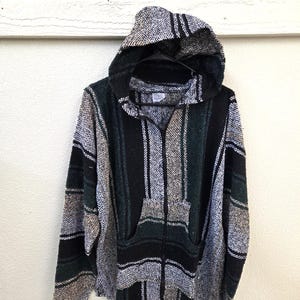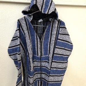 Much Preferred Zipper Unisex Baja Hooded Baja Poncho, Drug Rug, Beach Jacket, Serape from Mexico. As Pictured Here, Awesome!! This poncho would look great on the guys and even much better on our lovely lady friends. Has a nice hand warmer pocket in front. You will be getting the poncho that is actually shown above in the pictures above, not some poncho that looks kinda looks like it or is kinda the same color as you might sometimes see elsewhere. We will soon have many different styles & colors of ponchos to pick from in many different sizes. You may also want to check out our awesome pullover ponchos. This would also make a great gift for a friend or a loved one. So, why ever gift something just ordinary? Favorite us now and then keep on checking back with us to see all the new items that we'll be adding. I am not the world's greatest photographer so I may not have the best pictures out there, but my prices certainly are the greatest so WHY PAY MORE?