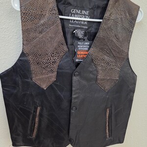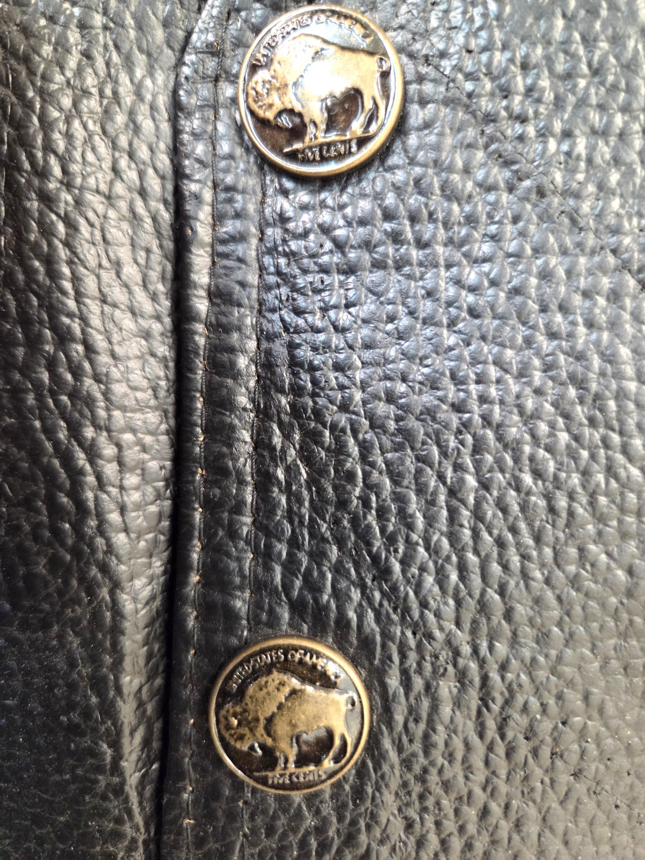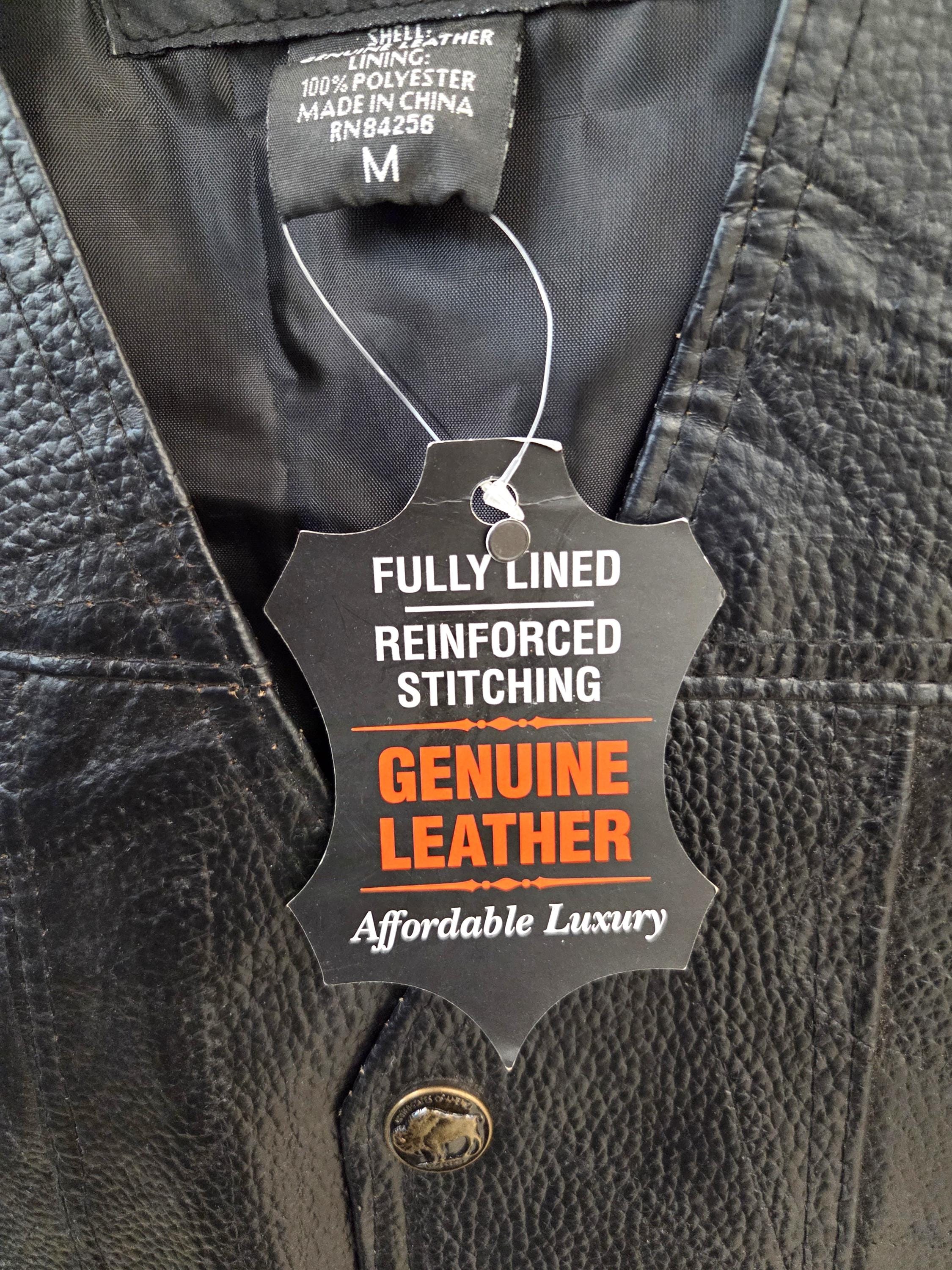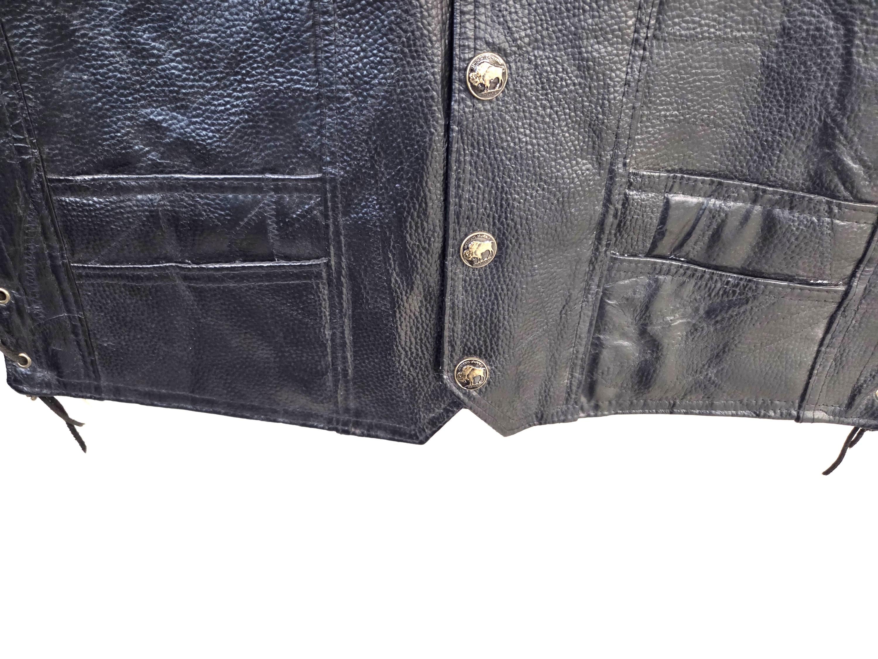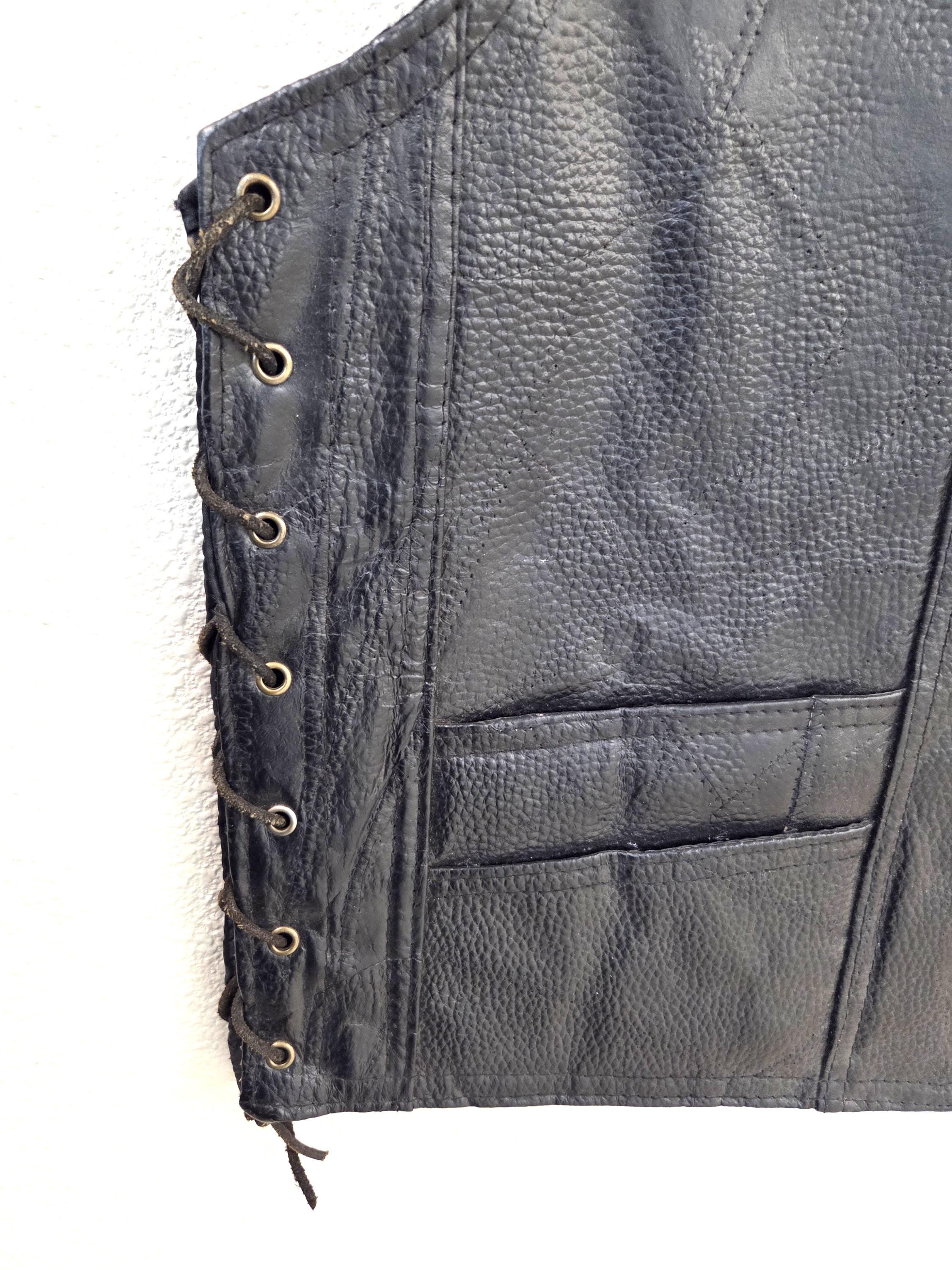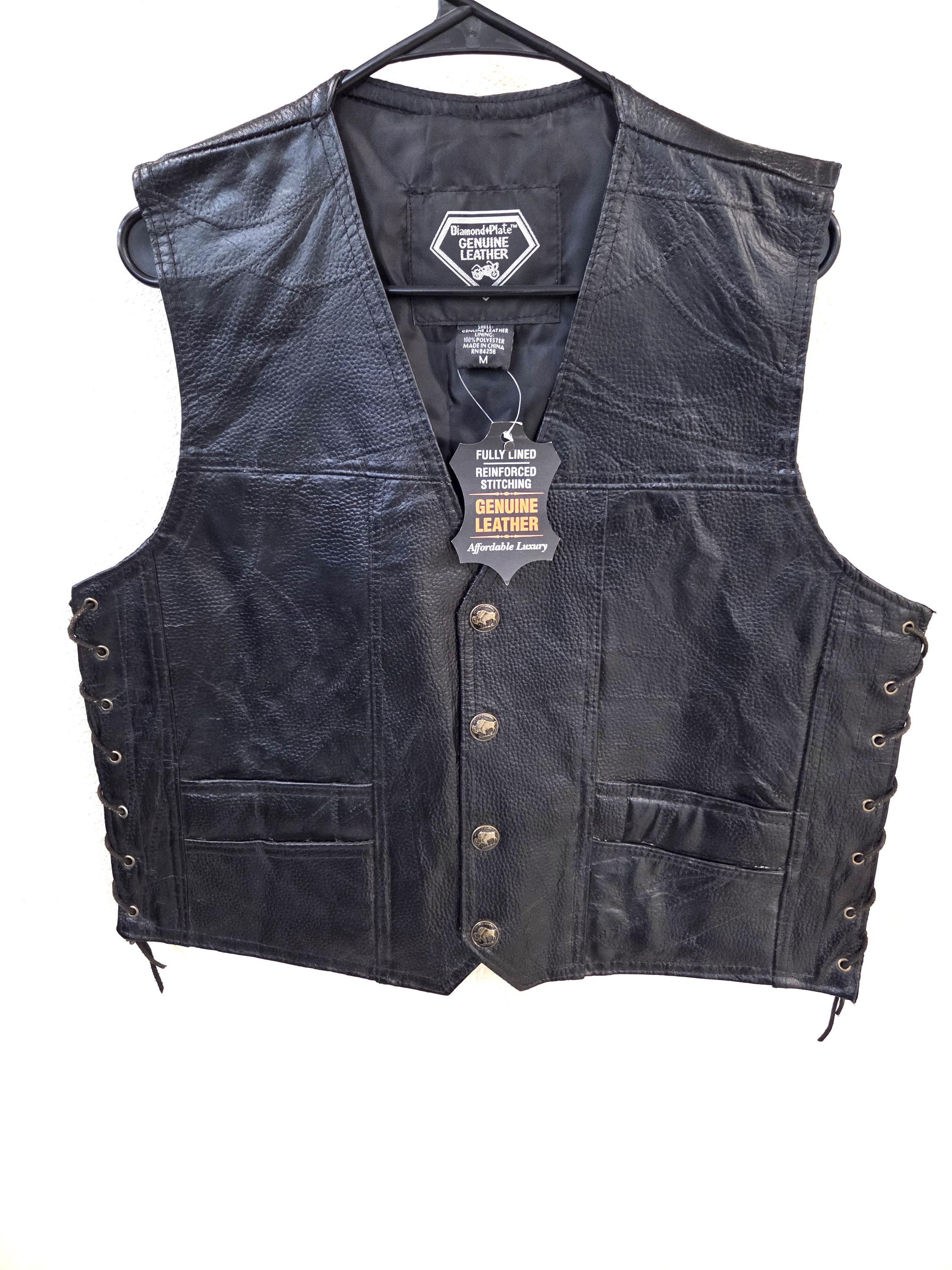 MEDIUM Leather Vest with Eagle & USA Flag on Back. Leather lace up sides you can let out if desired. Awesome buffalo snaps. Lining is polyester. 4 small front pockets. Last One In This Size. FREE SHIPPING. My pictures may not be the greatest, but my prices certainly are. And you can still add patches, conchos, vest extenders, or pins if you want even more bling. We also sell a lot of bikers accessories, patches, conchos and much more. WHY PAY MORE?