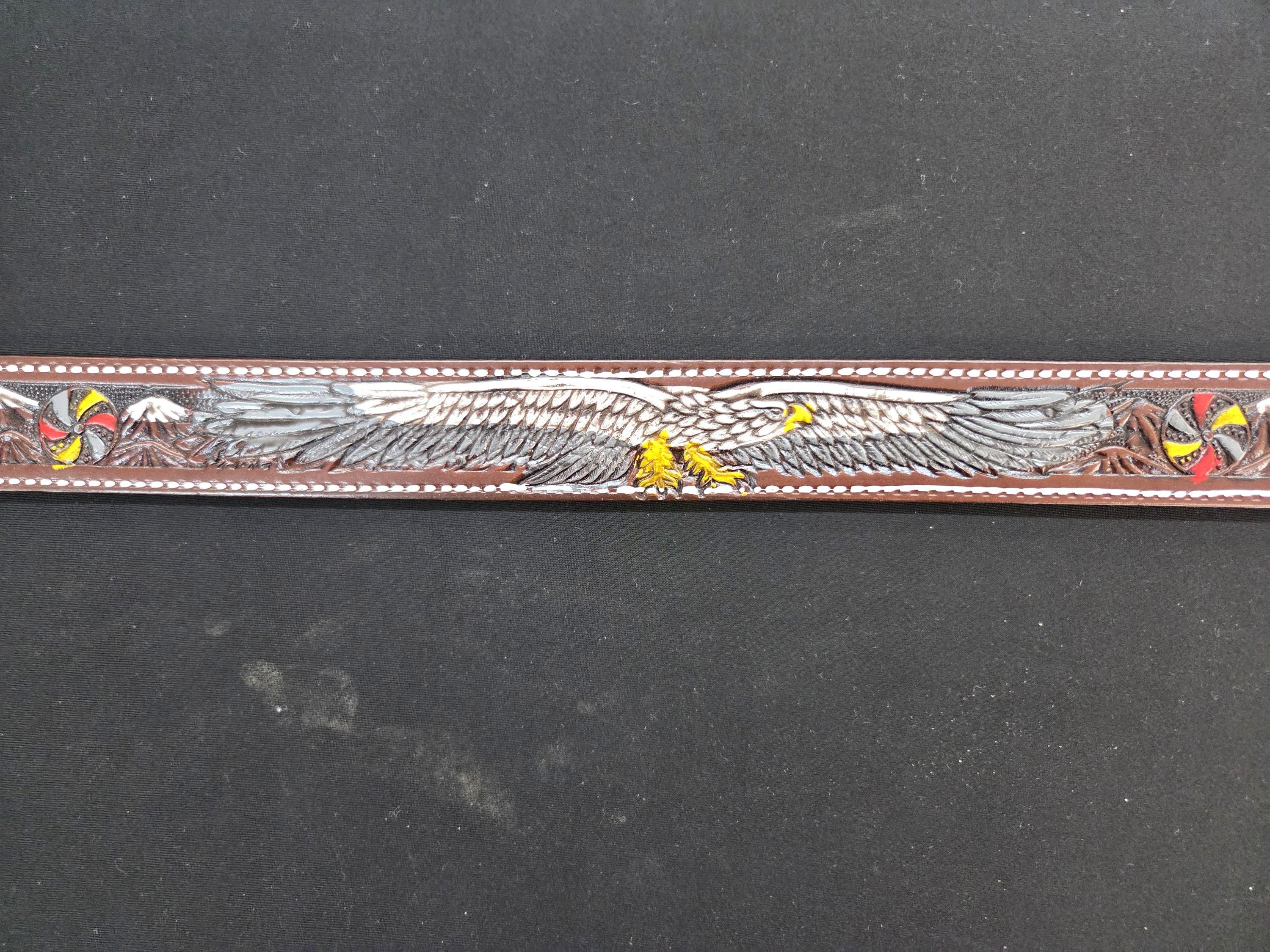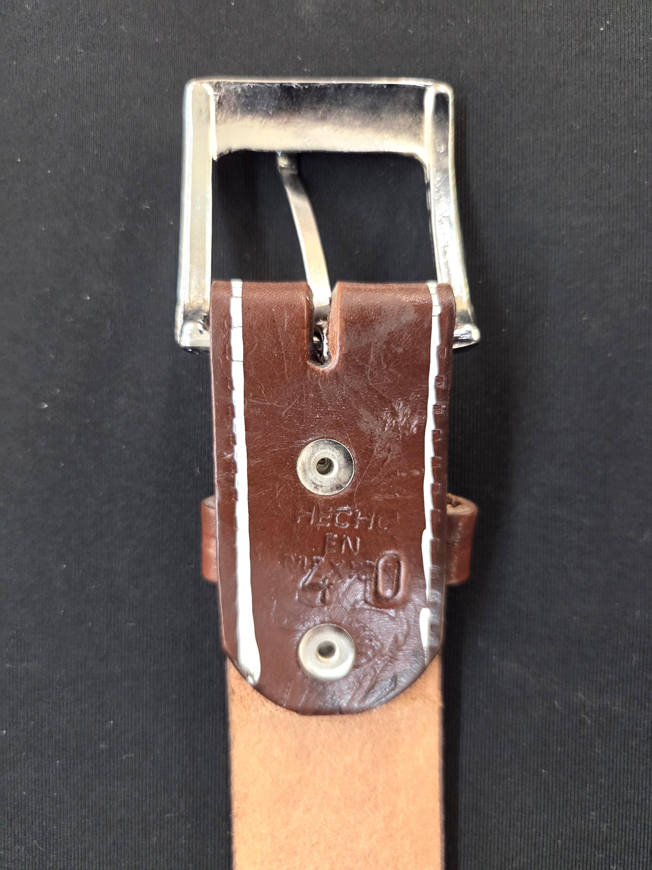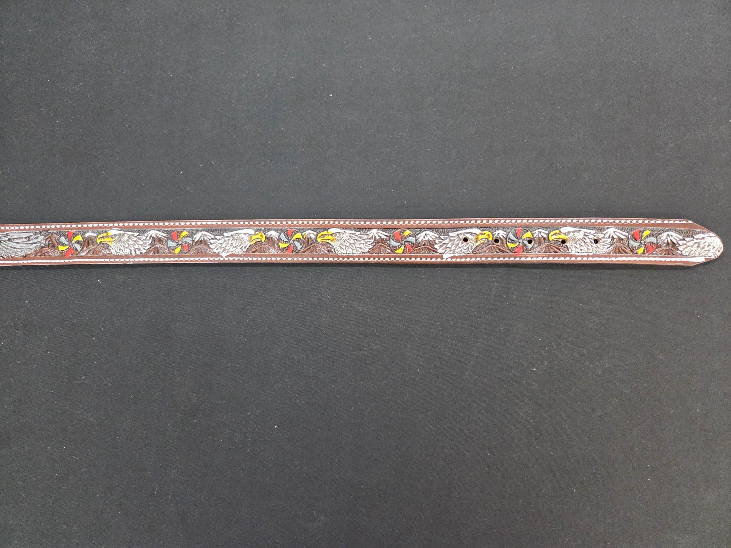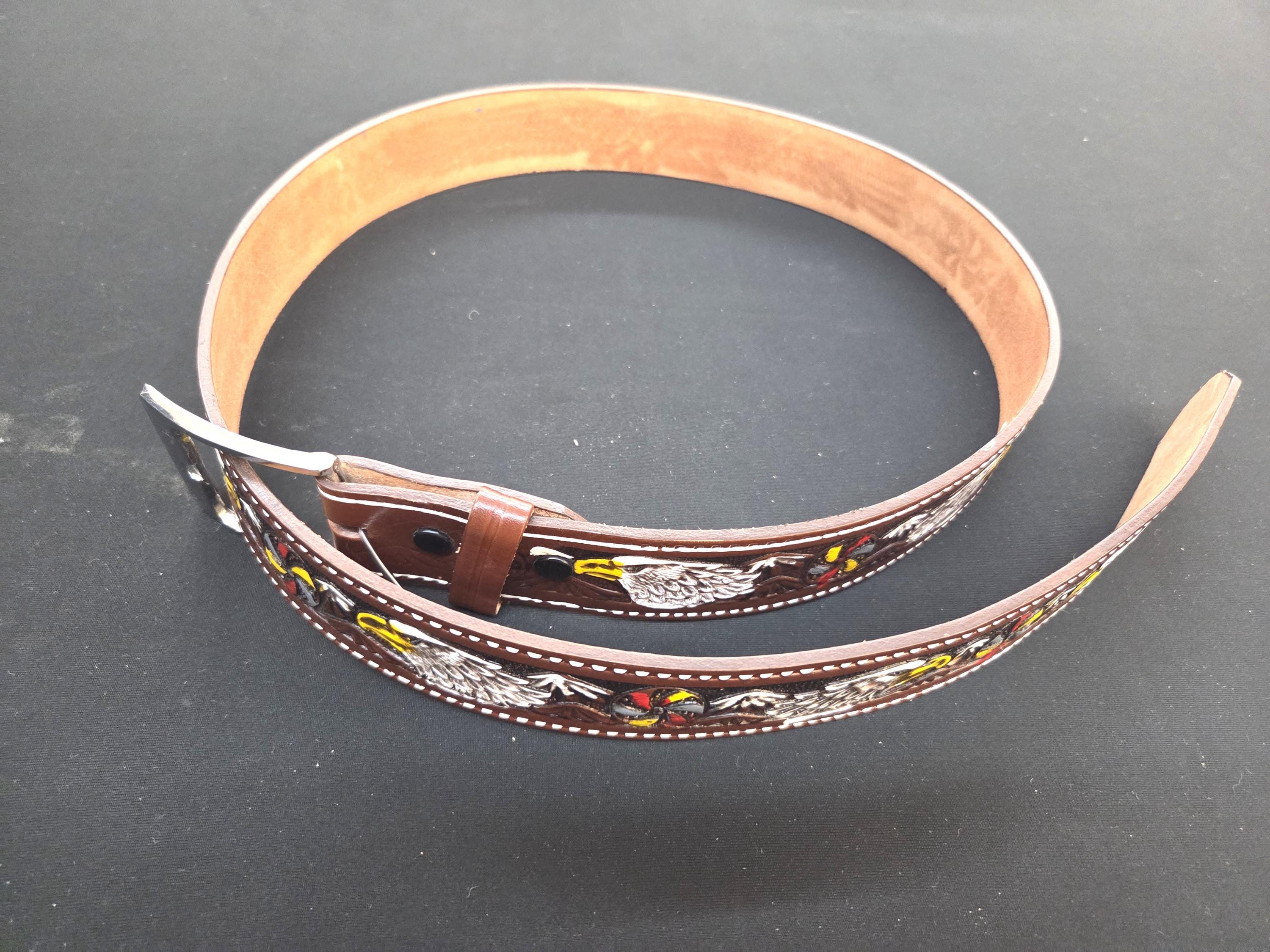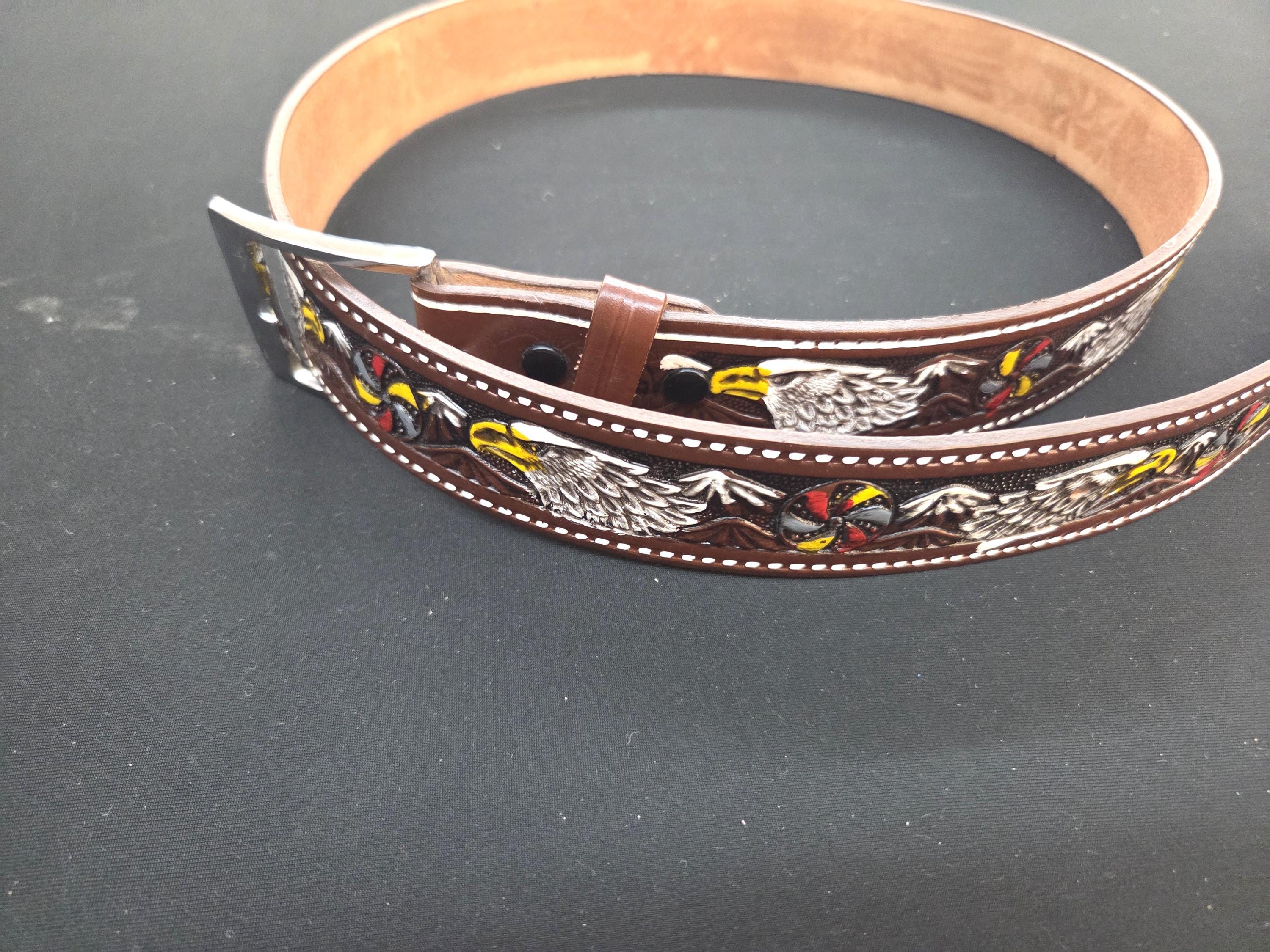 🌵 Size 40 Mexican Tooled Eagle Leather Belt – Western Style, Detachable Buckle Add a bold touch of Western craftsmanship to your wardrobe with this authentic Mexican tooled leather belt, featuring a beautifully detailed eagle design. We also have other styles available. Made from top‑quality genuine leather, this belt is built to last and designed to stand out. All belts are hand worked so there may be very minor flaws, but overall look is always quite awesome. To see more styles that fit you in my shop just put your size desired in the search box. ⭐ Key Features * Size 40 – as marked by the maker on the backside. * Detachable buckle so you can easily swap in your own favorite buckle if desired. * Hand‑tooled eagle design with classic Western styling. * Authentic leather with excellent durability and feel. * Exact belt shown in photos — you receive the actual item pictured. * Measures approximately 1.5" wide and 48" long including the buckle.