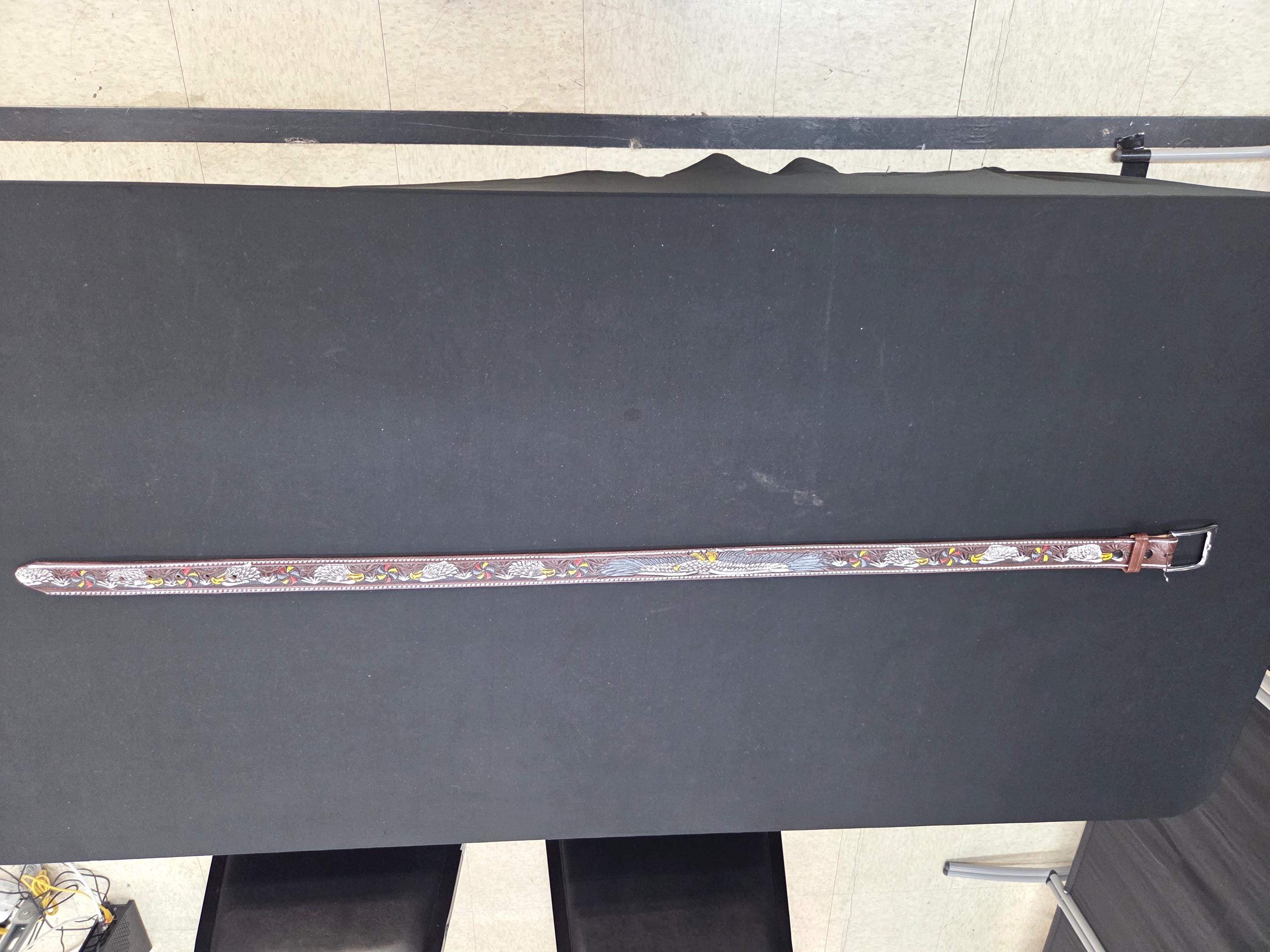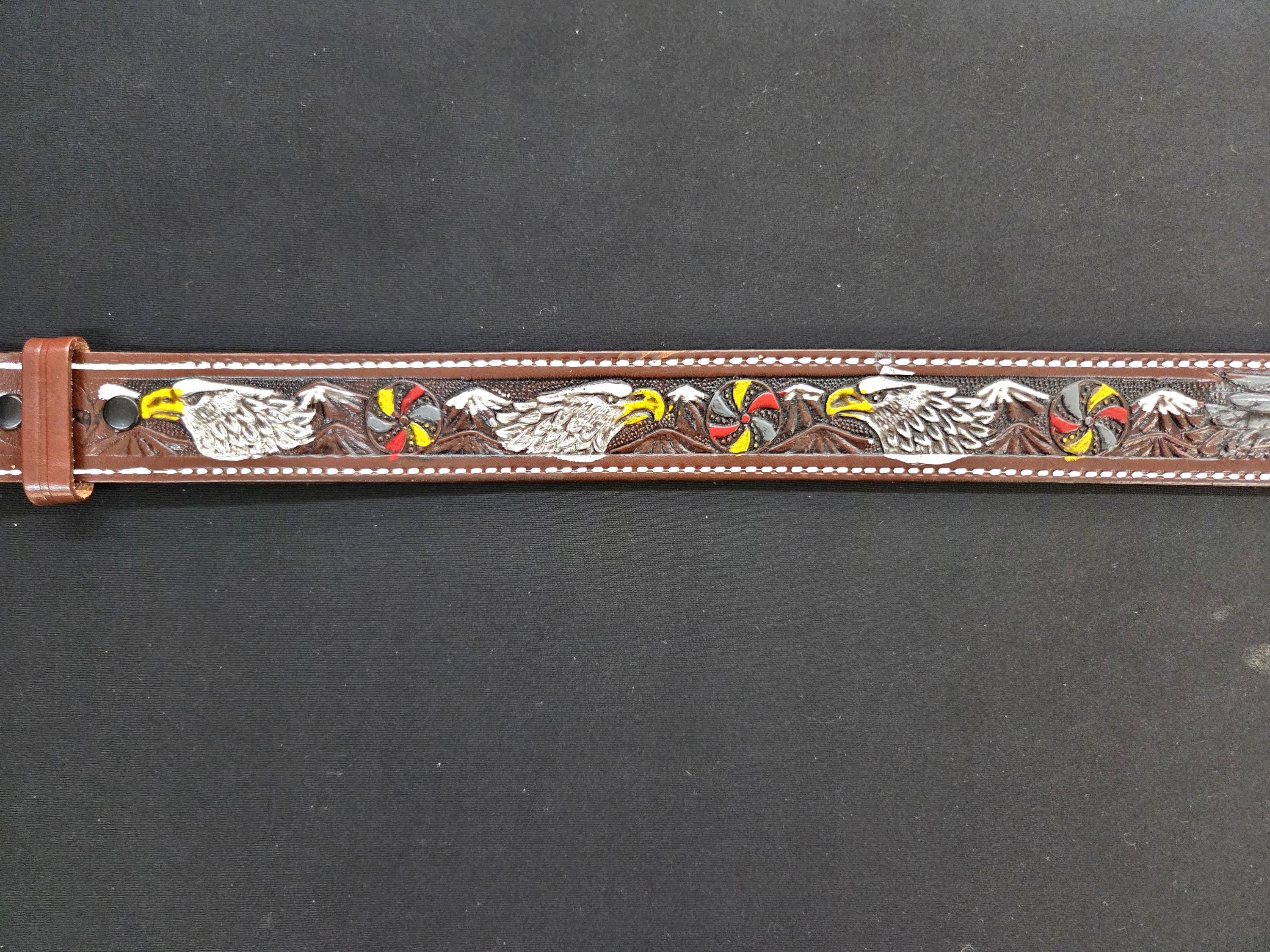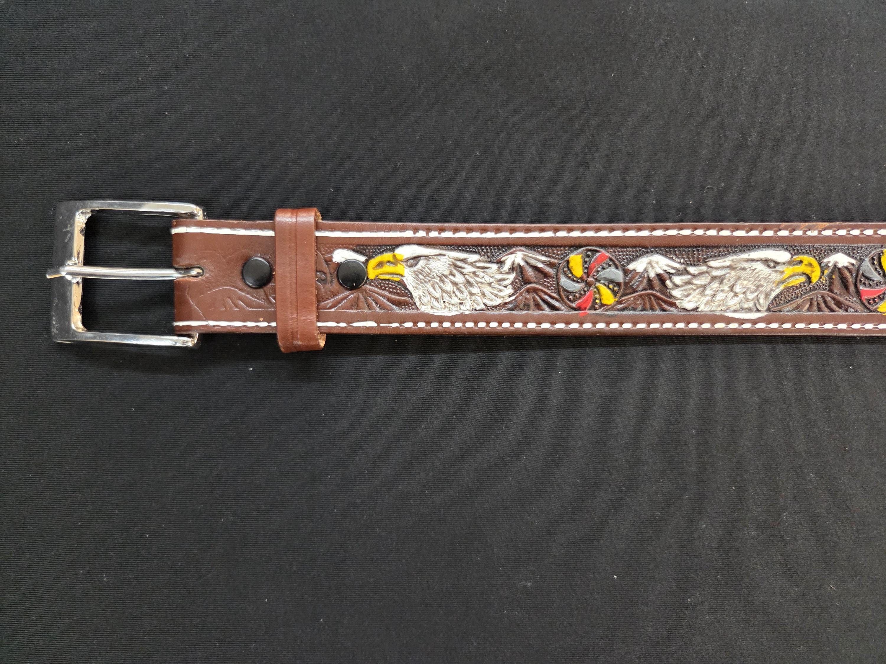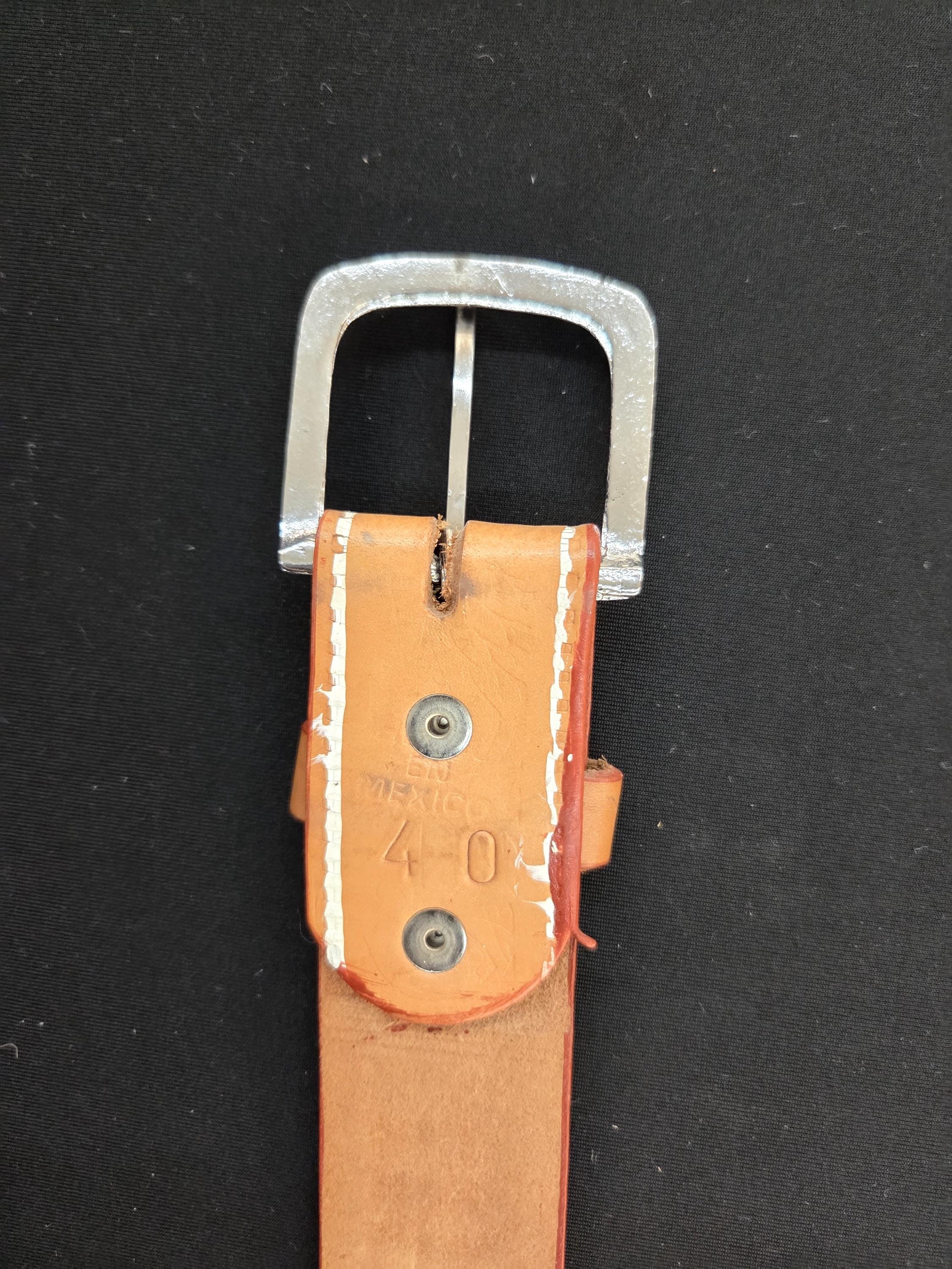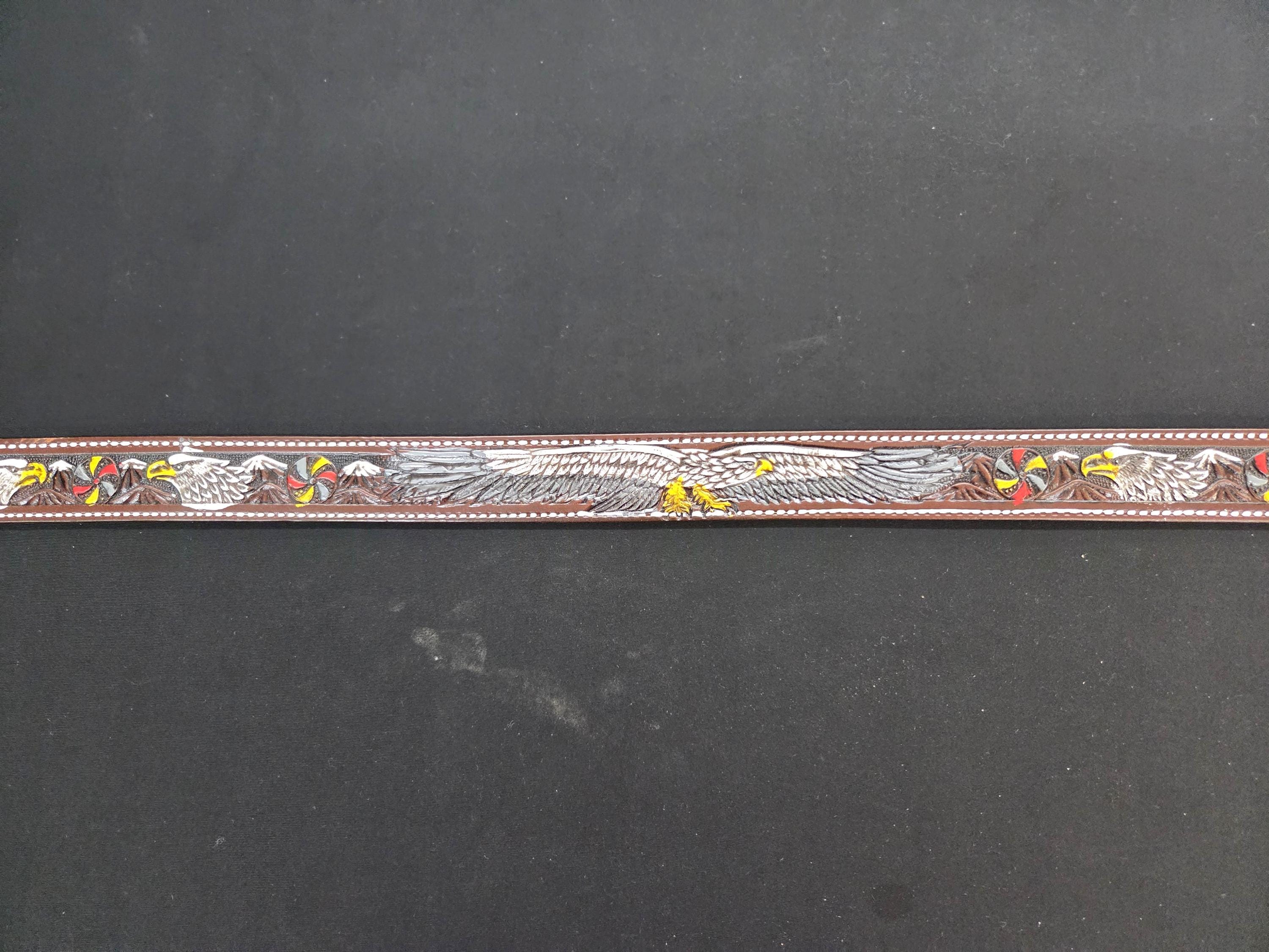 🌵 Size 40 Mexican Tooled Eagle Leather Belt – Western Style, Detachable Buckle Add a bold touch of Western craftsmanship to your wardrobe with this authentic Mexican tooled leather belt, featuring a beautifully detailed eagle design. We also have other styles available. Made from top‑quality genuine leather, this belt is built to last and designed to stand out. All belts are hand worked so there may be very minor flaws, but overall look is always quite awesome. To see more styles that fit you in my shop just put your size desired in the search box. ⭐ Key Features * Size 40 – as marked by the maker on the backside. * Detachable buckle so you can easily swap in your own favorite buckle if desired. * Hand‑tooled eagle design with classic Western styling. * Authentic leather with excellent durability and feel. * Exact belt shown in photos — you receive the actual item pictured. * Measures approximately 1.5" wide and 48" long including the buckle.