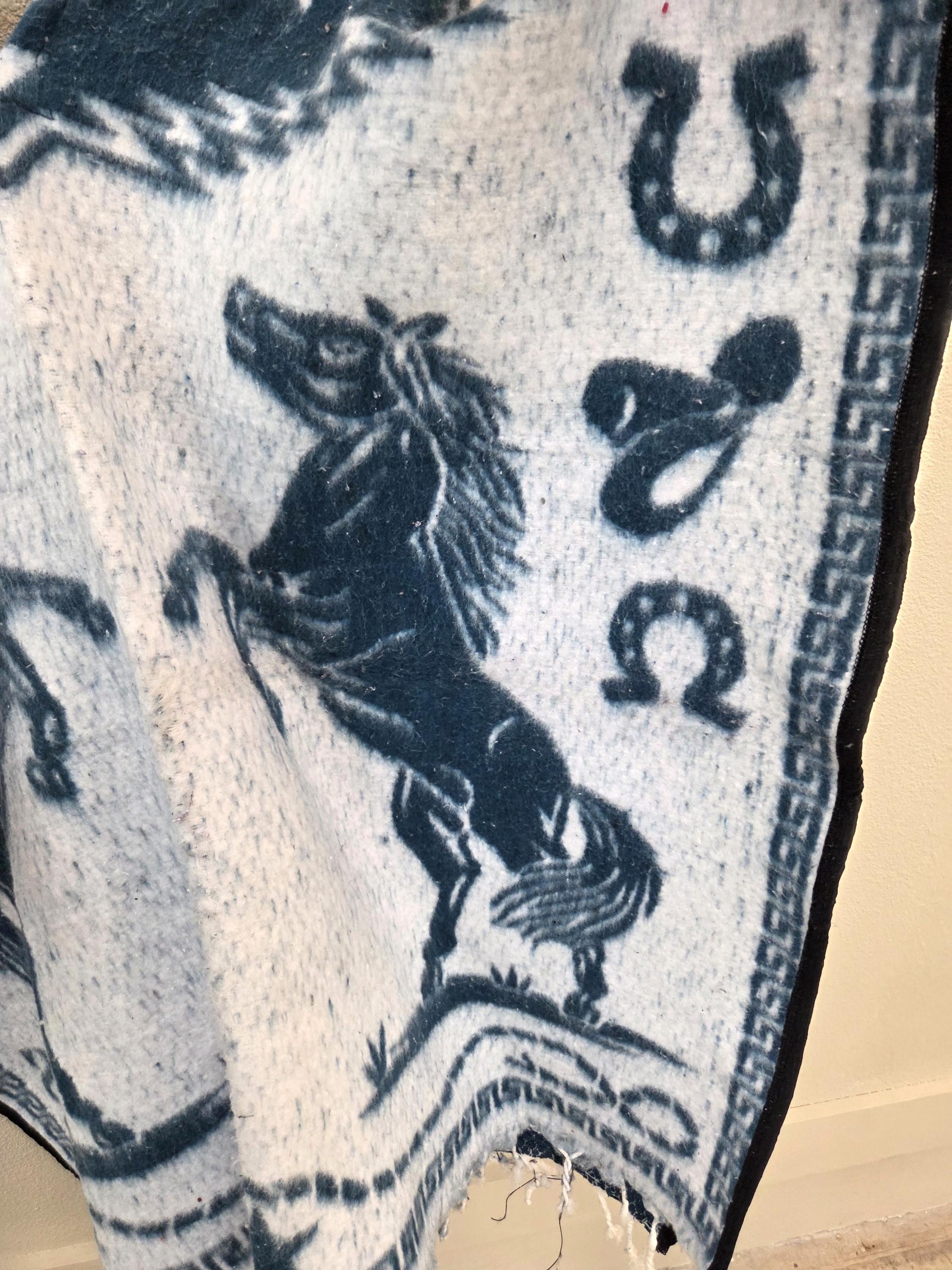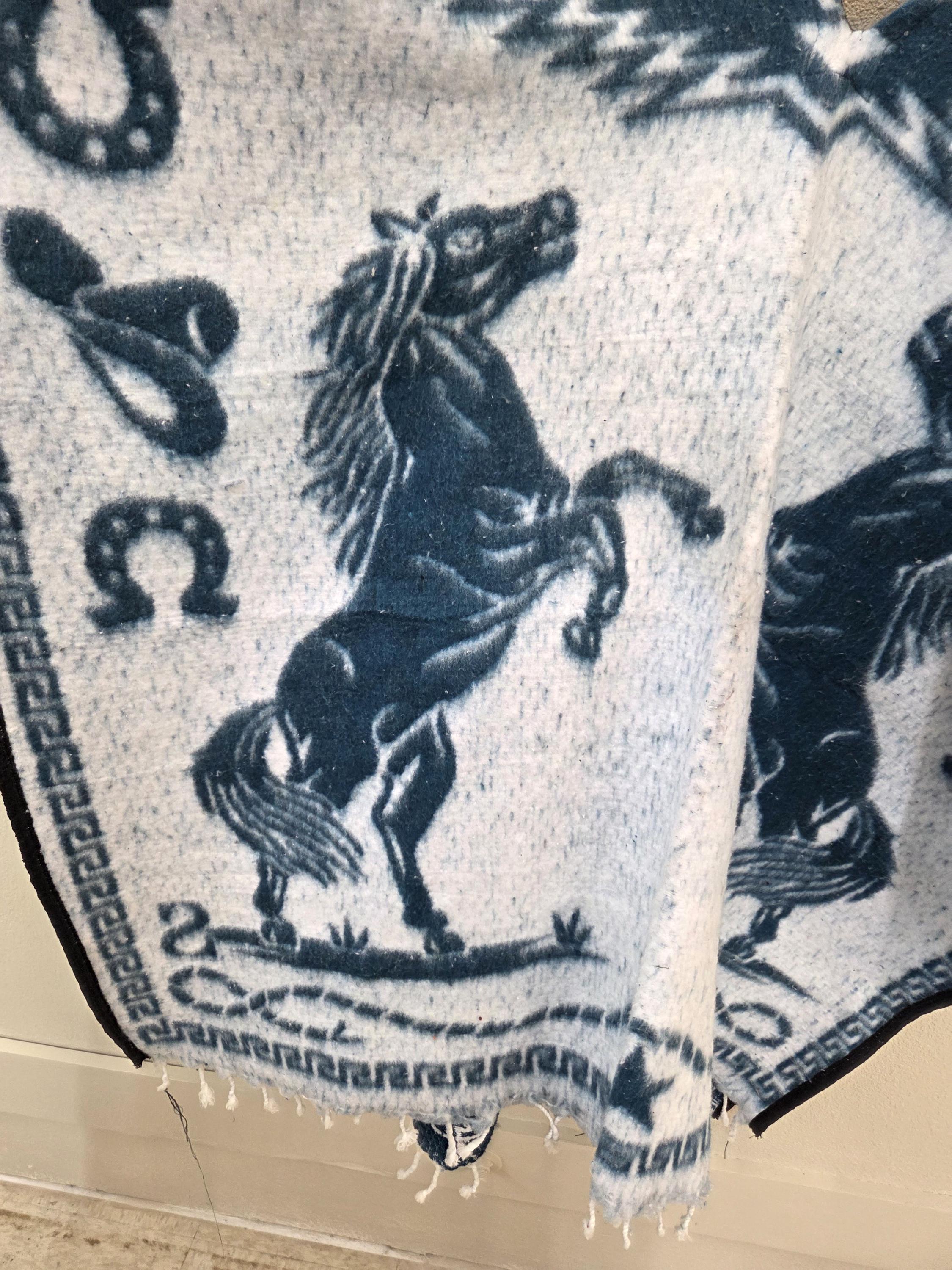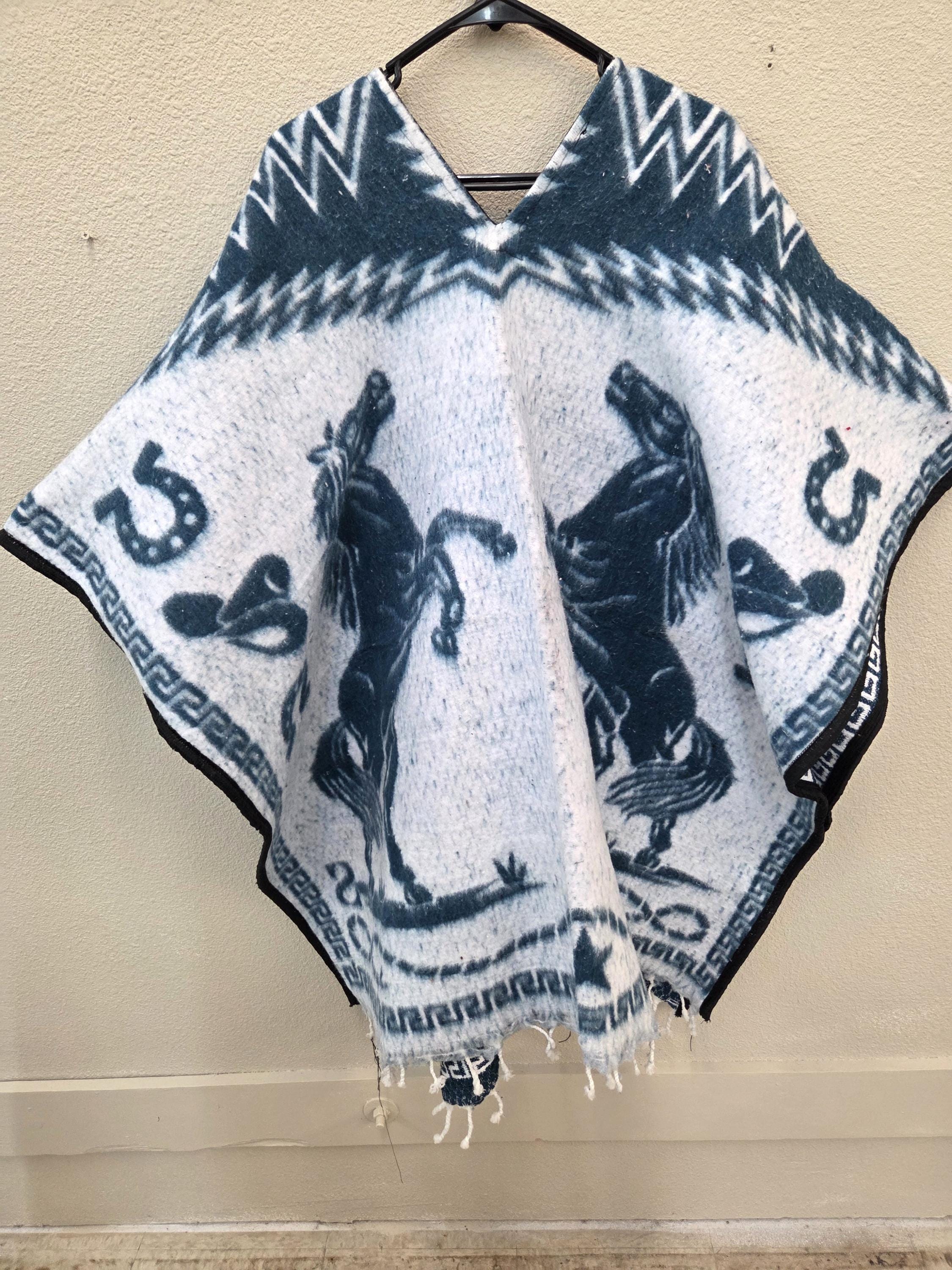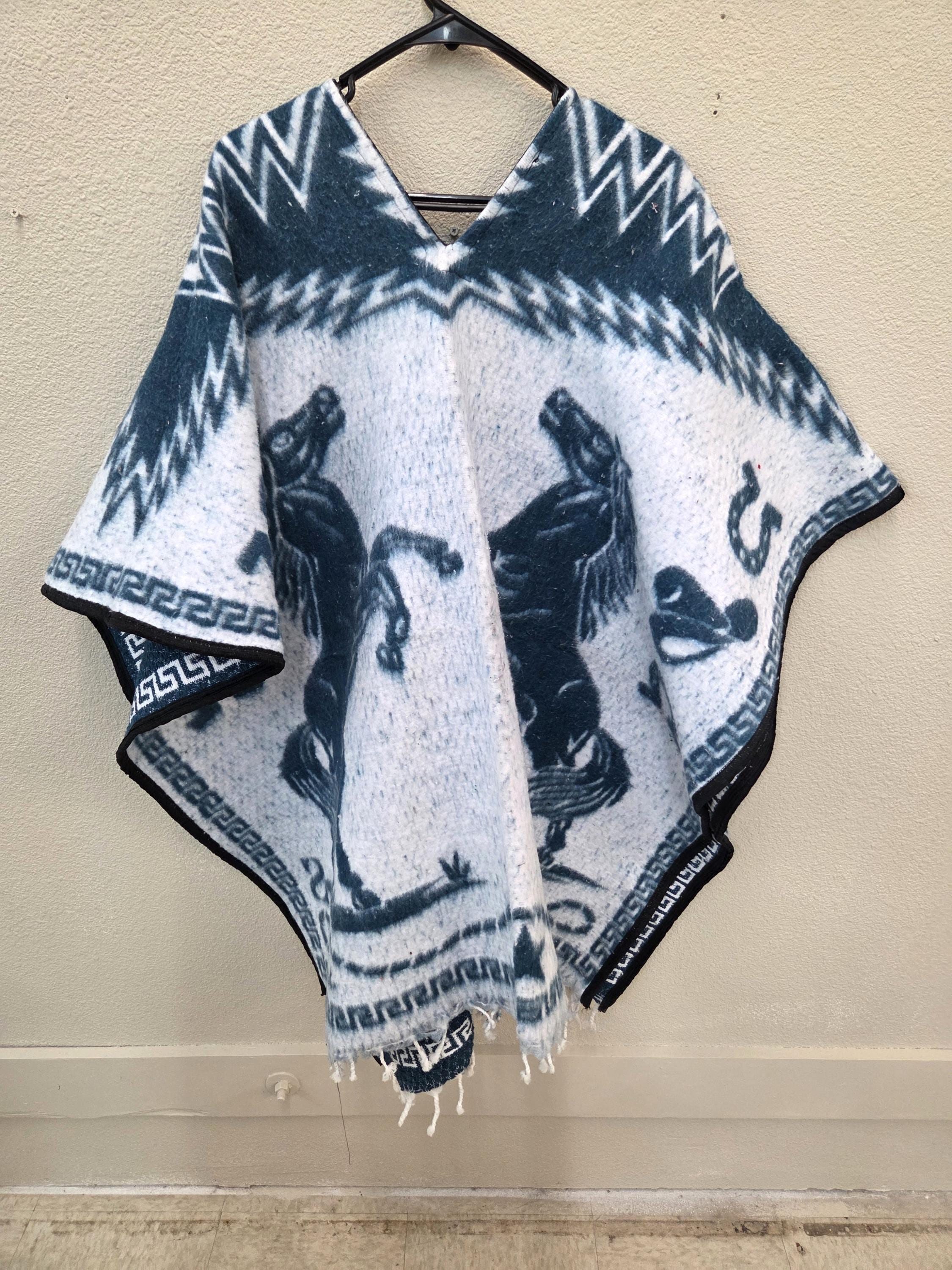 New Authentic Mexican Poncho – 2 Horse Design – Western Style Long Poncho as Pictured Here. Has a greenish tint to it that doesn't show up in the pictures well. Has 2 horses rearing on both the front and back sides. Free Shipping. This one is a one size fits most people. It would look great on the guys but even nicer on our lady friends. We have many different styles & colors of ponchos to pick from in many different sizes. You may also want to check out our awesome zippered ponchos. Anything hand done can have minor imperfections, but the overall look is always quite beautiful. This would also make a great gift for a friend or a loved one. So, why ever gift something just ordinary?
