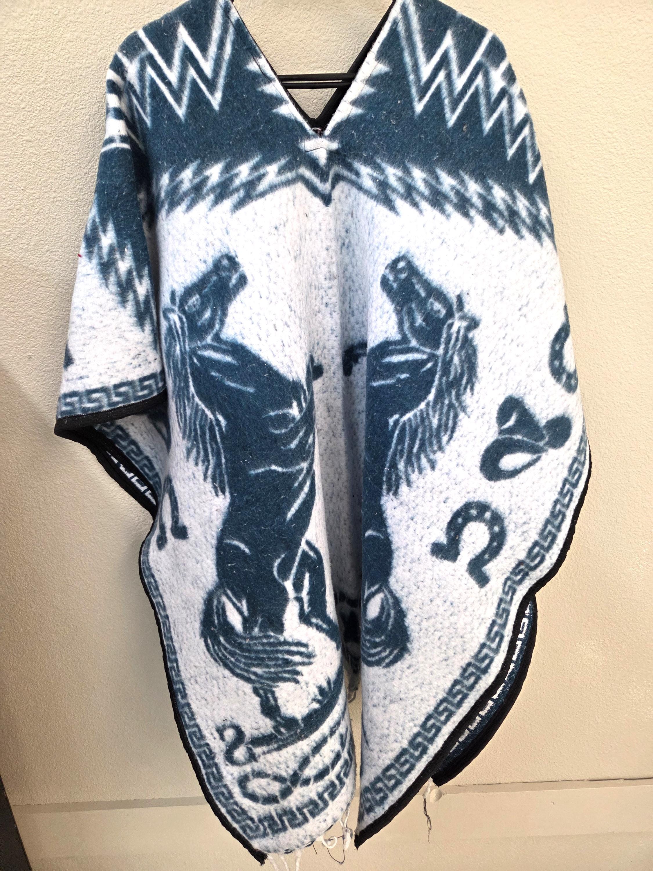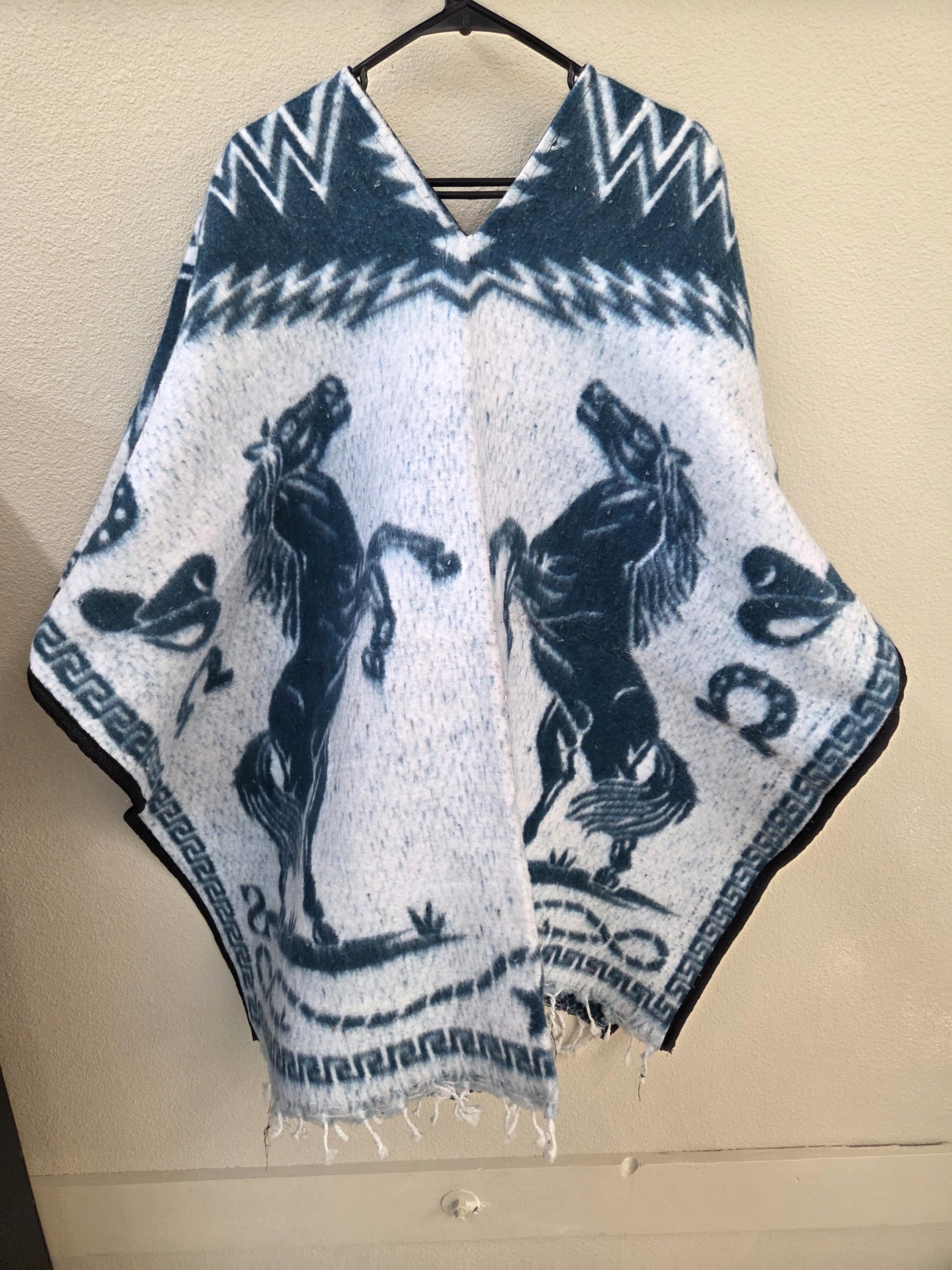 New Authentic Mexican Poncho – 2 Horse Design – Western Style Long Poncho as Pictured Here. Has 2 horses rearing on both the front and back sides. Free Shipping. This one is a one size fits most people. It would look great on the guys but even nicer on our lady friends. We have many different styles & colors of ponchos to pick from in many different sizes. You may also want to check out our awesome zippered ponchos. Anything hand done can have minor imperfections, but the overall look is always quite beautiful. This would also make a great gift for a friend or a loved one. So, why ever gift something just ordinary?