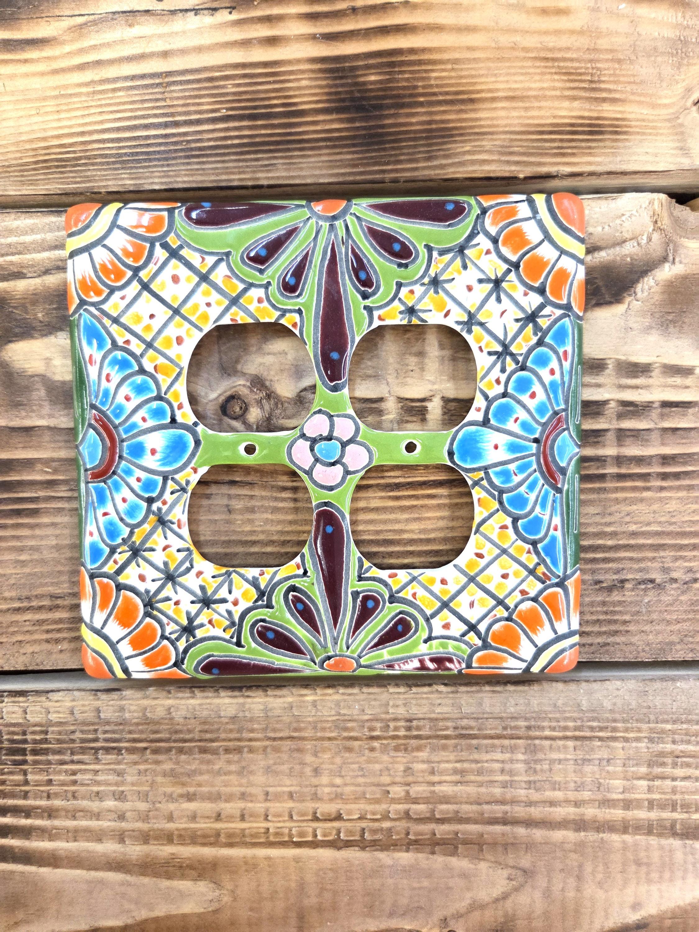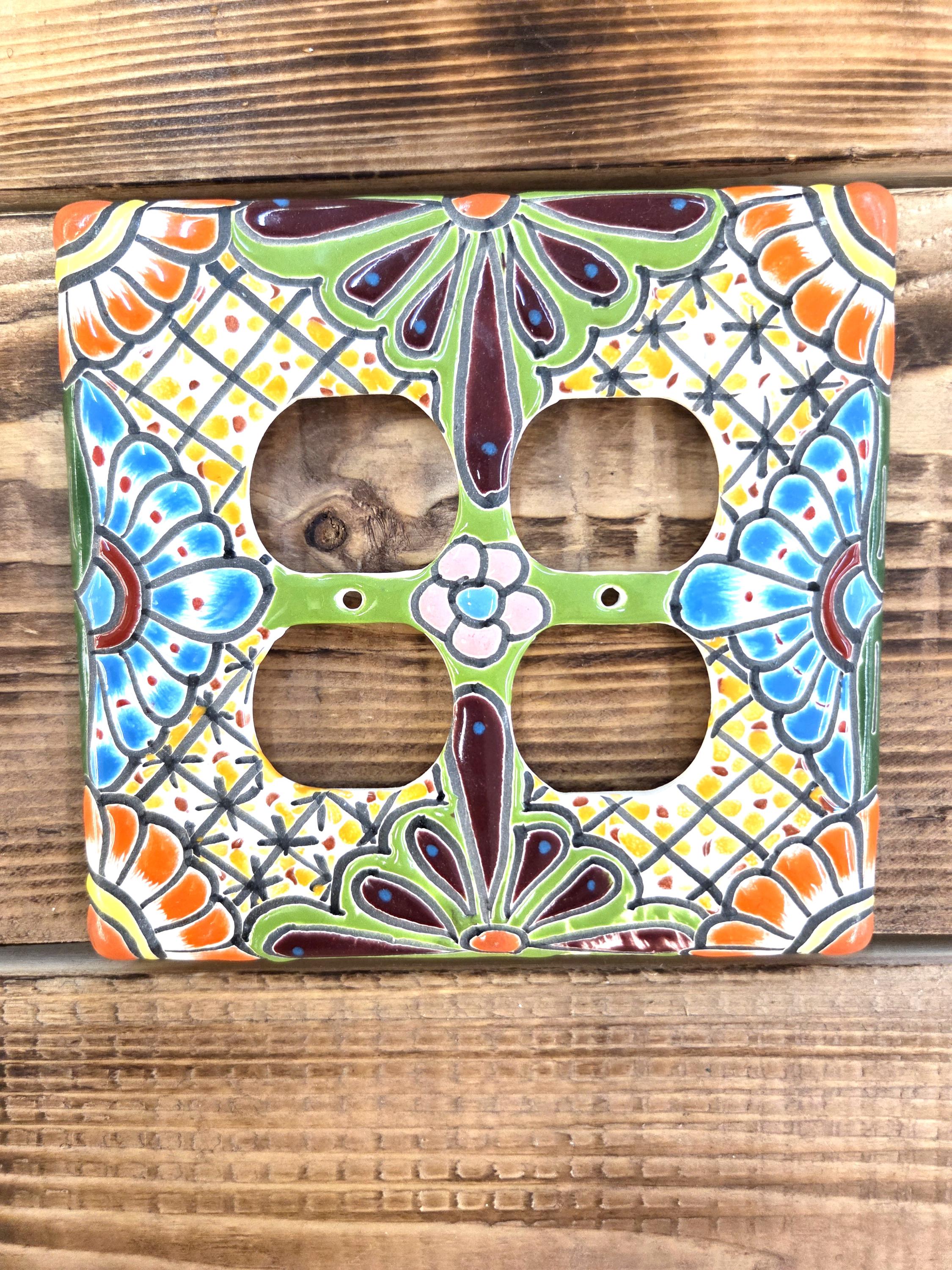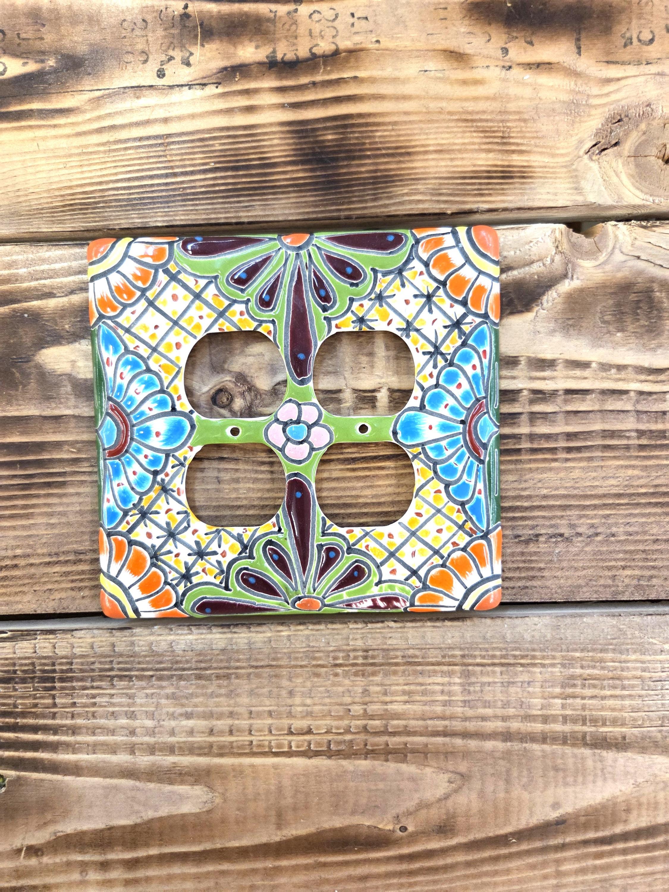 Handmade, Hand Painted Mexican Artisan Authentic Talavera Electric 4 Outlet Electric Plate. Measures roughly 5 3/4" by 5 3/8". These are authentic handmade Talavera pottery ceramic covers rather than a stick on or plastic Chinese product. You will be getting the item actually shown in the pictures rather than an item kinda like this one. Each one is handmade and hand-painted, rather than machine made, so sometimes there can be minor flaws, but the overall look is always very beautiful and impressive. Be careful not to tighten your screws from your old plate so hard that you actually break your new cover plate. Slightly larger screws are available at any hardware store if need be.