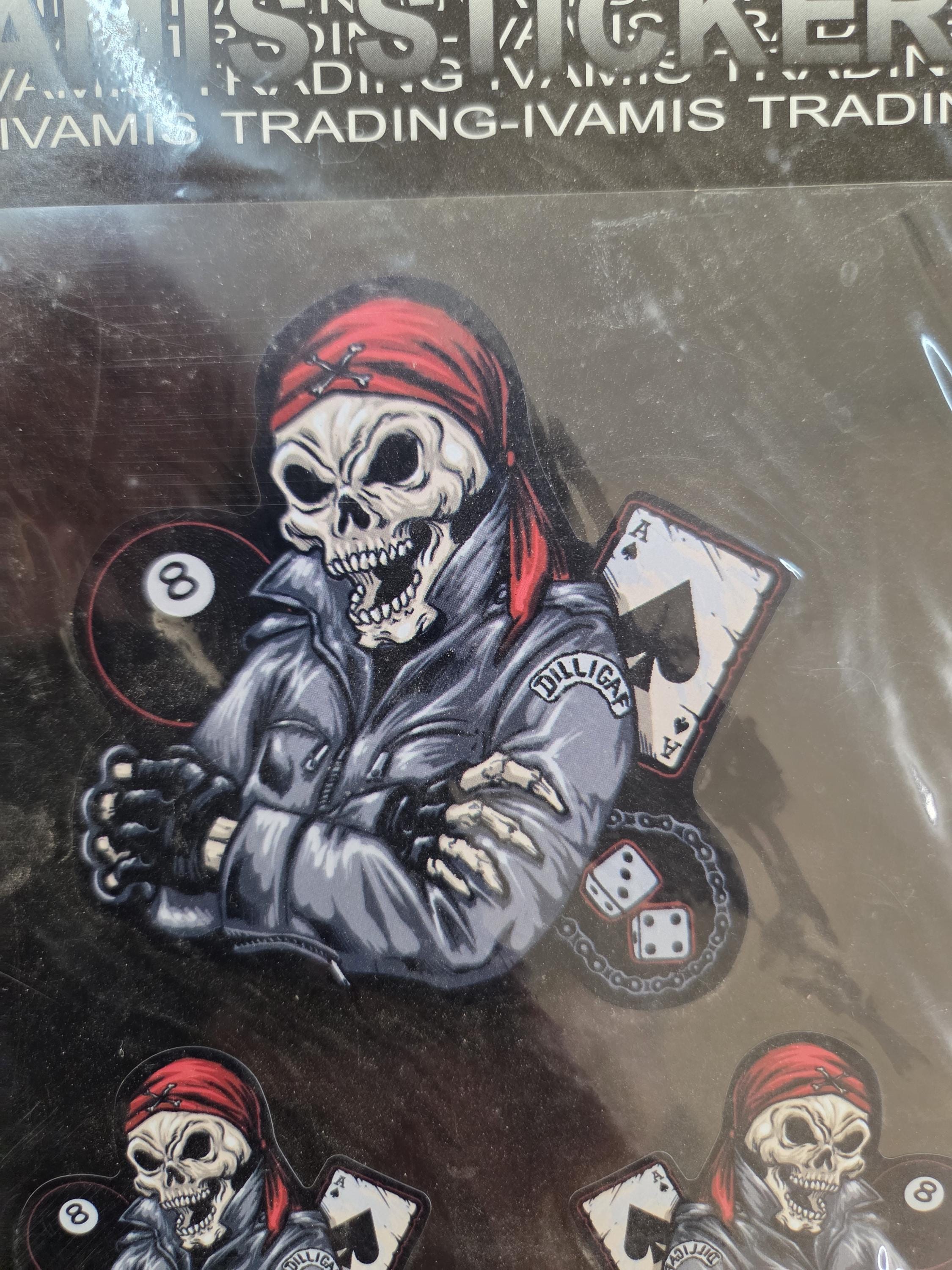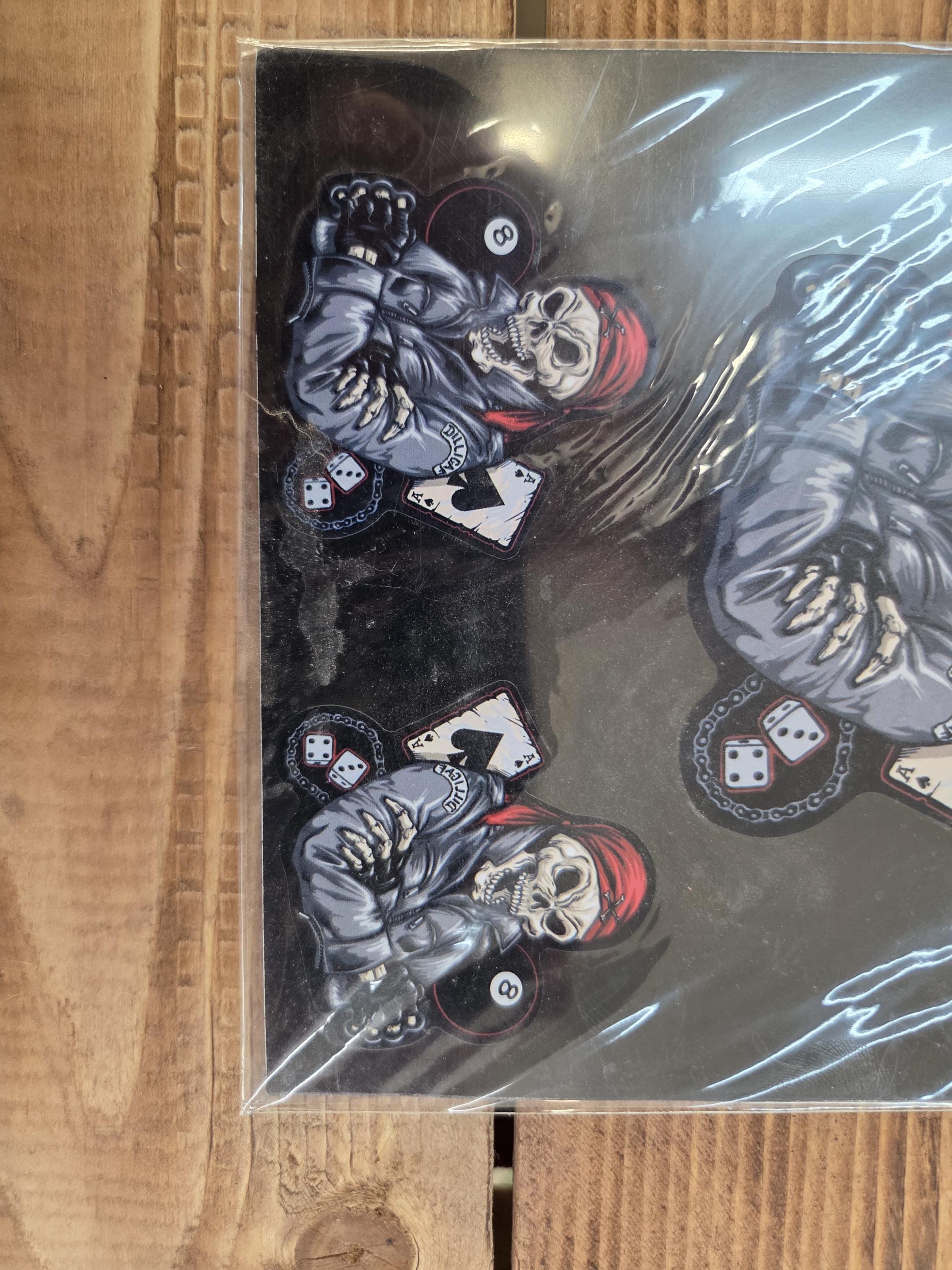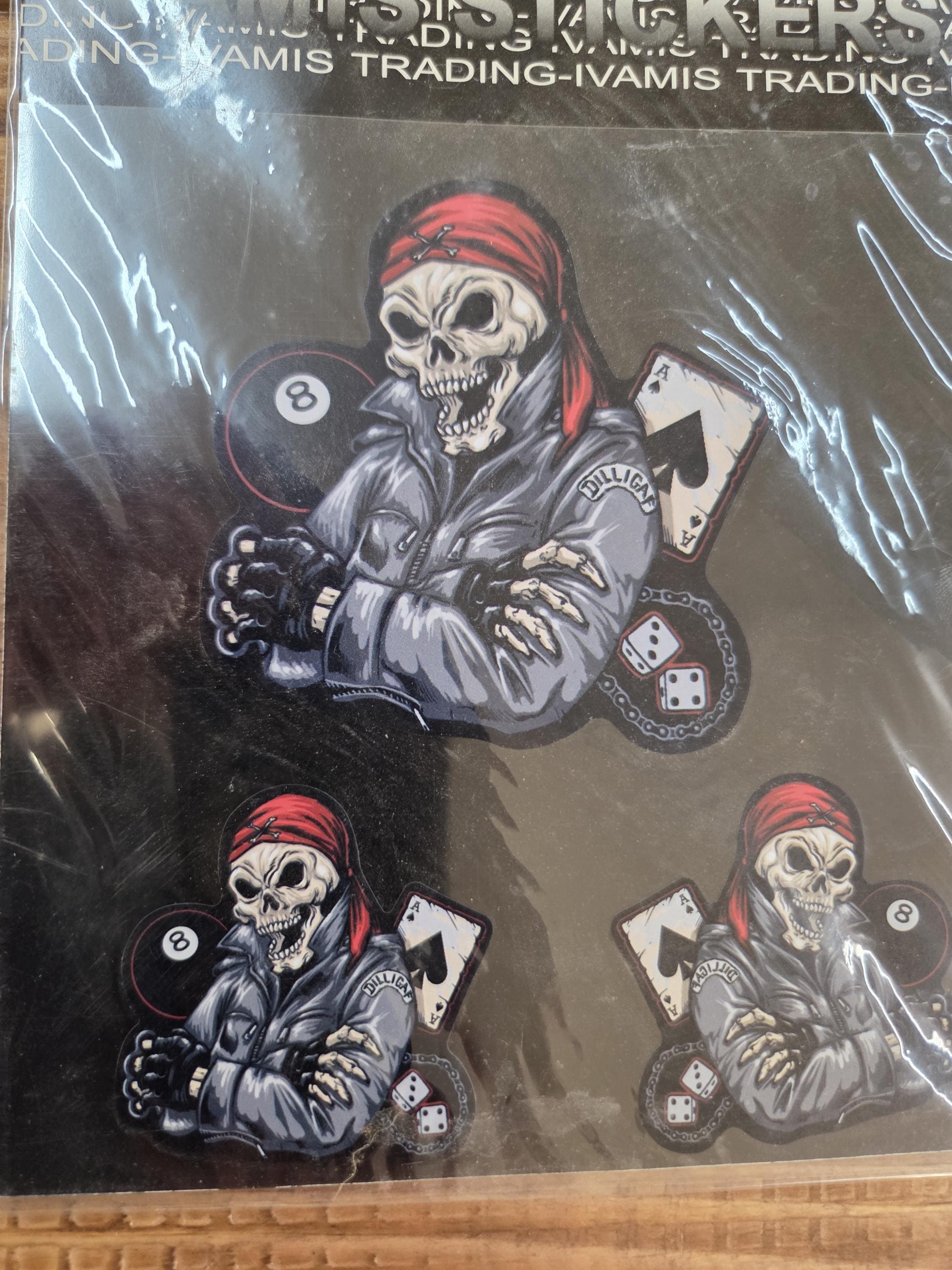 Trio of Ace of Spades, 8 Ball, Dice, Biker Dude Decals• Motorcycle Helmet Auto Truck Trailer Stickers. The larger one is roughly3 1/2" tall, the other 2 are about 2" tall. Whether you're customizing your motorcycle, truck, toolbox, trailer, helmet or garage, this would make an awesome decal for you..