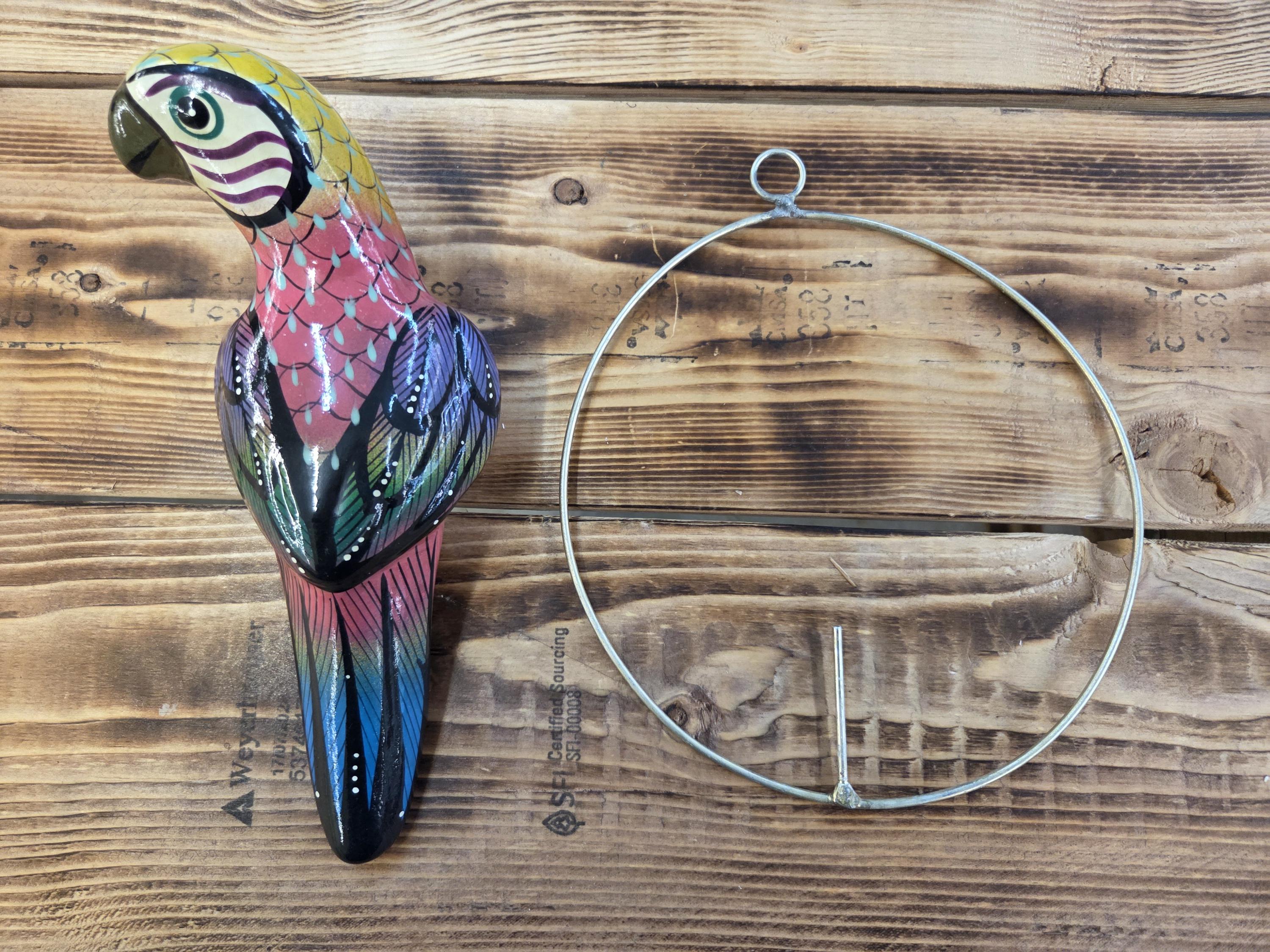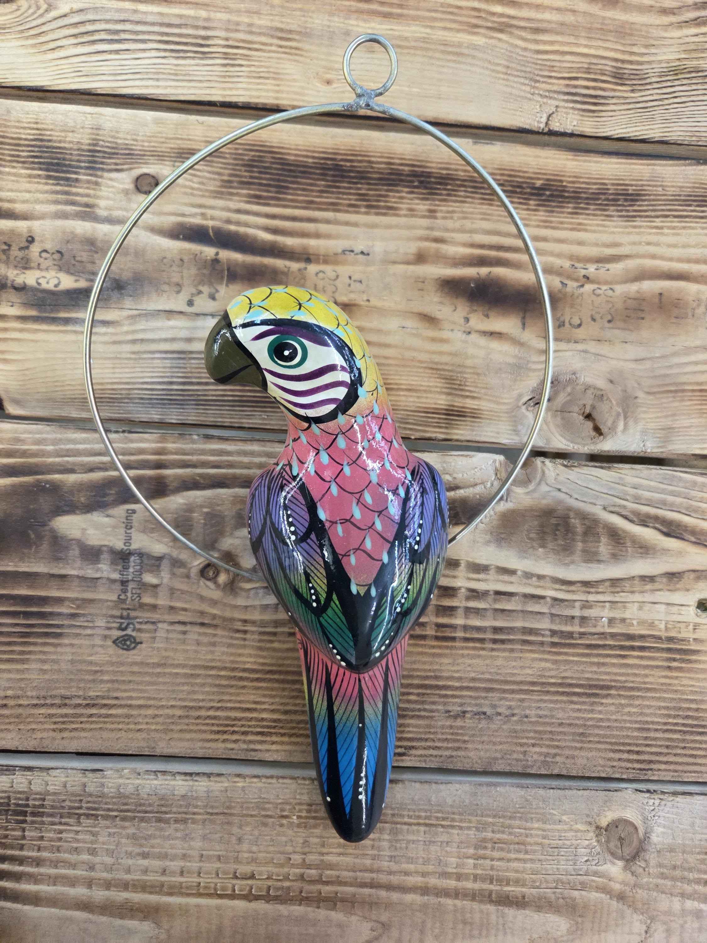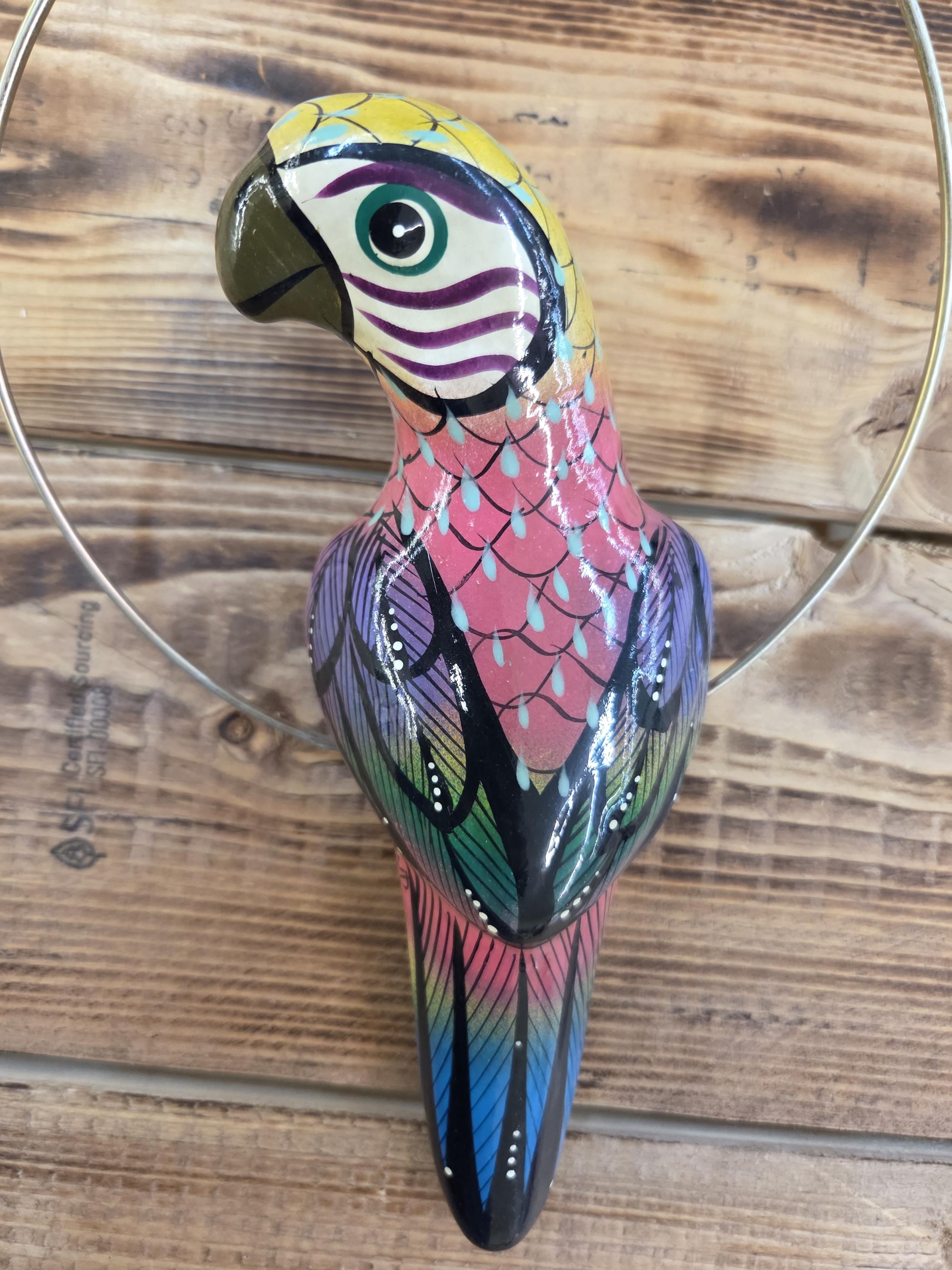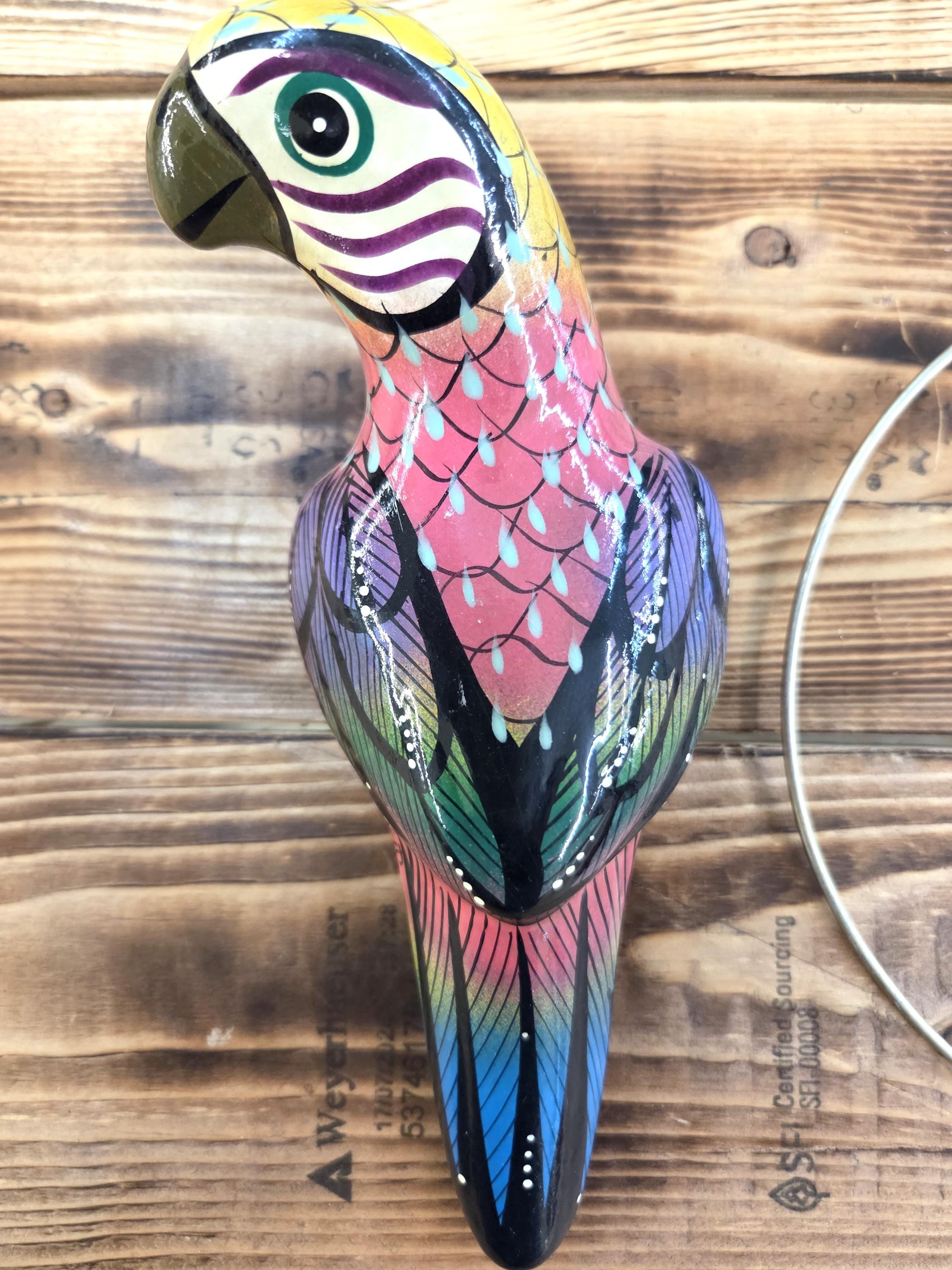 THIS ITEM. Beautiful Hanging Parrot on a Metal Perch. Handmade, Hand-Painted, Ceramic Pottery Parrots Made by a Mexico Artisans. You will be getting the parrot as actually shown in our pictures rather than something just kinda like them. Each parrot is handmade by Mexico Artisans and hand-painted, rather than machine made, so sometimes there can be minor flaws, but the overall look is always very beautiful and impressive. This parrot is roughly 8.5" tall by about 3 1/2" wide irregular, not including the metal perch. We normally have some more parrots in different colors and sizes in our Etsy shop to choose from. This would also make a lovely present for a friend or a loved one. So, why ever gift something just ordinary? Shop where so many home decorators do, right here. We strive to get you the very best prices.