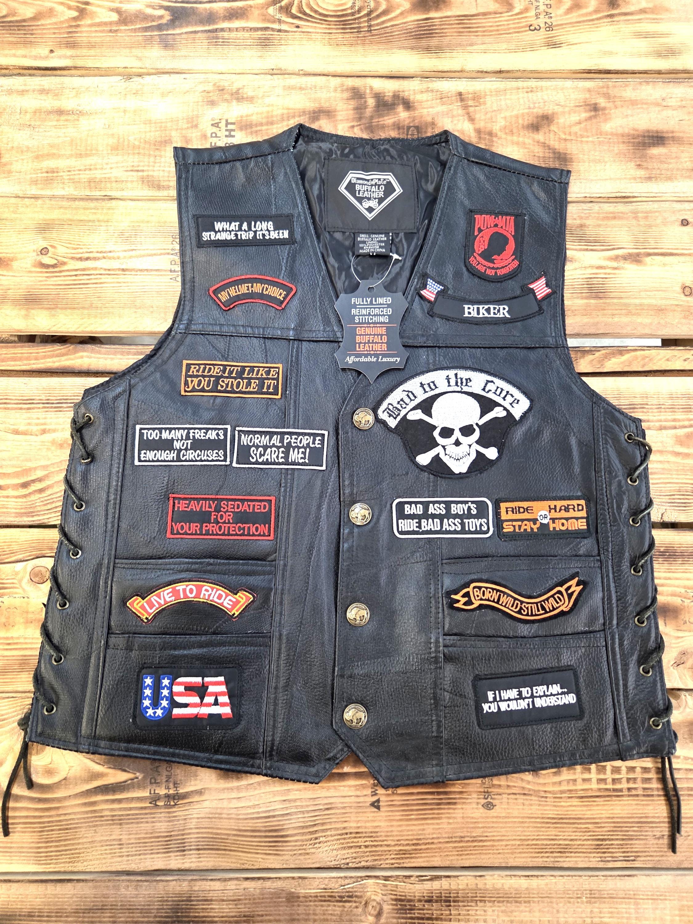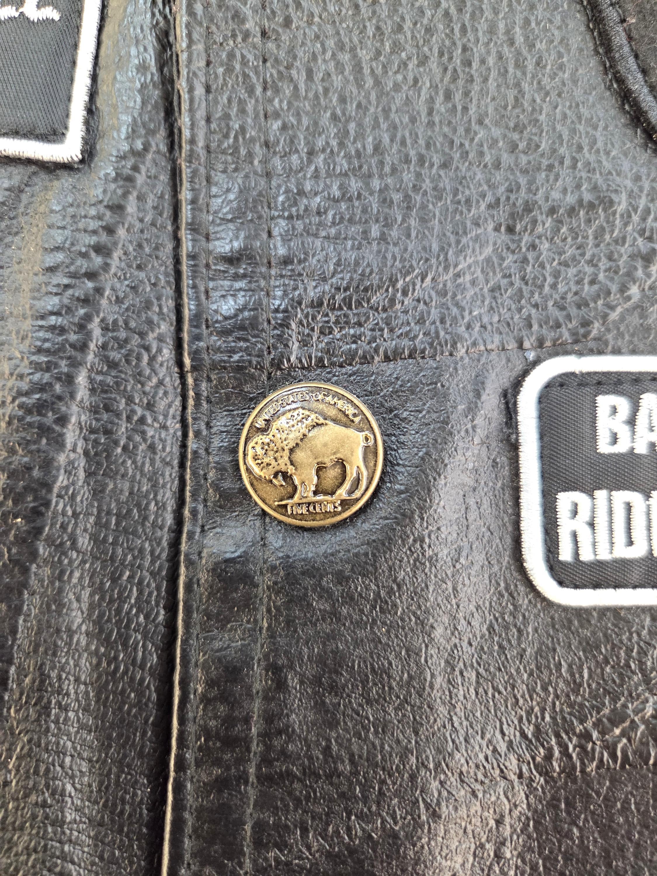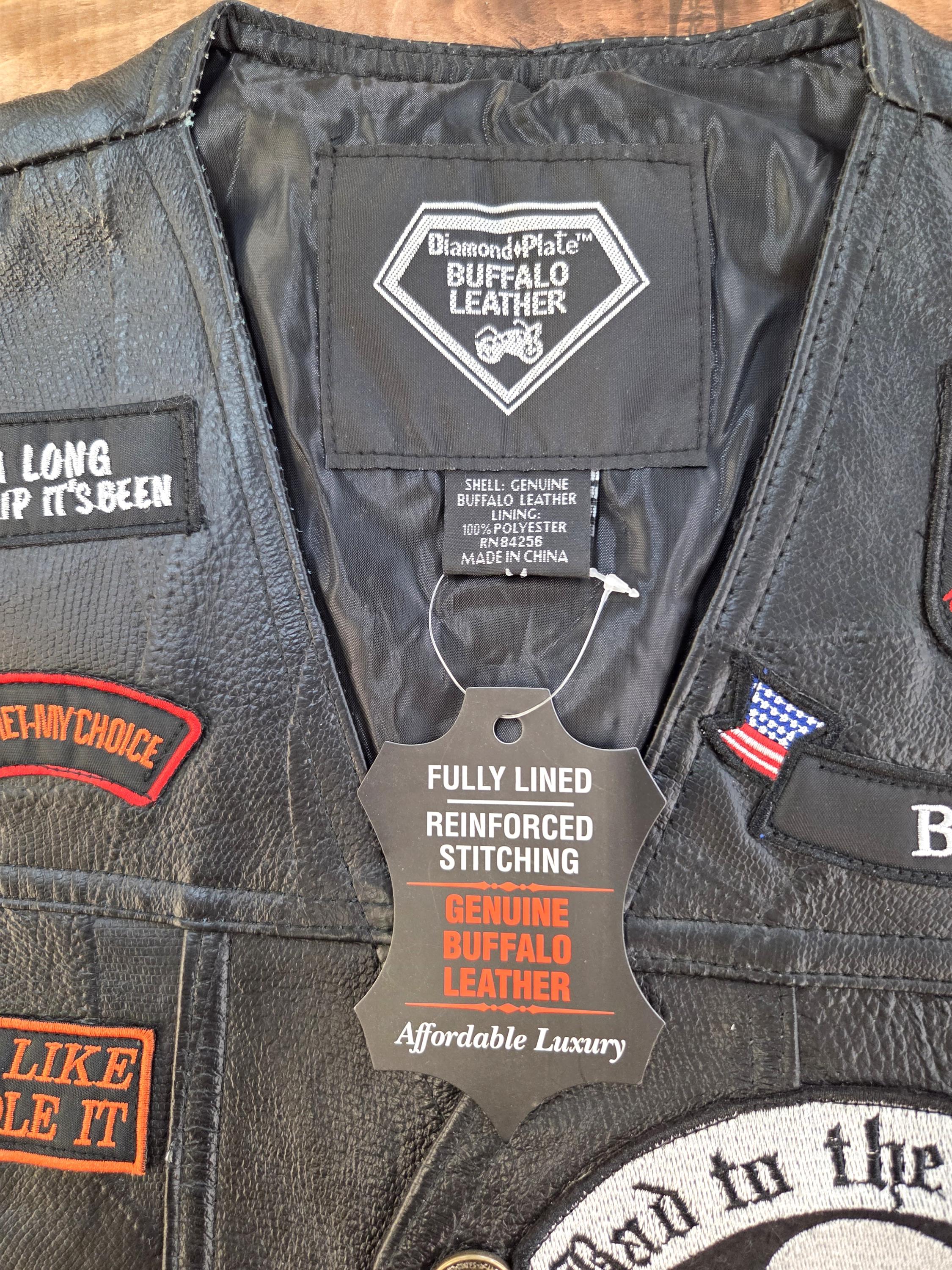 23 Patch LARGE Size Buffalo Leather Biker Vest. Last One in this Size. Four front slit pockets. Four awesome Buffalo snaps. Includes 23 patches already sewn on which would cost you a real bundle if done separately. New vest, never worn. Can still add more patches, conchos, etc. Polyester lining. Great Price! Probably won't last long.