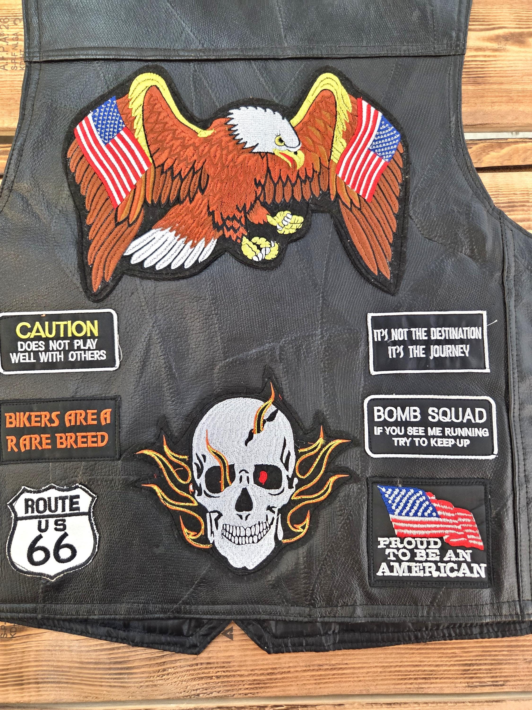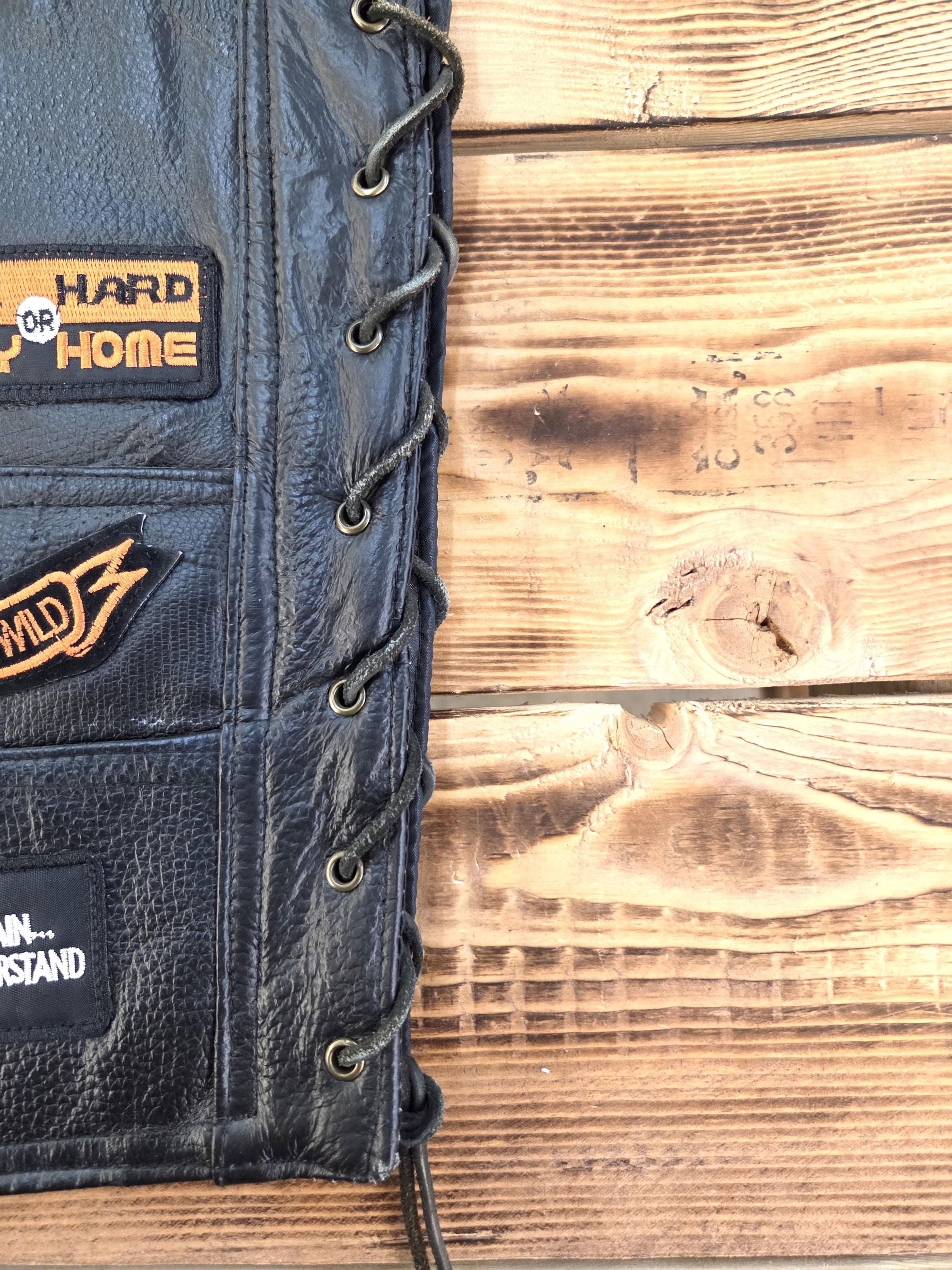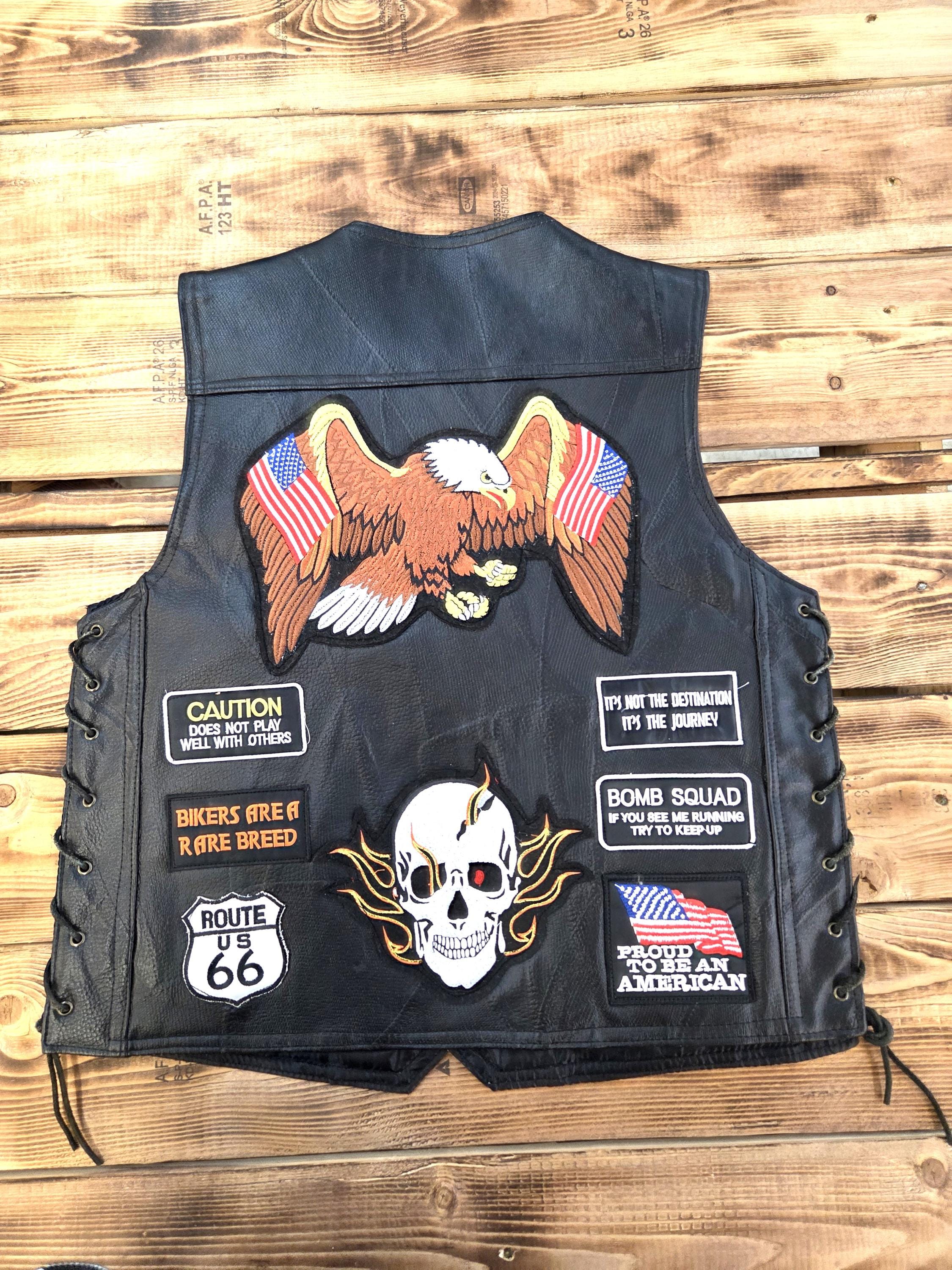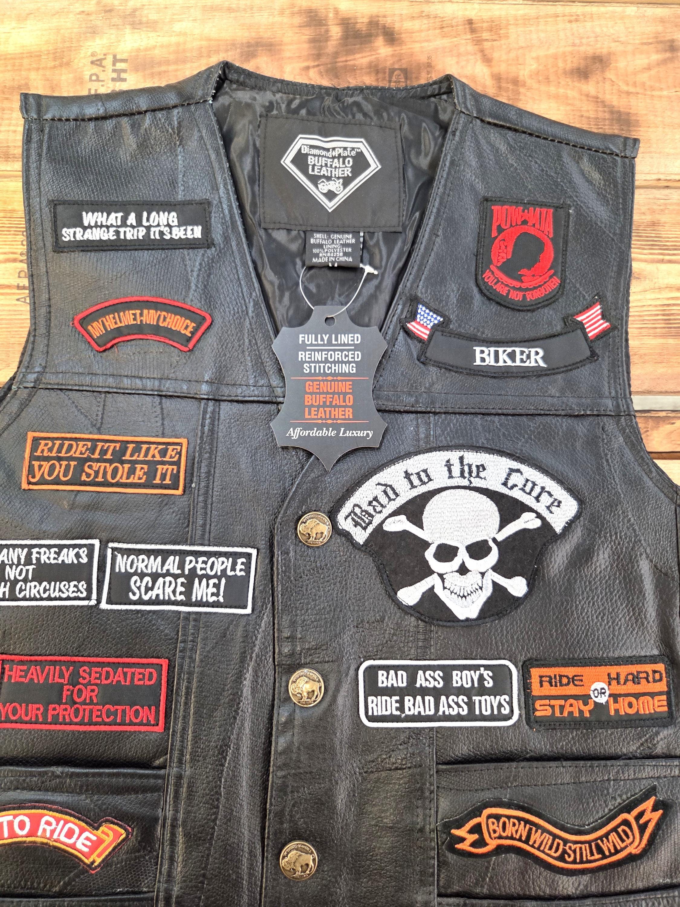 23 Patch LARGE Size Buffalo Leather Biker Vest. Last One in this Size. Four front slit pockets. Four awesome Buffalo snaps. Includes 23 patches already sewn on which would cost you a real bundle if done separately. New vest, never worn. Can still add more patches, conchos, etc. Polyester lining. Great Price! Probably won't last long.