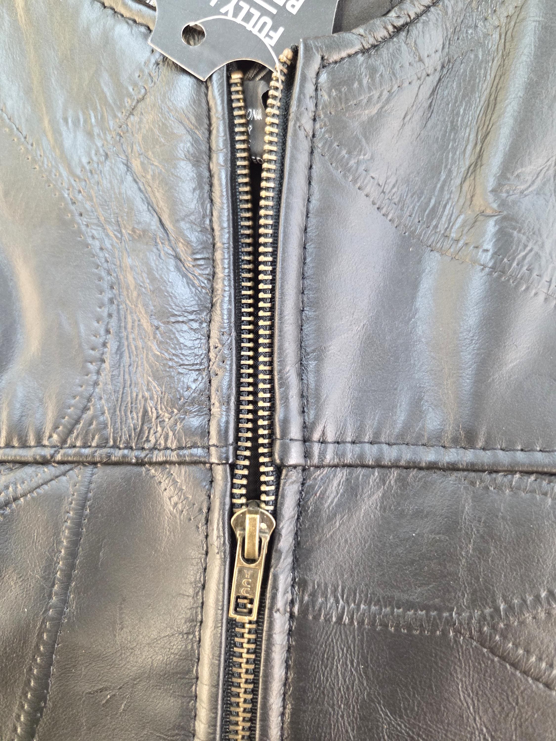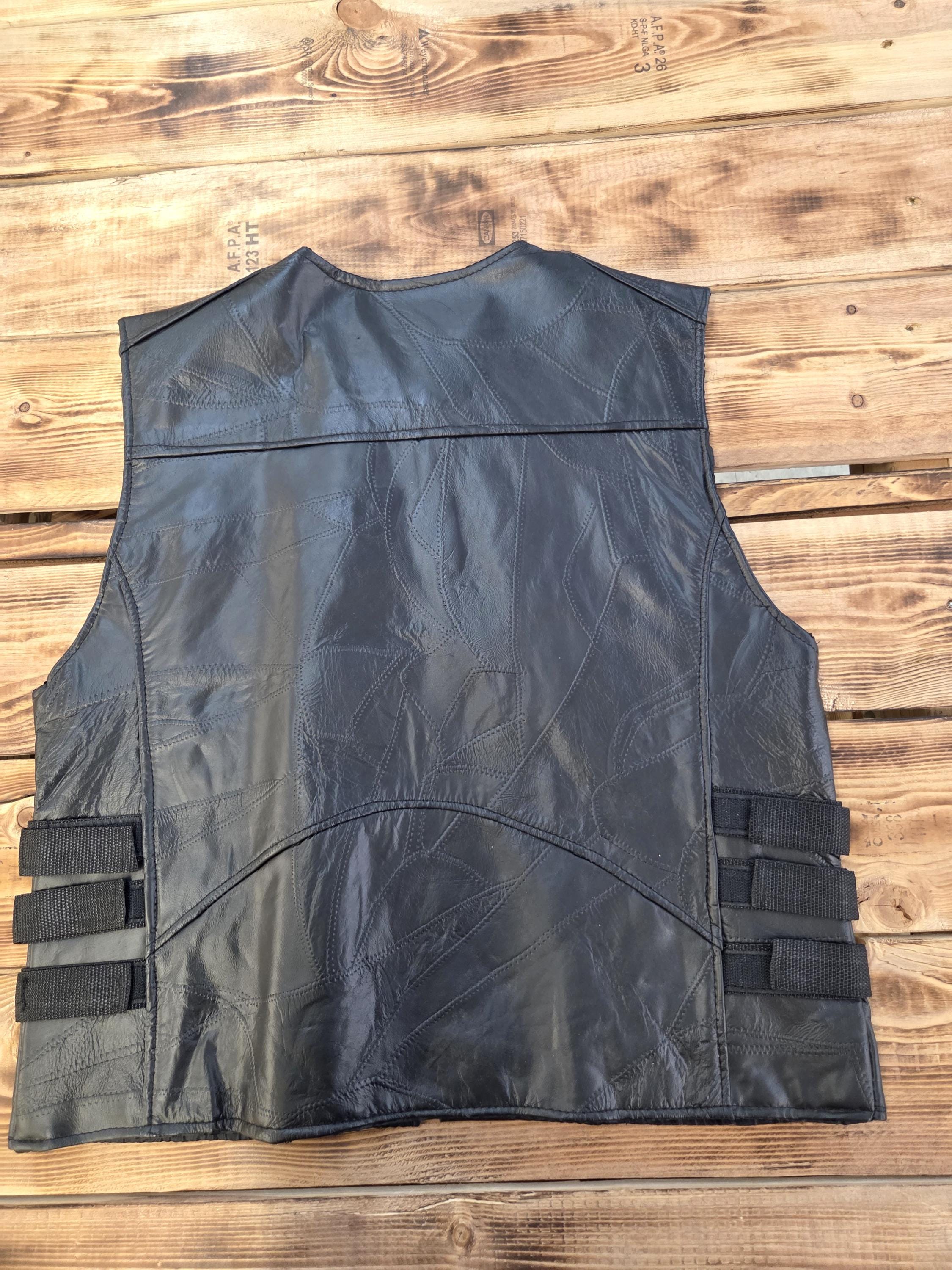 LARGE Size Zipper Buffalo Leather Biker Vest. Two front zipper pockets. You can tighten or loosen sides of vest with velcro straps. Everybody loves zipper vests. New vest, never worn. Can still add more patches, conchos, etc. Polyester lining. Great Price! Probably won't last long.