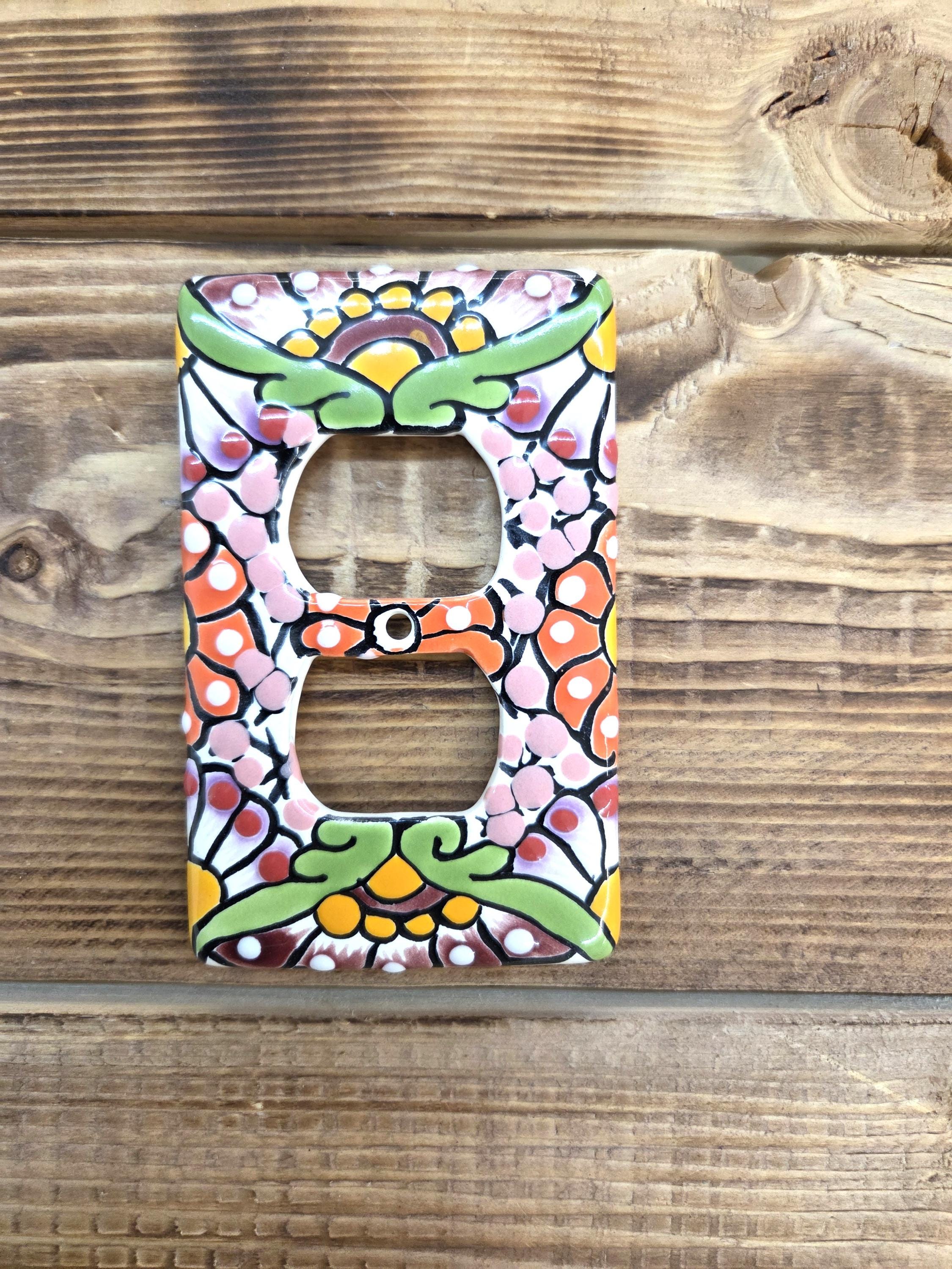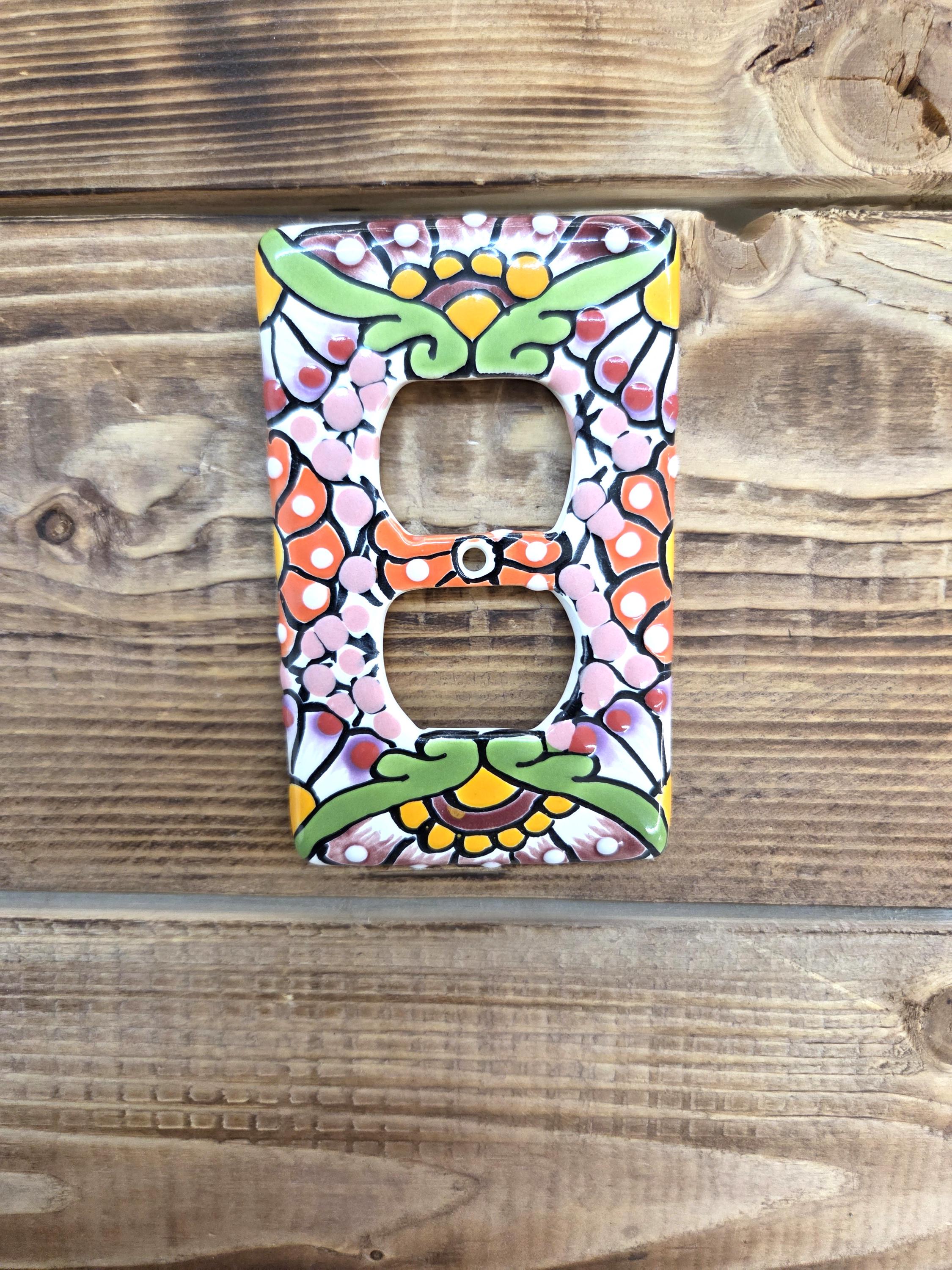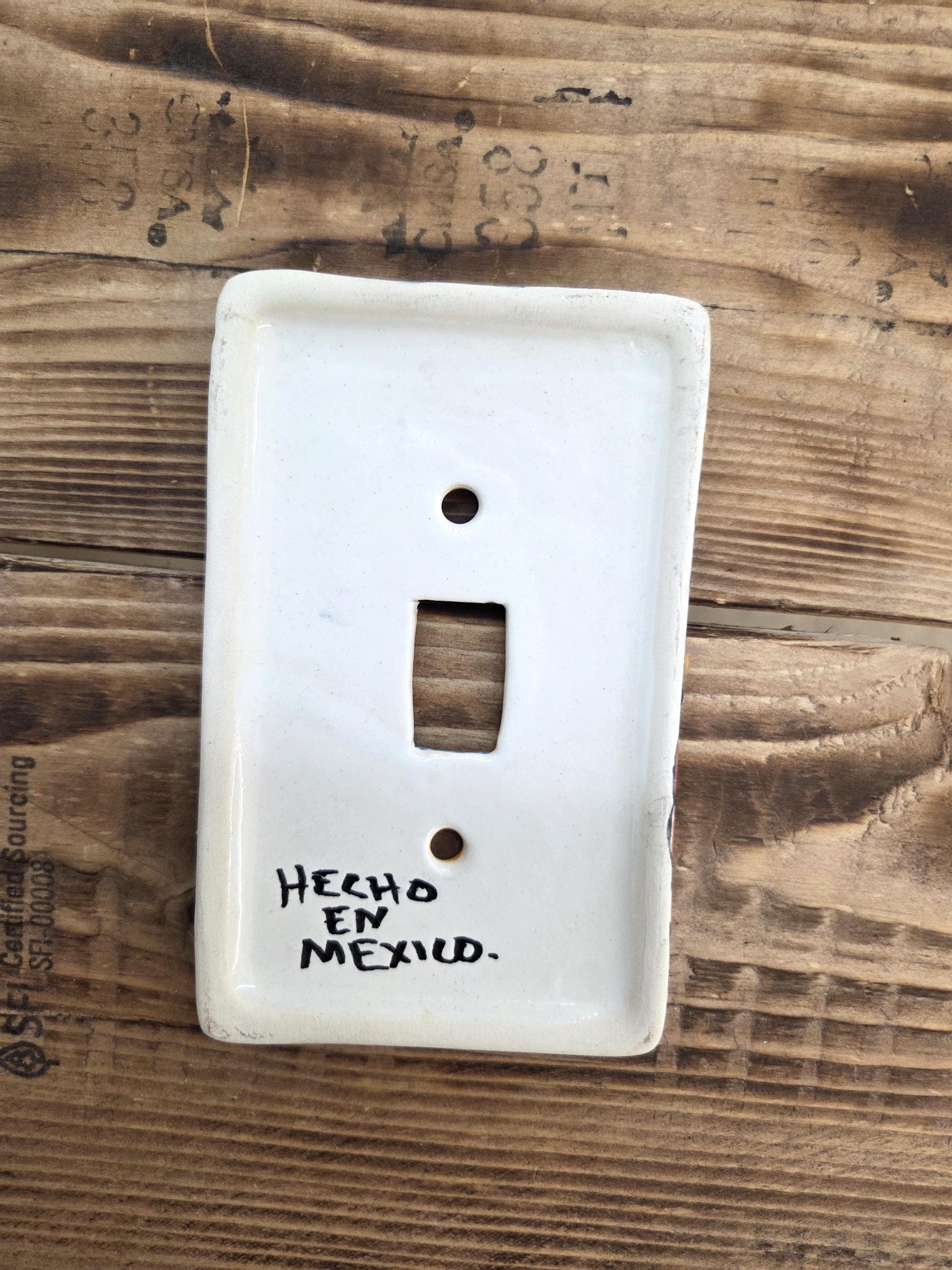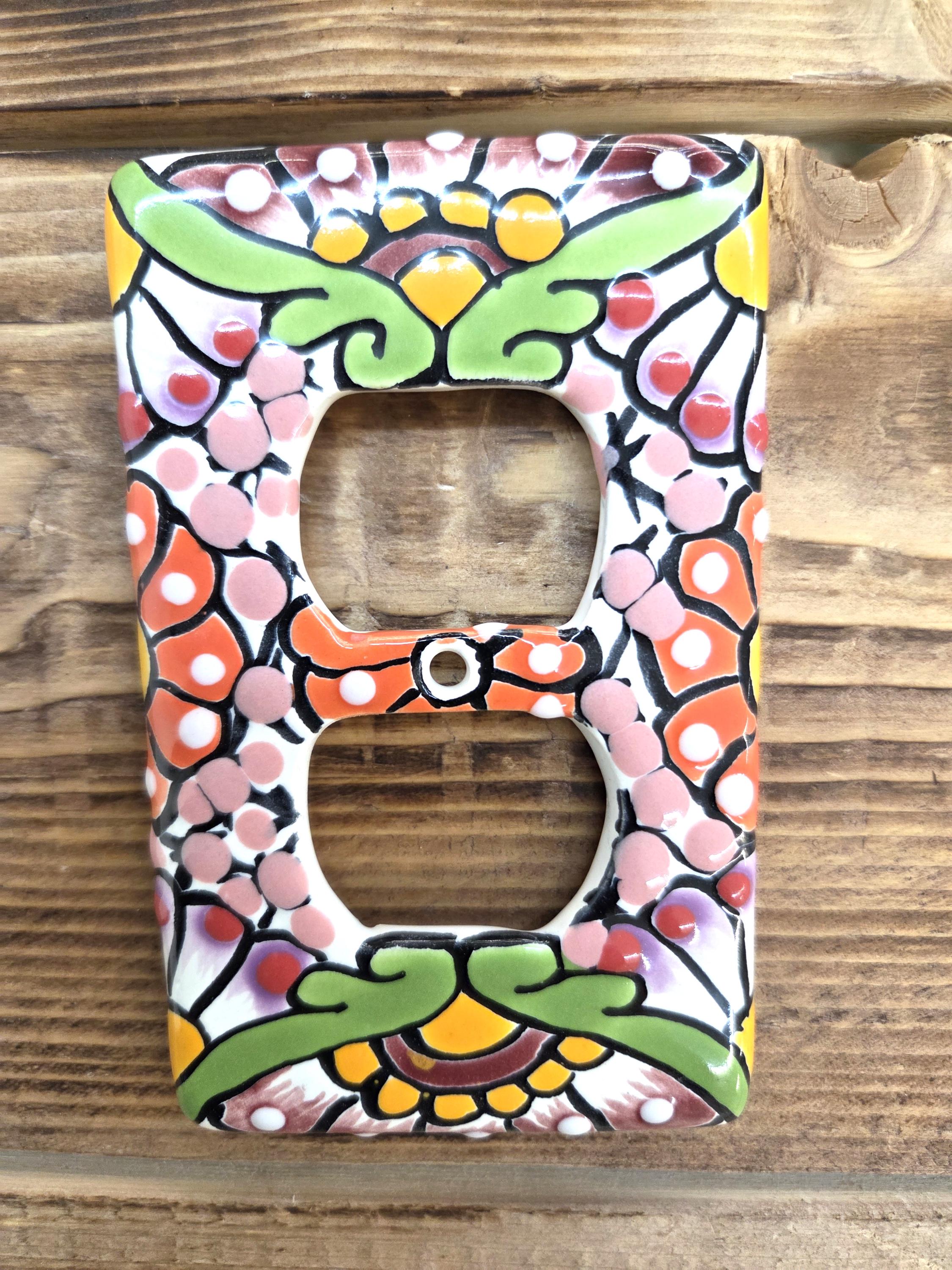 Handmade and hand‑painted by skilled Mexican artisans, this authentic Talavera 2‑gang electric outlet cover is crafted from real ceramic pottery—not a plastic or stick‑on imitation—and you will receive the exact piece shown in the photos. Each cover is individually shaped and painted, so natural variations and small imperfections are part of its charm and proof of true craftsmanship, resulting in a vibrant, beautifully detailed piece that adds character to any room. Because it is genuine ceramic, avoid overtightening the screws from your old plate to prevent cracking and ensure your new Talavera cover stays secure and stunning for years to come.