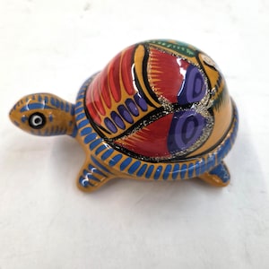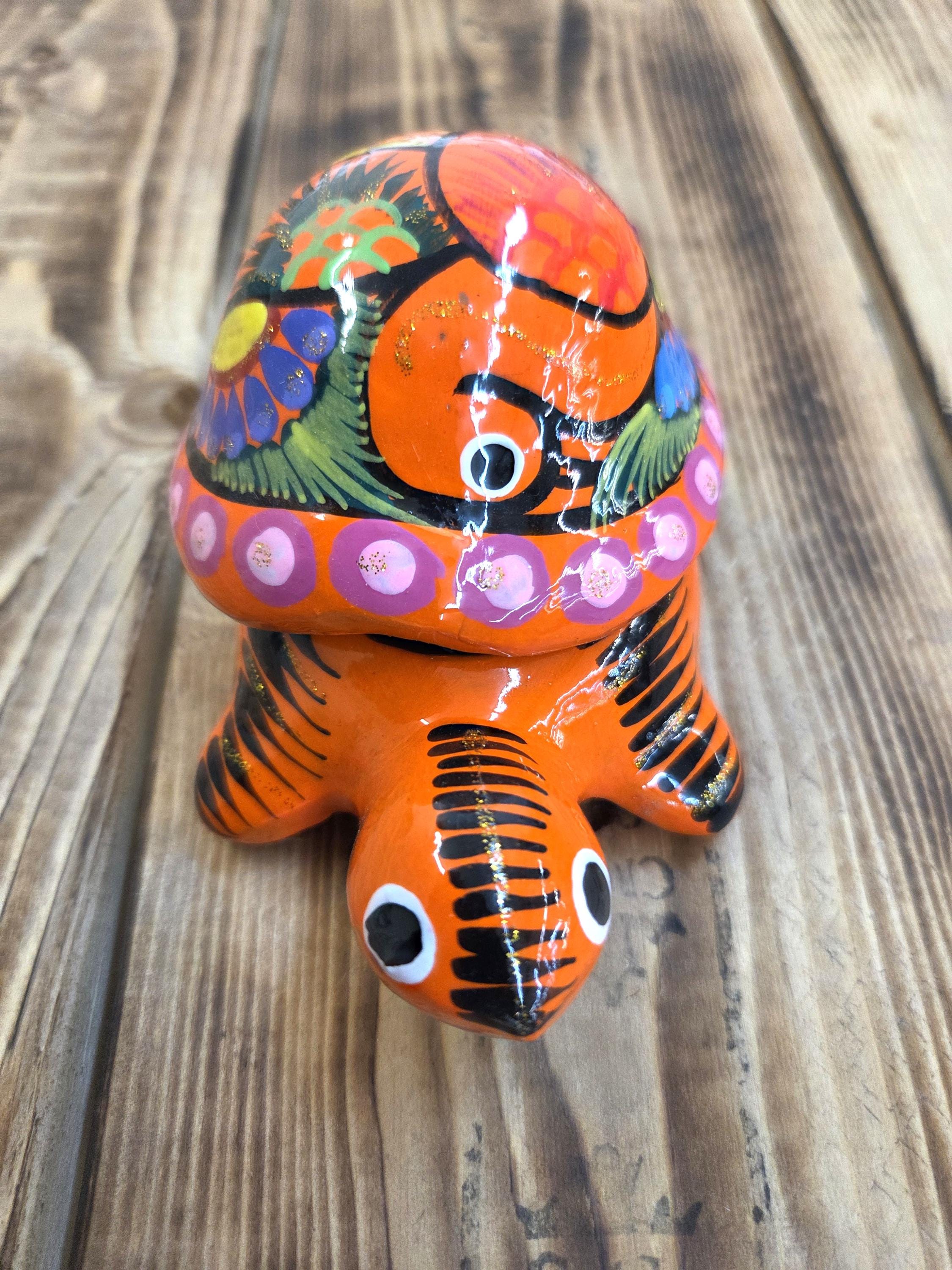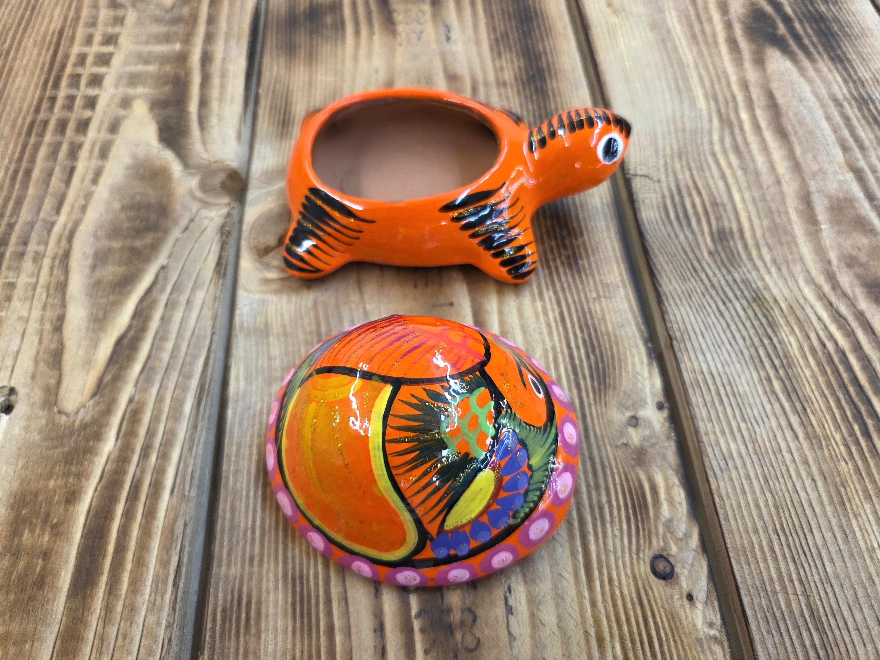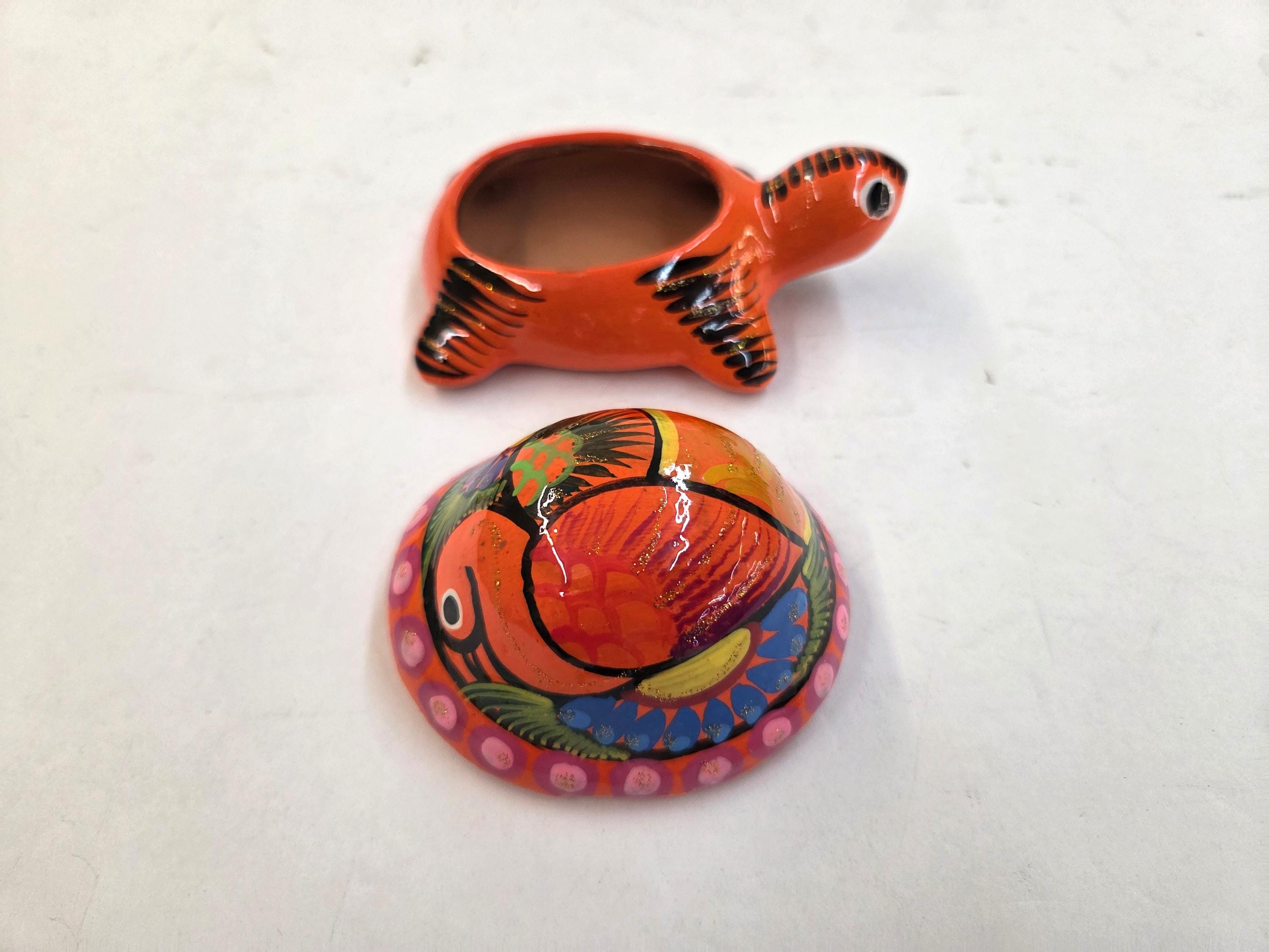Handmade Ceramic Turtle Stash & Jewelry Box This hand‑painted ceramic turtle container is crafted by skilled artisans in Mexico, bringing together vibrant color, playful charm, and traditional craftsmanship. Each piece is shaped and painted by hand, giving it a one‑of‑a‑kind personality with small variations that make your box truly unique. Size is roughly 4.75" long by 3" tall.